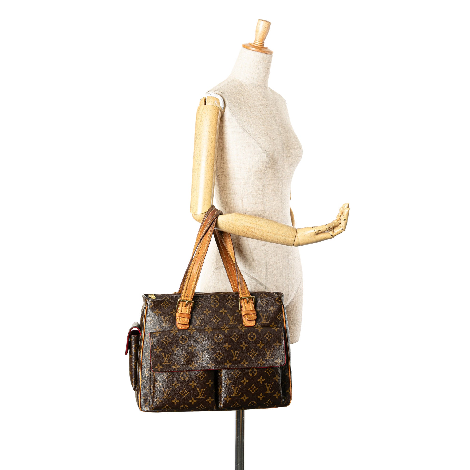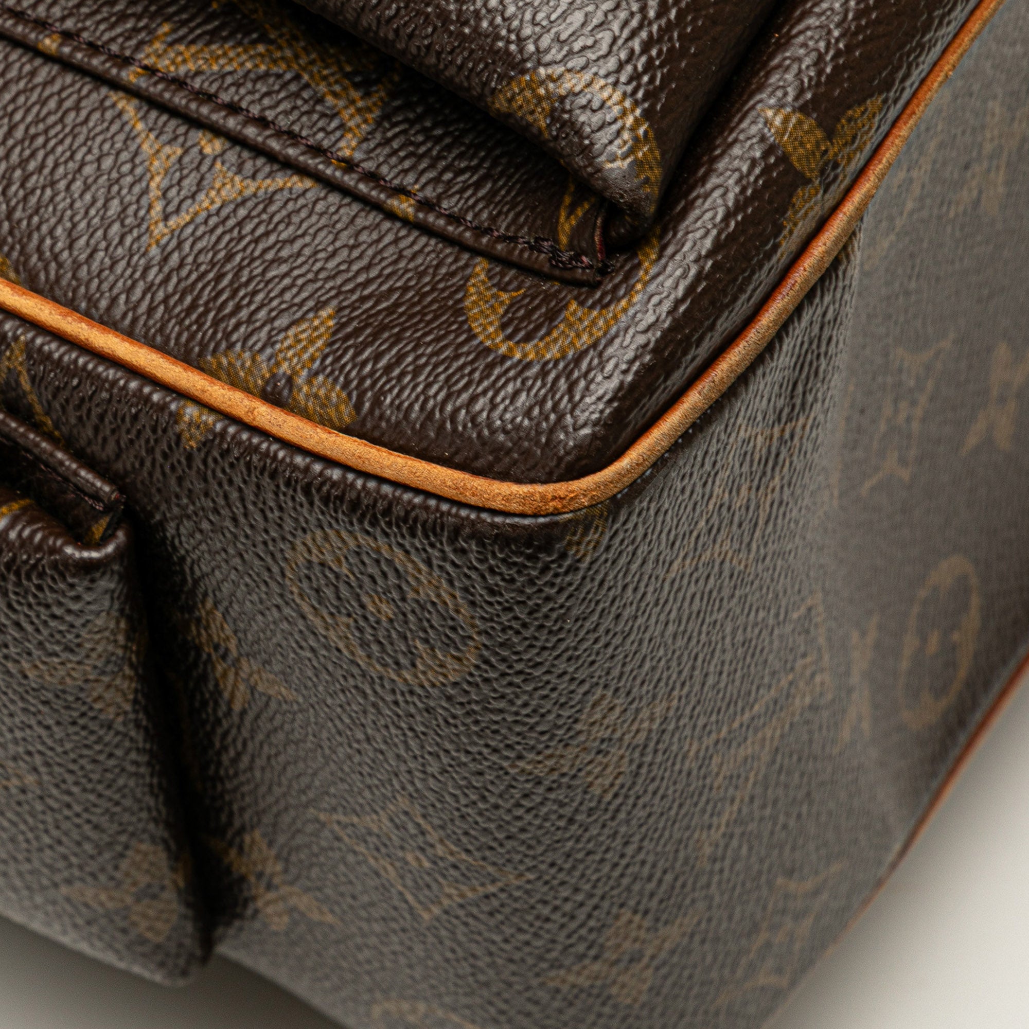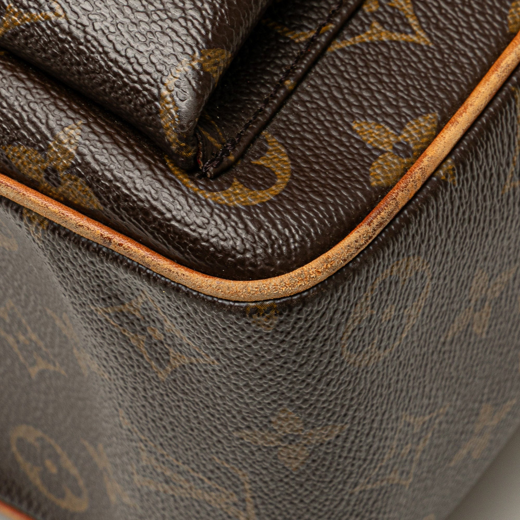 The Multipli-Cite features a monogram canvas body with vachetta leather trim, flat vachetta leather straps, exterior flap pockets, a top zip closure, and an interior flat pocket. Inclusion: Dust bag. Retail Price: 1670.00