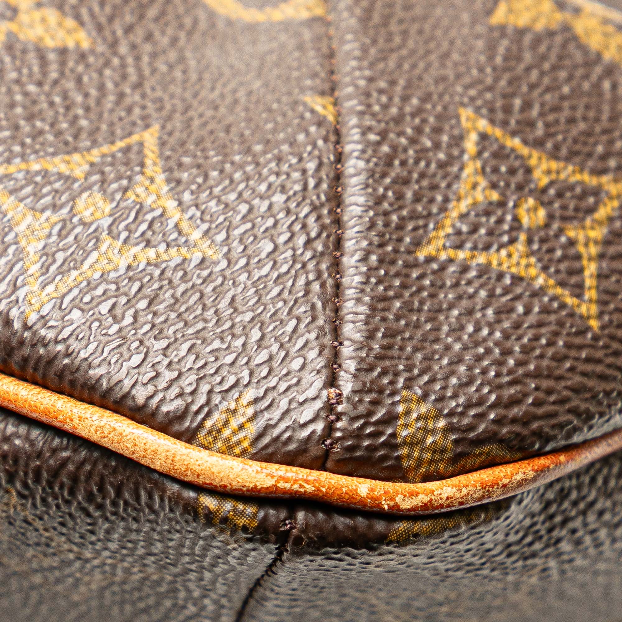 The Musette Salsa features a monogram canvas body with vachetta leather trim, an adjustable flat vachetta leather shoulder strap, a front flap with a magnetic snap closure, and an interior slip pocket. Retail Price: 1080.00