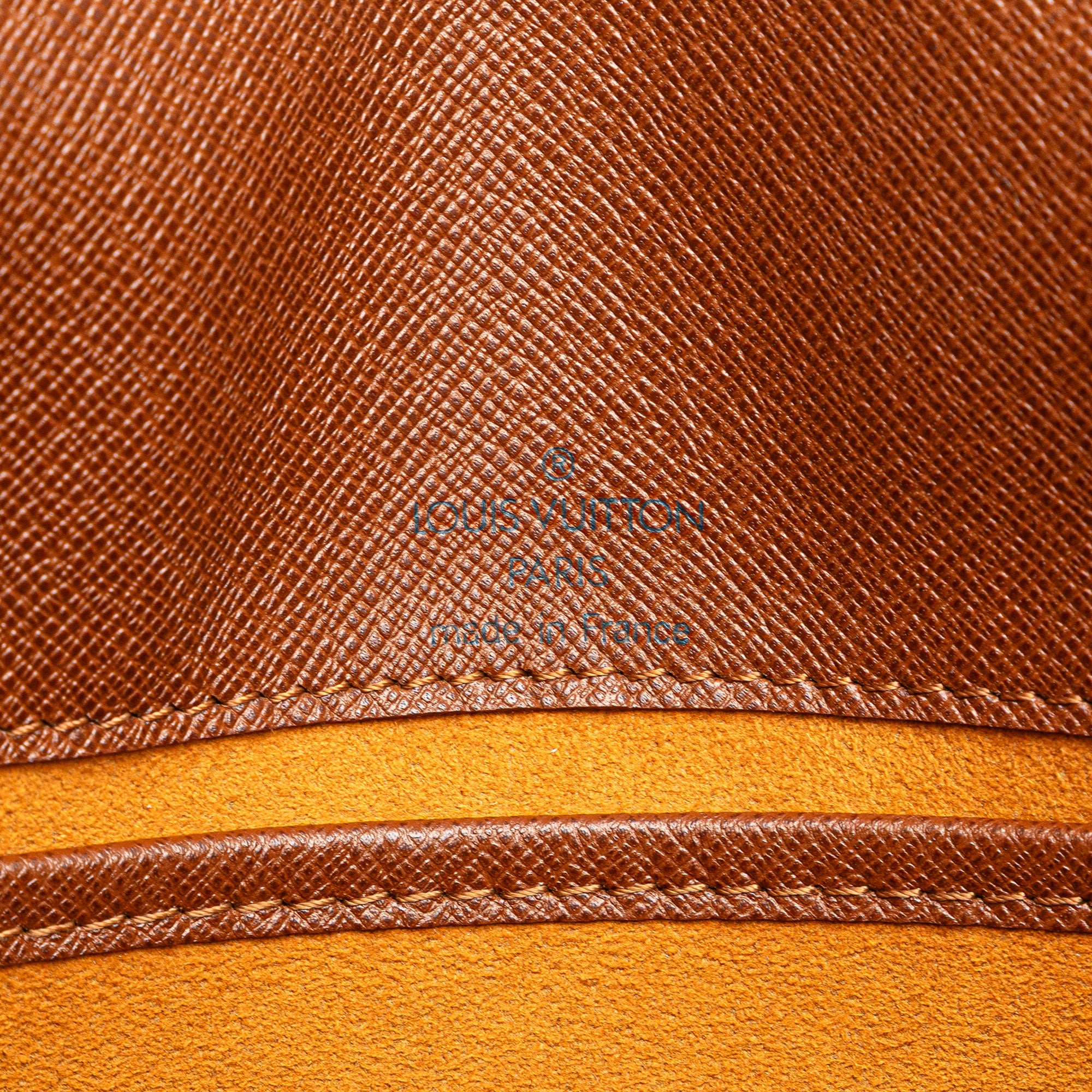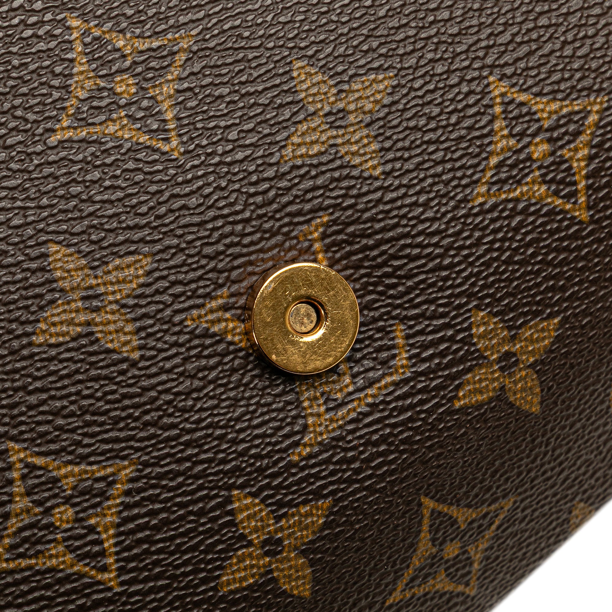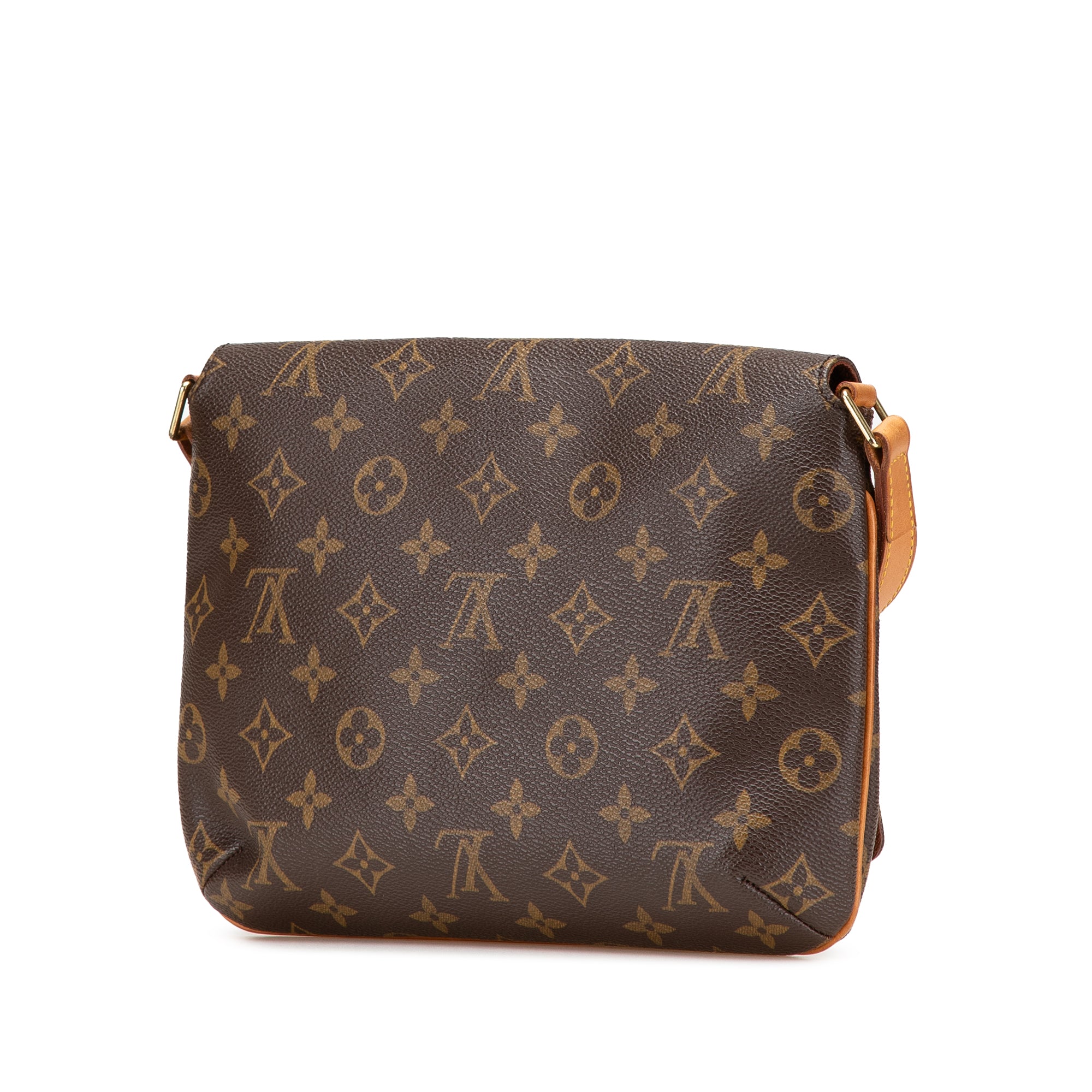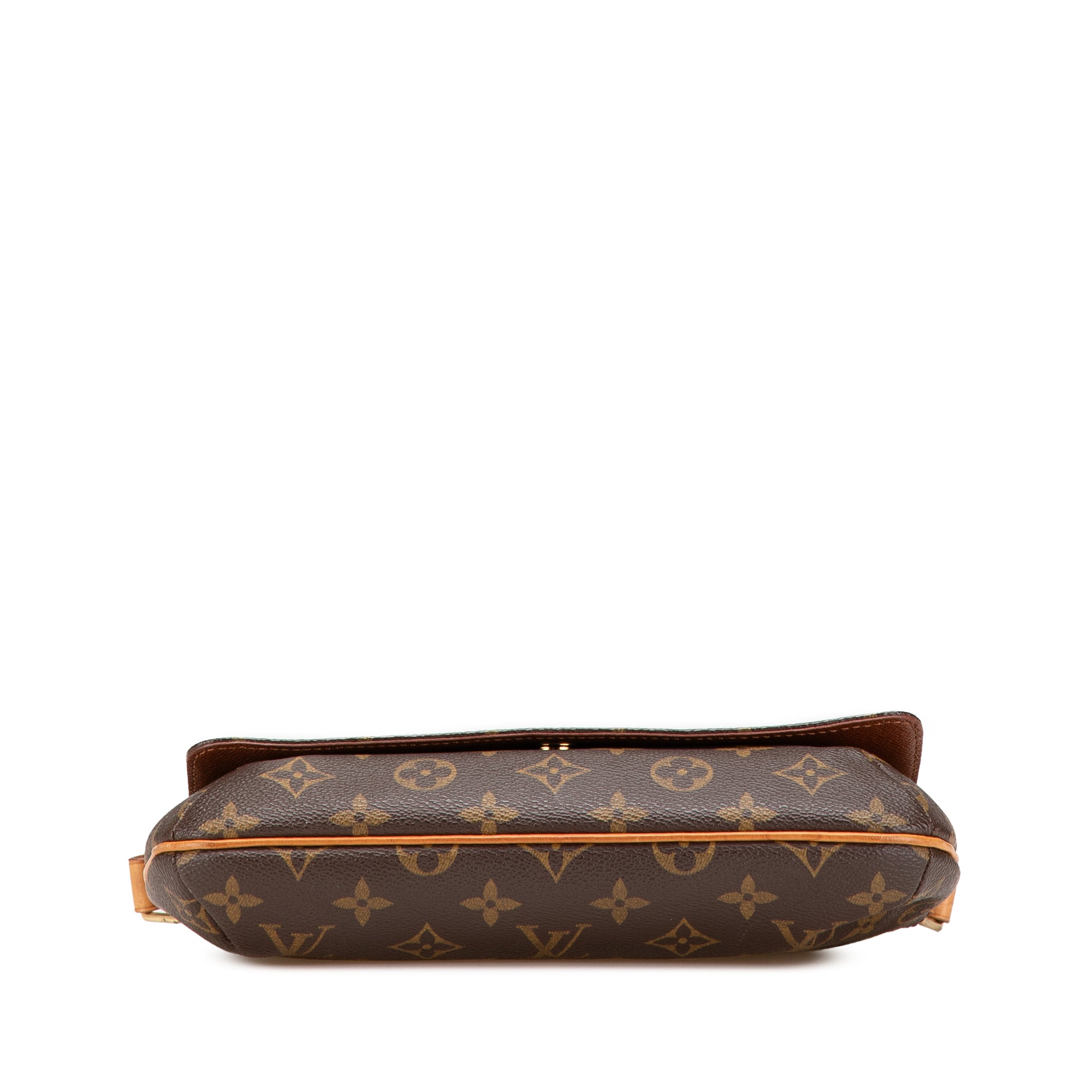 The Musette Tango features a monogram canvas body, a flat vachetta leather shoulder strap, a front flap with a magnetic closure, and an interior slip pocket. Retail Price: 830.00