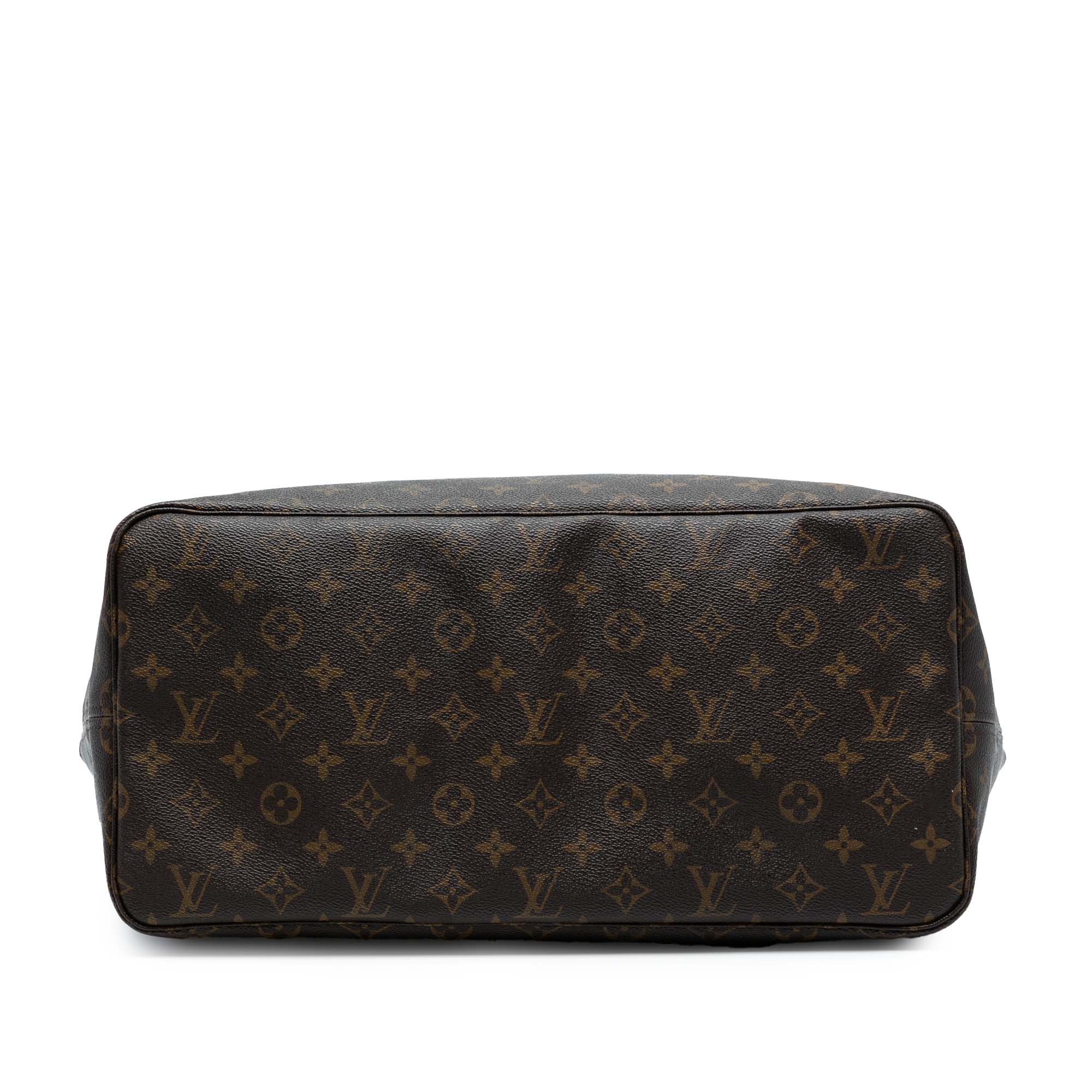 The Neverfull GM features a monogram canvas body with vachetta leather trim, flat vachetta leather handles, an open top with lobster clasp closure, and an interior zip pocket. Retail Price: 1825.00