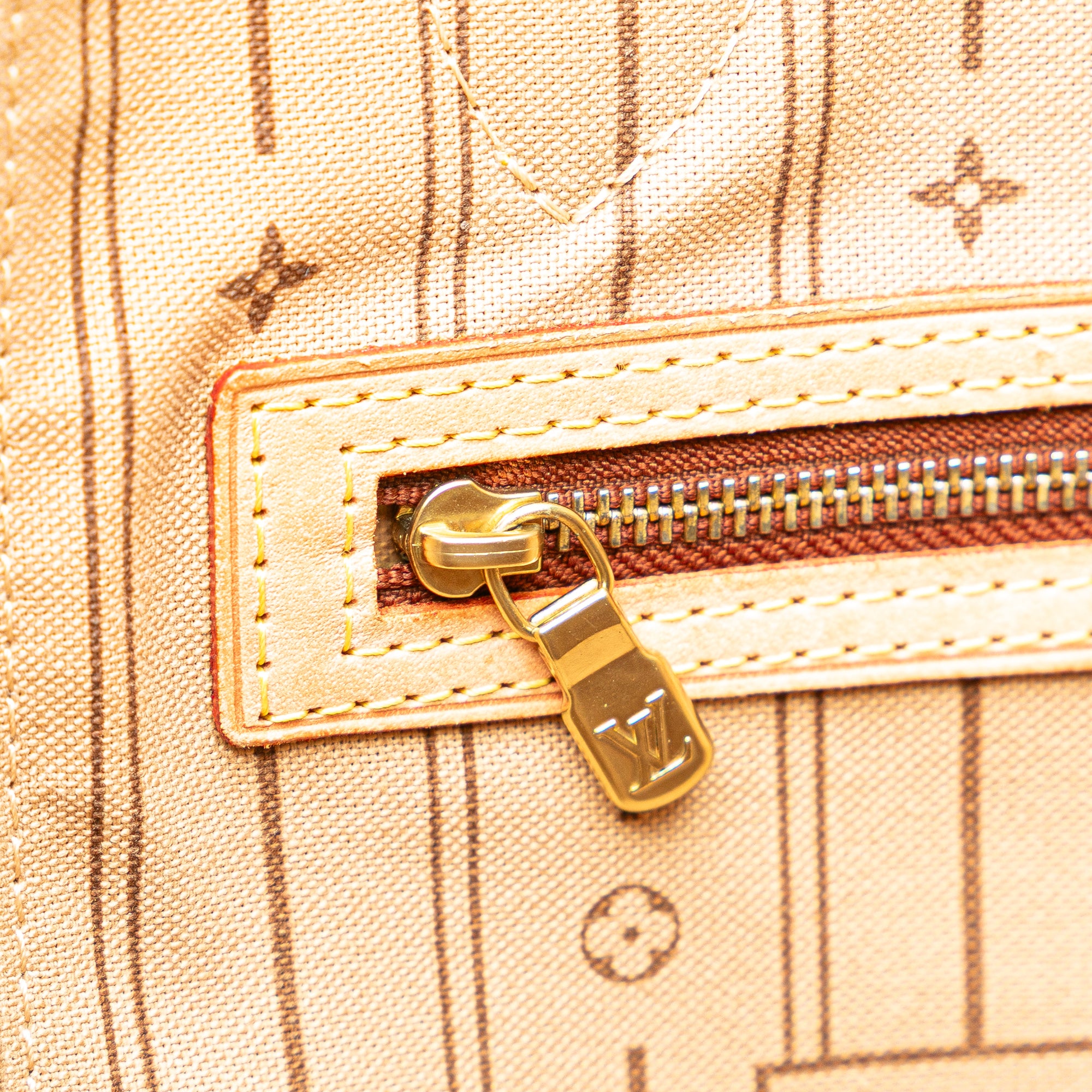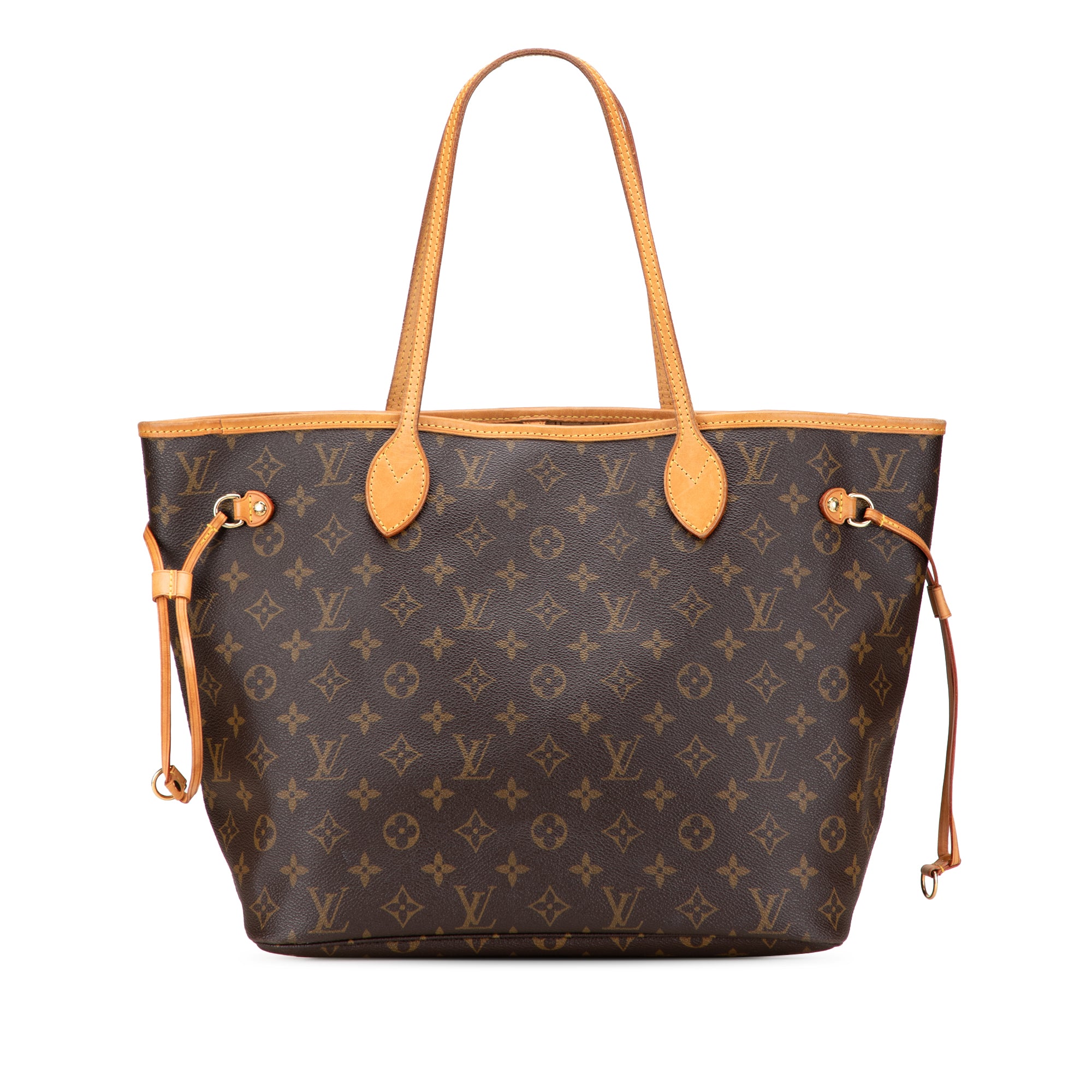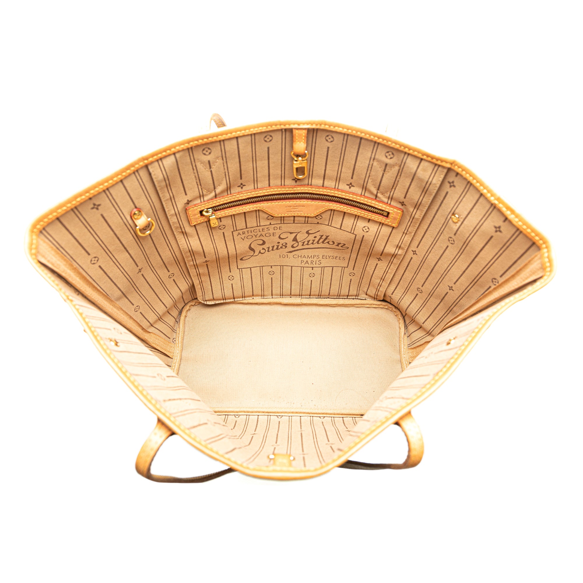 The Neverfull MM features a monogram canvas body with vachetta leather trim, flat vachetta leather top handles, an open top with lobster claw clasp closure, and an interior zip pocket. Retail Price: 2030.00