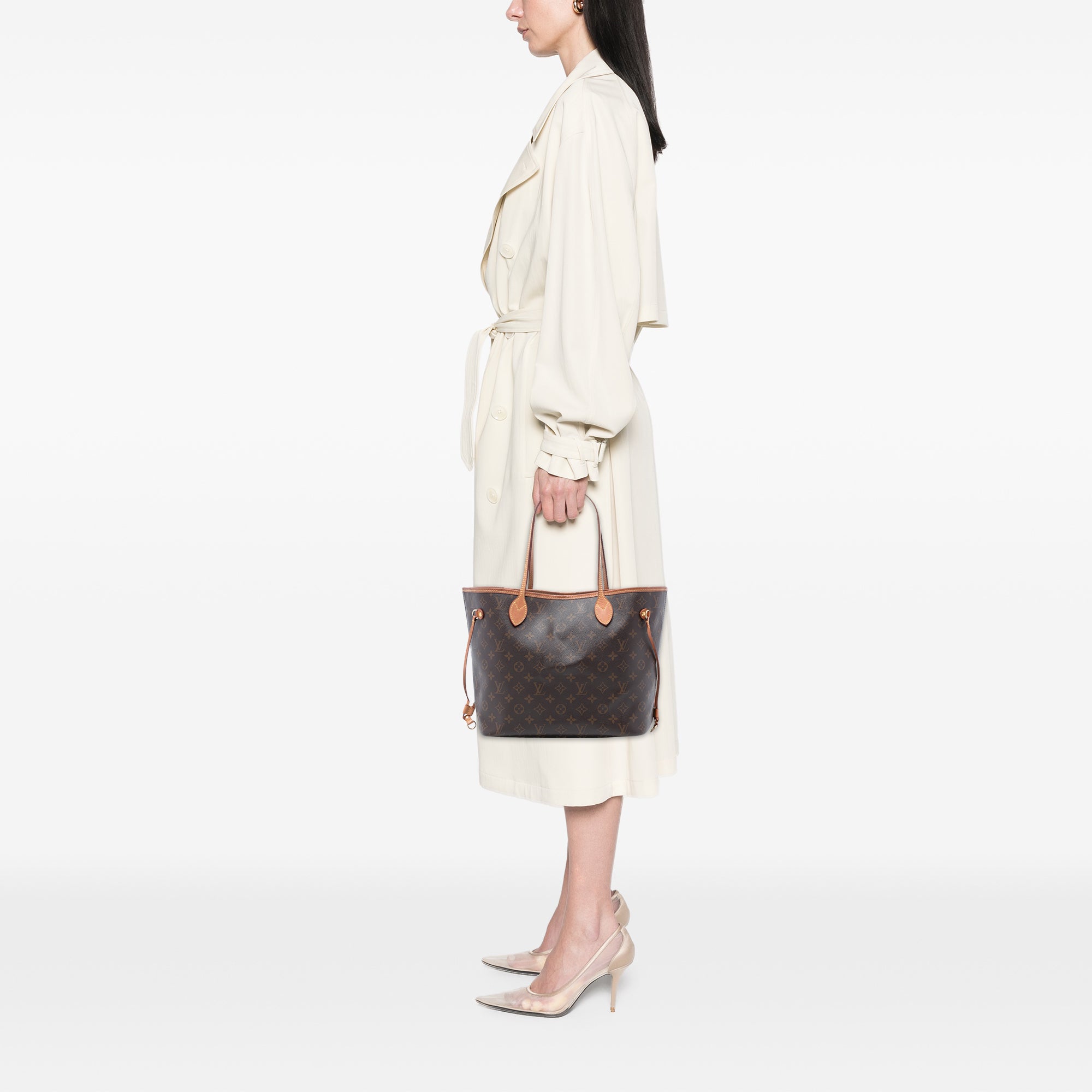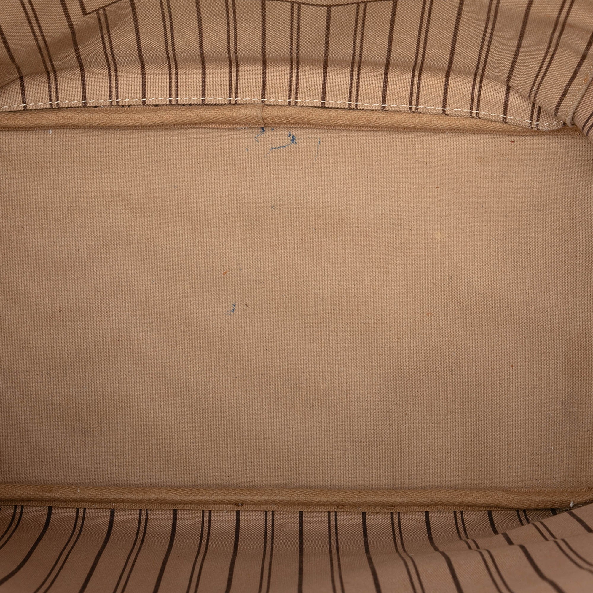 The Neverfull MM features a monogram canvas body with vachetta leather trim, flat vachetta leather handles, an open top with lobster clasp closure, and an interior zip pocket. Retail Price: 2030.00