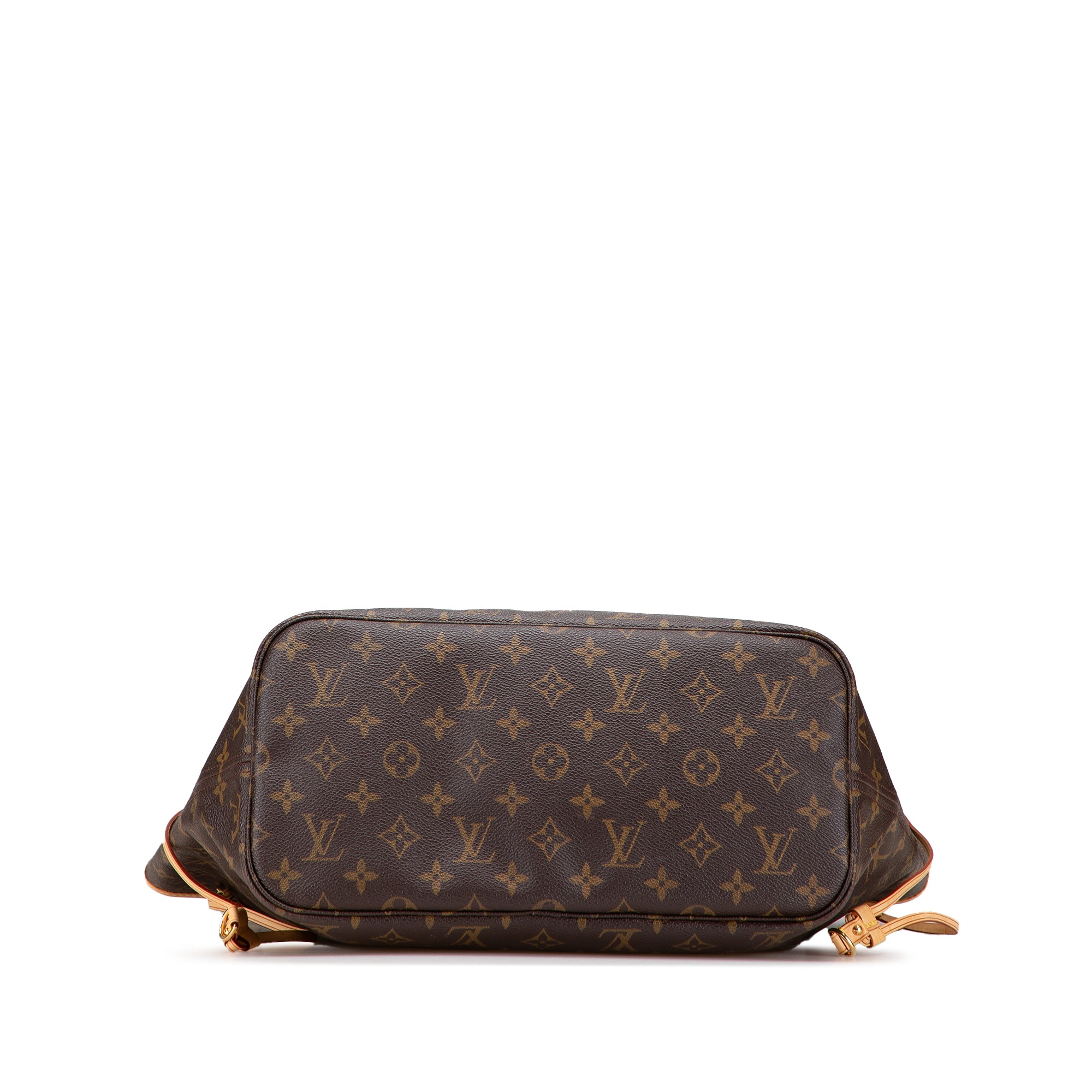 The Neverfull MM features a monogram canvas body with vachetta leather trim, flat vachetta leather handles, an open top with a lobster clasp closure, and an interior zip pocket. Inclusion: Dust bag. Retail Price: 2030.00