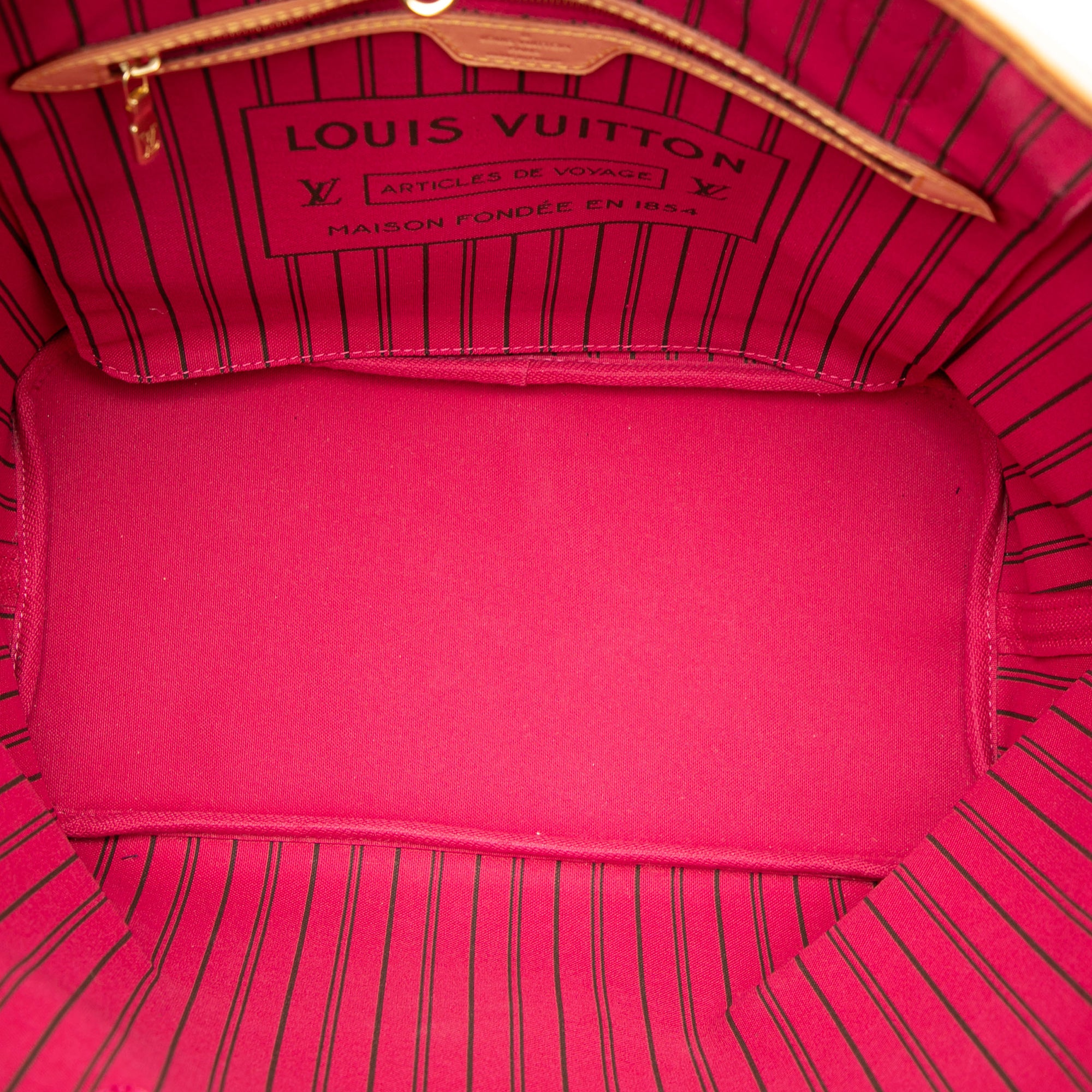 The Neverfull MM features a monogram canvas body with vachetta leather trim, flat vachetta leather straps, an open top with lobster clasp closure, and an interior zip pocket. Retail Price: 2030.00