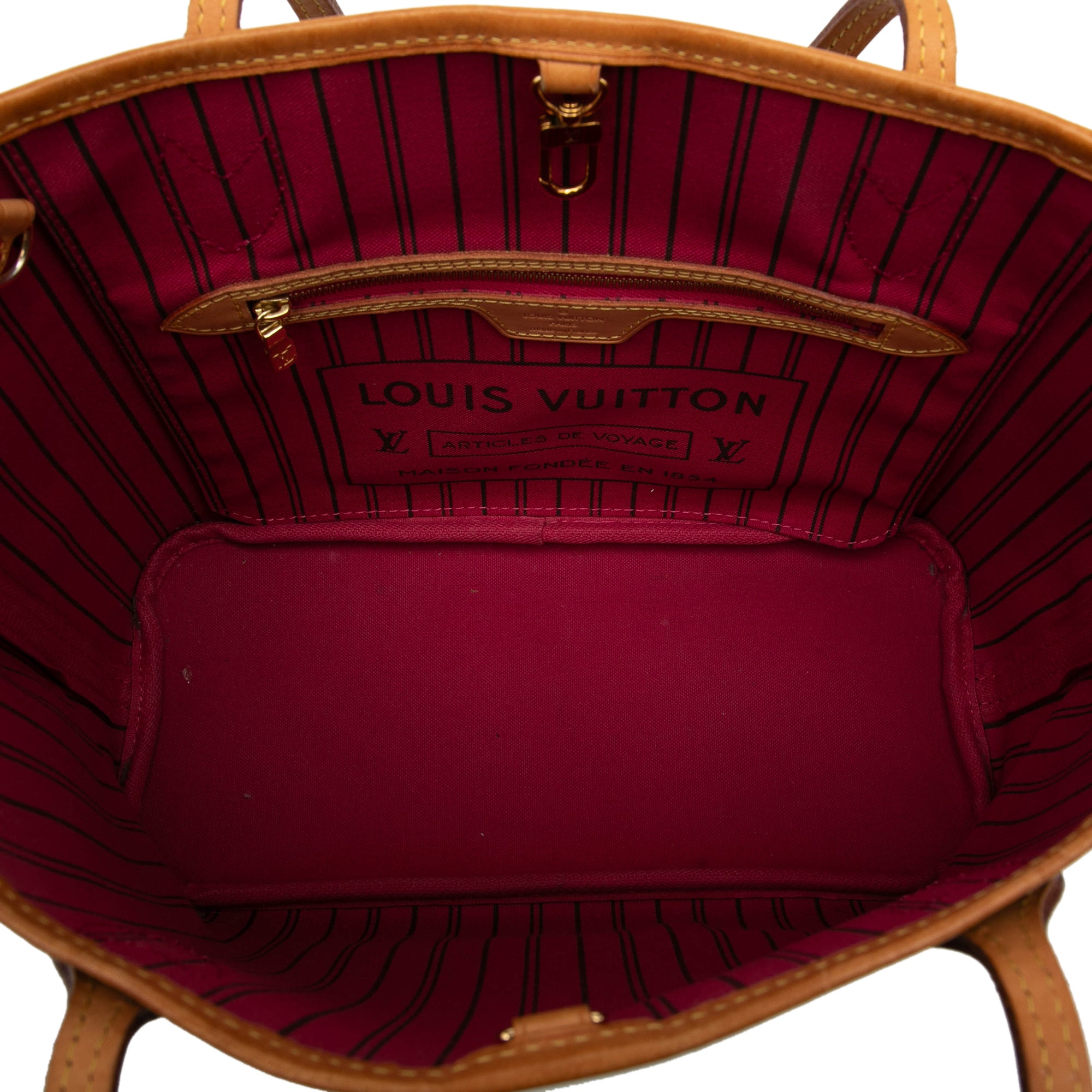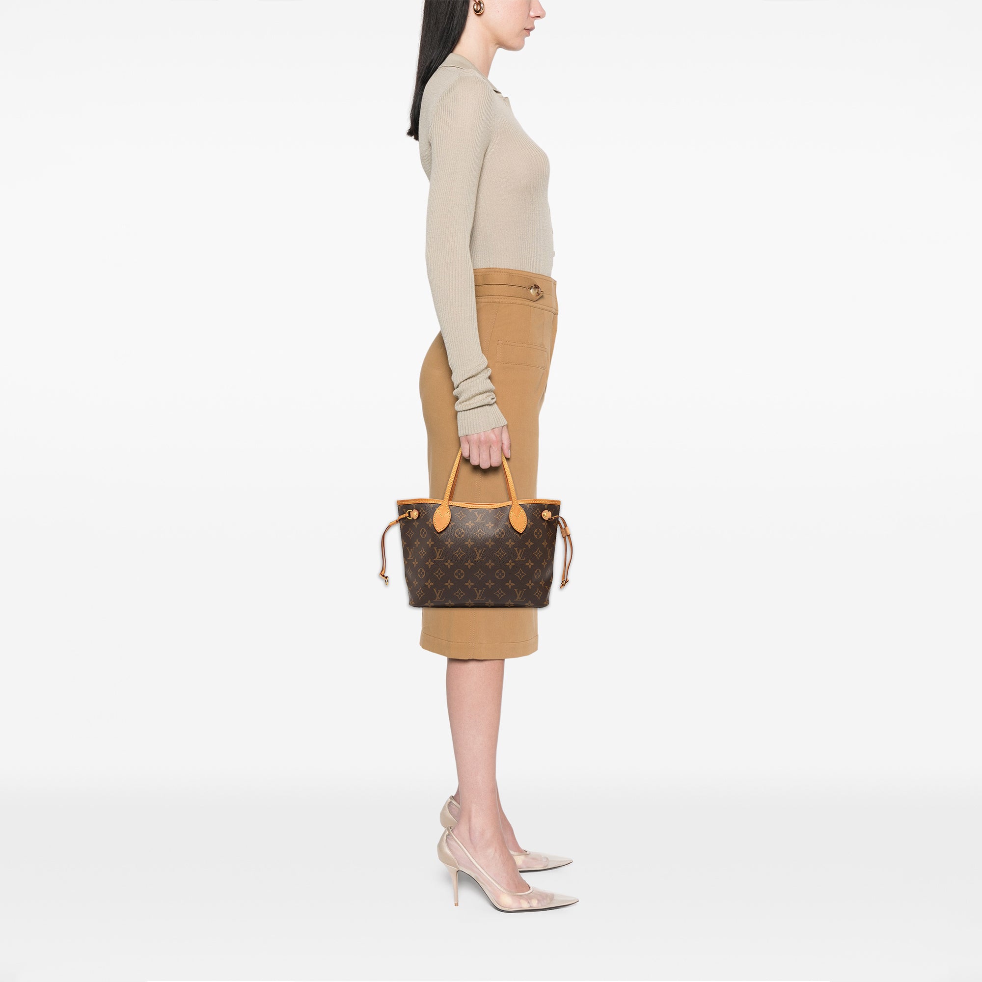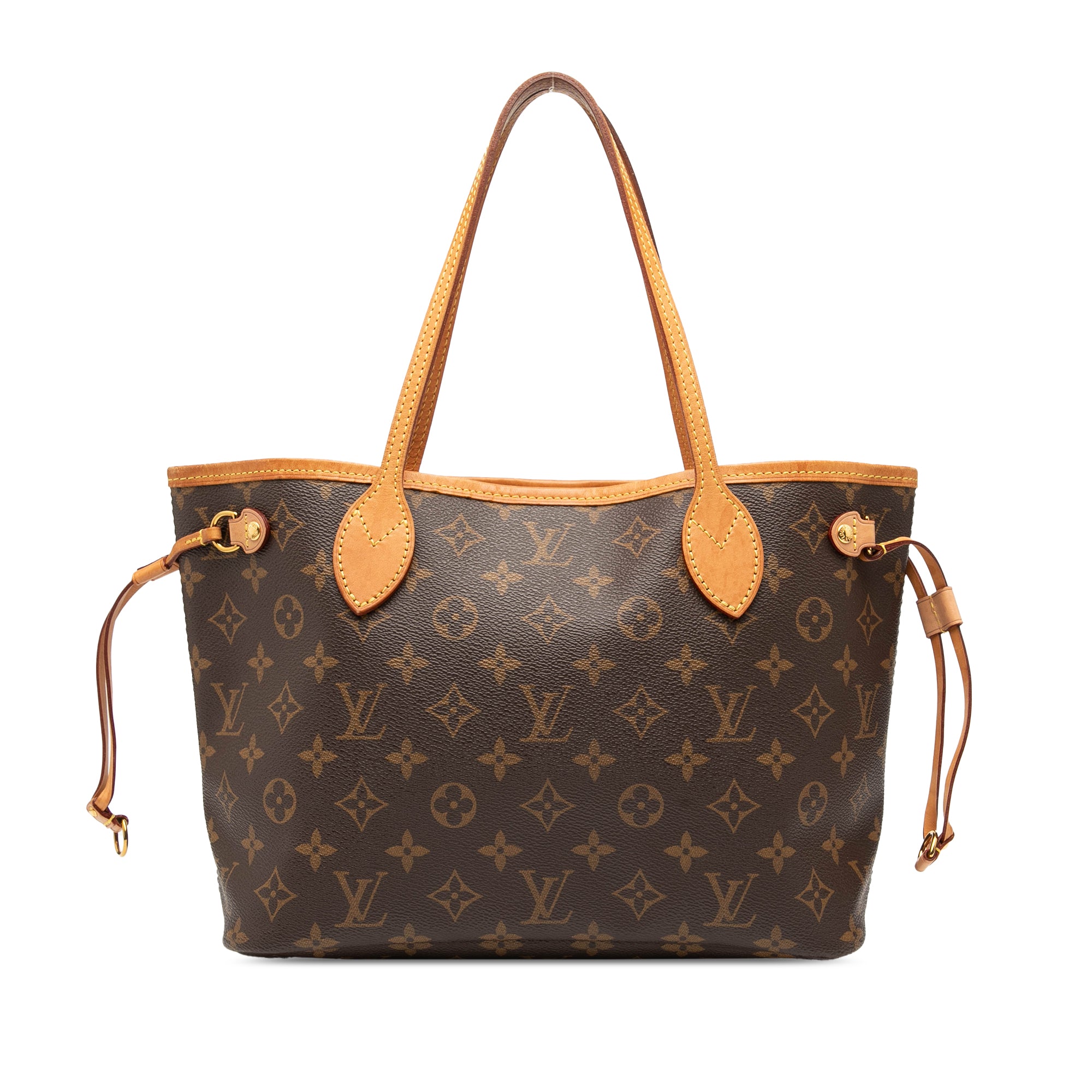 The Neverfull PM features a monogram canvas body with vachetta leather trim, flat vachetta leather handles, an open top with a lobster clasp closure, and an interior zip pocket. Retail Price: 1960.00