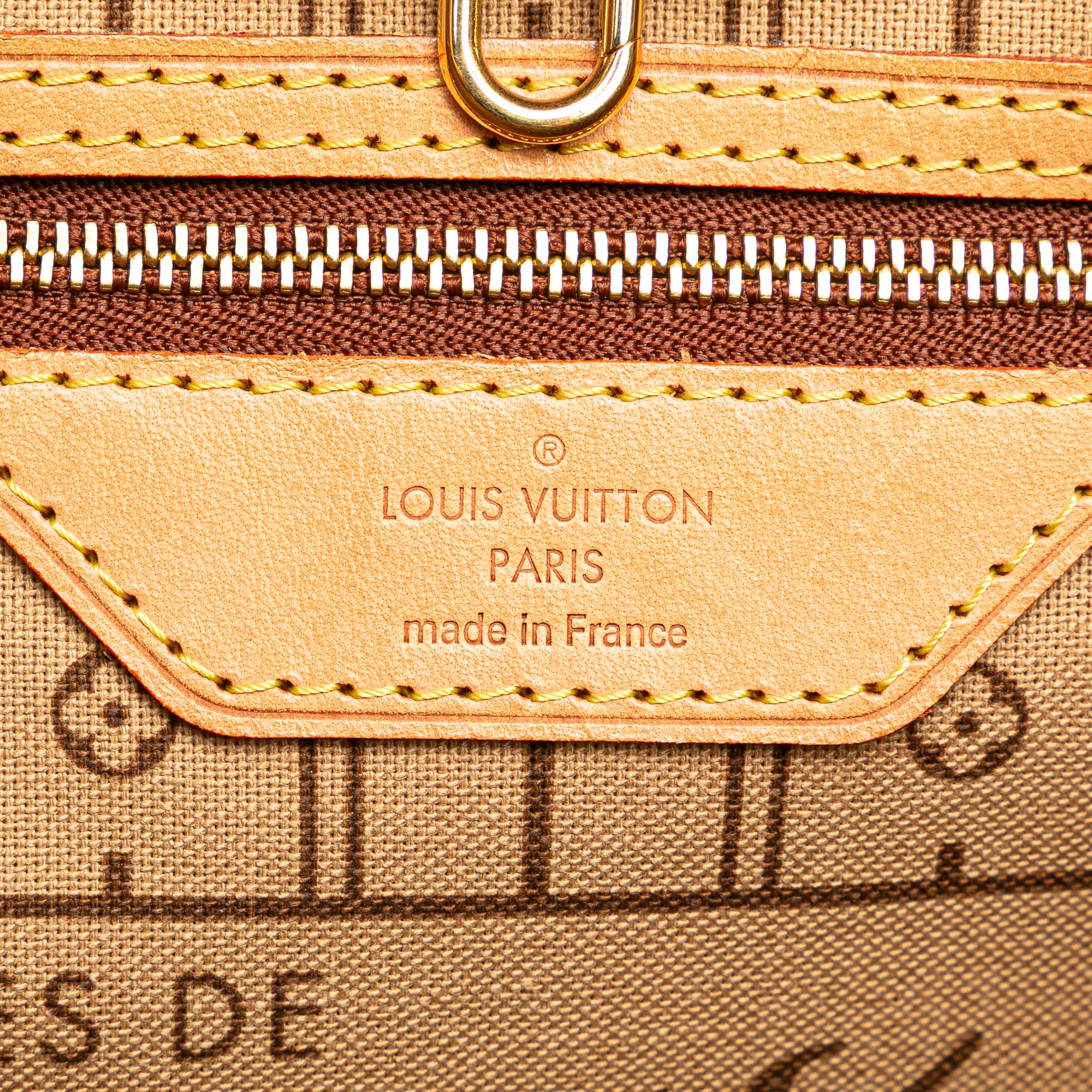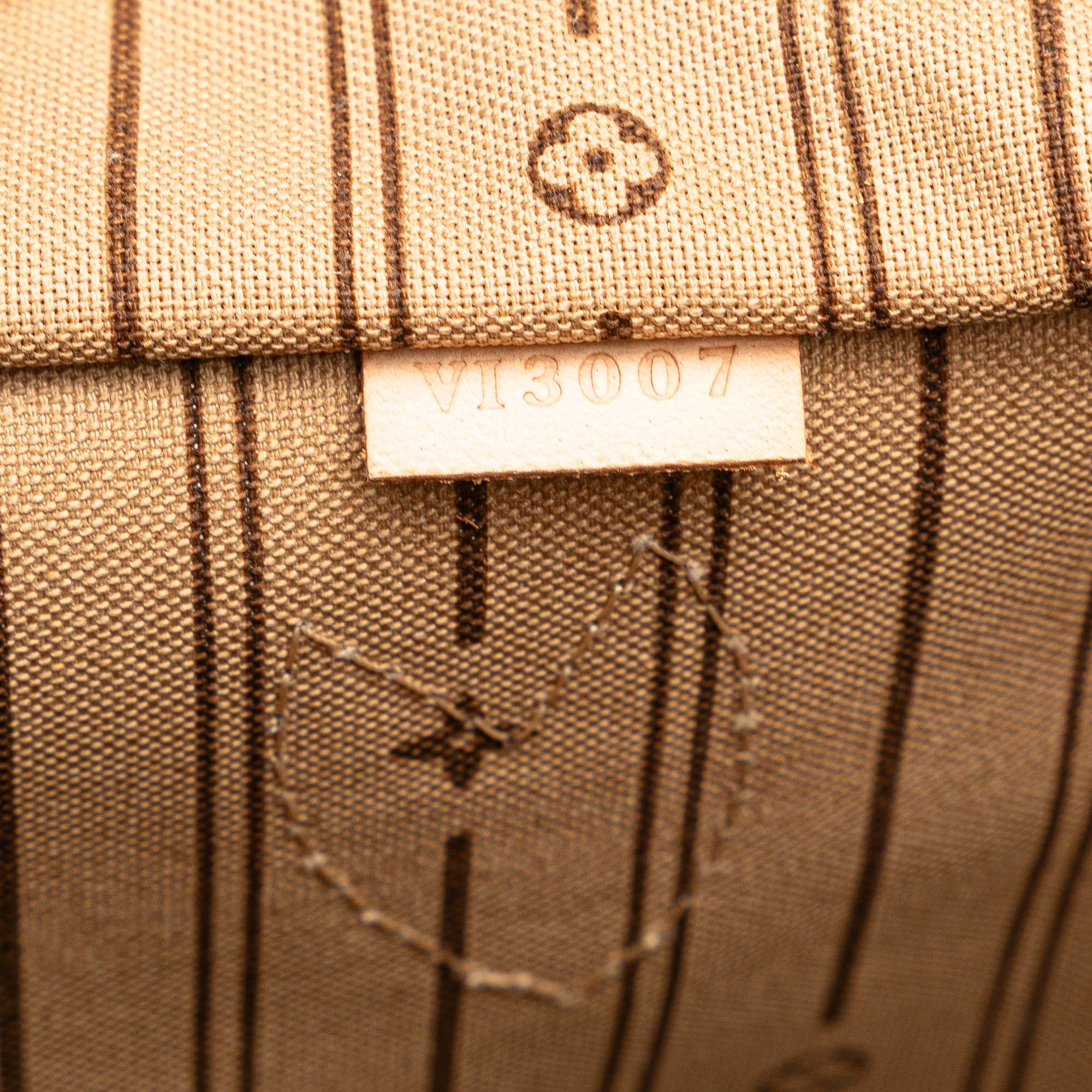 The Neverfull PM features a monogram canvas body with vachetta leather trim, flat vachetta leather handles, an open top with a lobster clasp closure, and an interior zip pocket. Retail Price: 1960.00