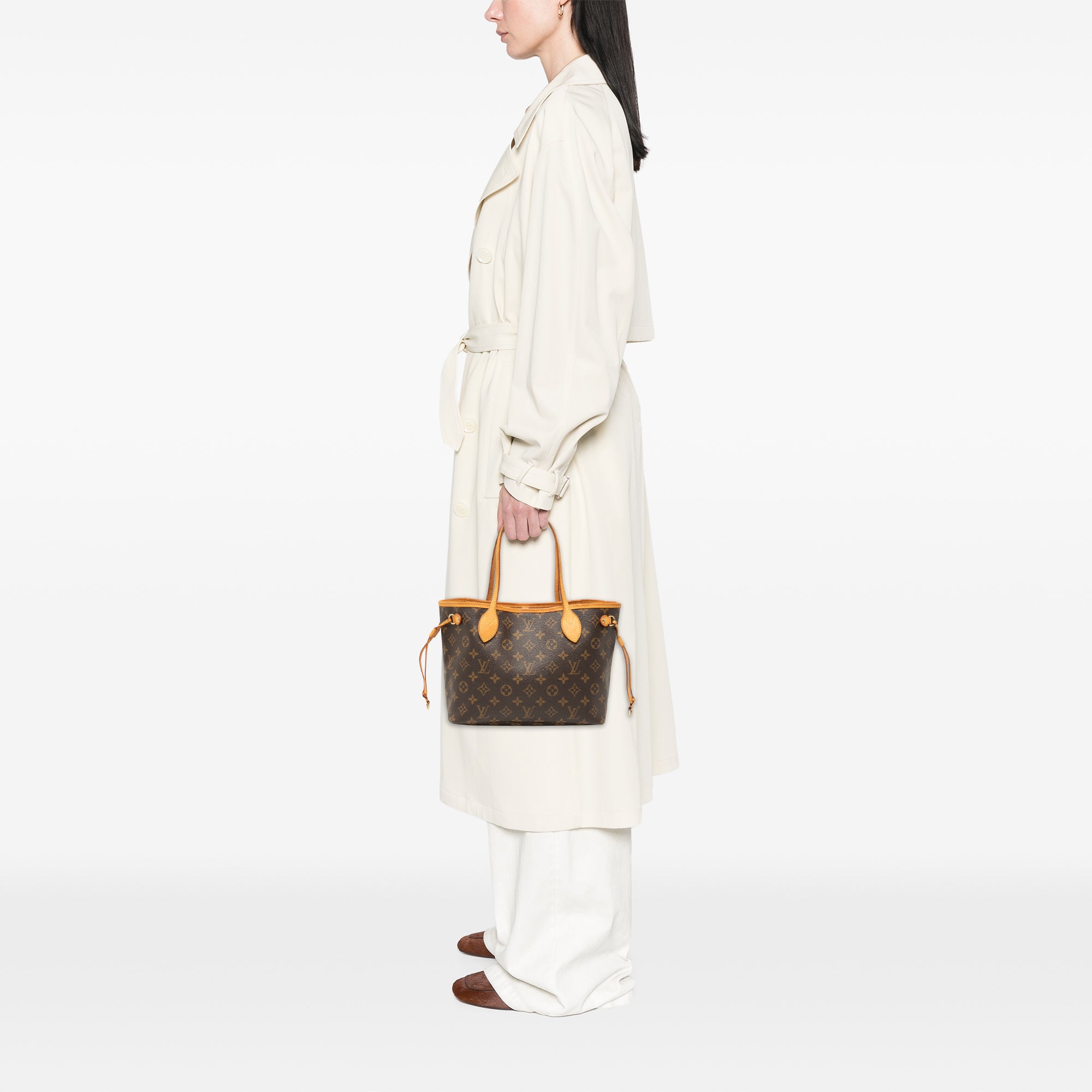 The Neverfull PM features a monogram canvas body with vachetta leather trim, flat vachetta leather handles, an open top with a lobster clasp closure, and an interior zip pocket. Retail Price: 1960.00