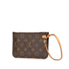 This pouch features a monogram canvas body, a flat vachetta leather wrist strap, a top zip closure, and an interior slip pocket. Retail Price: 850.00