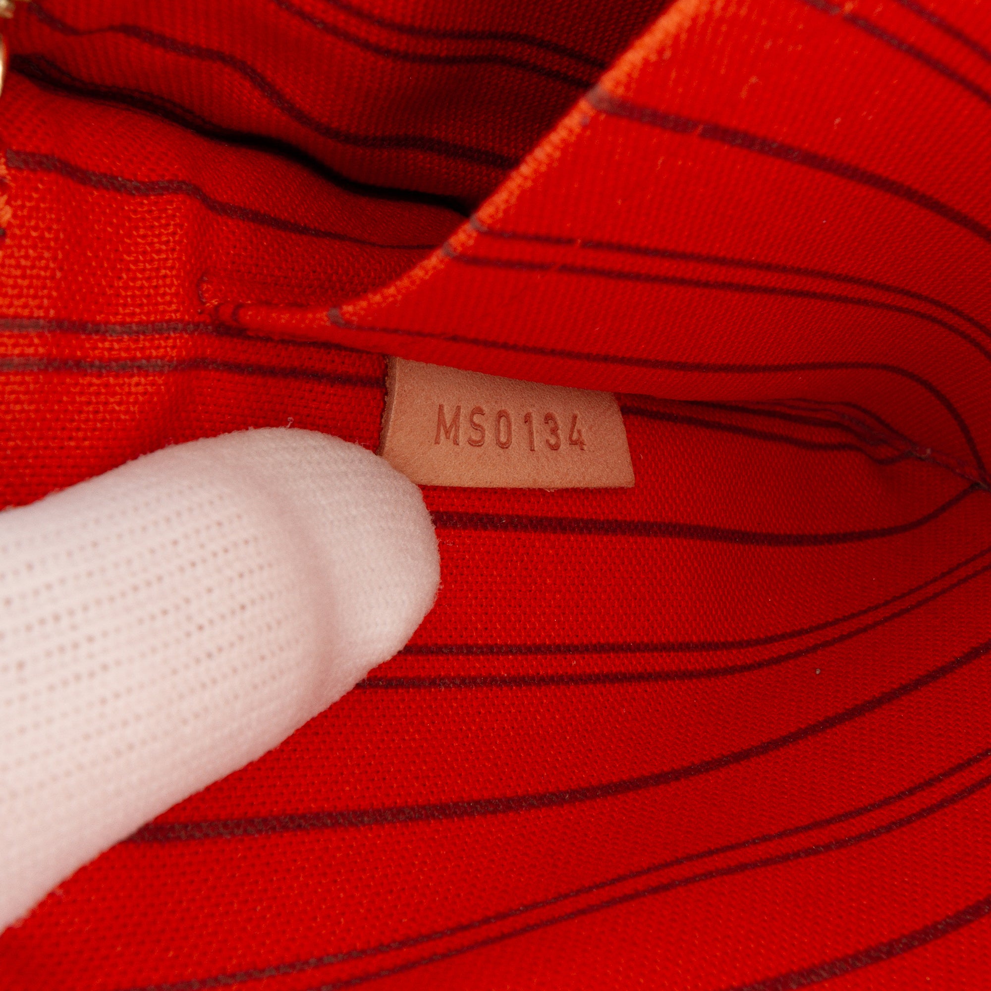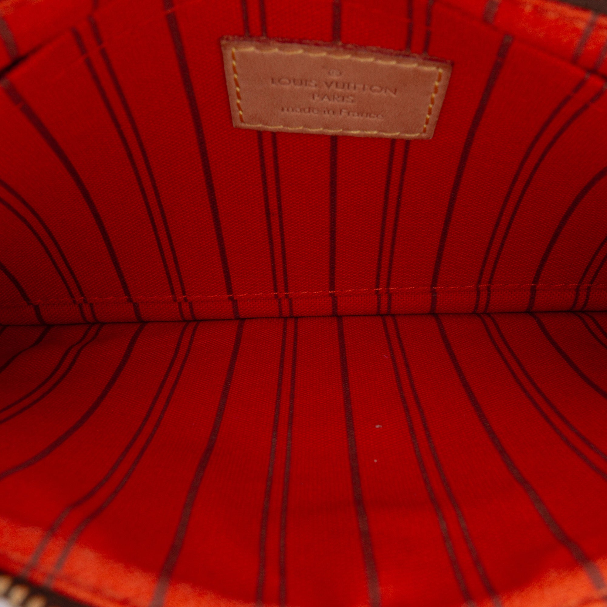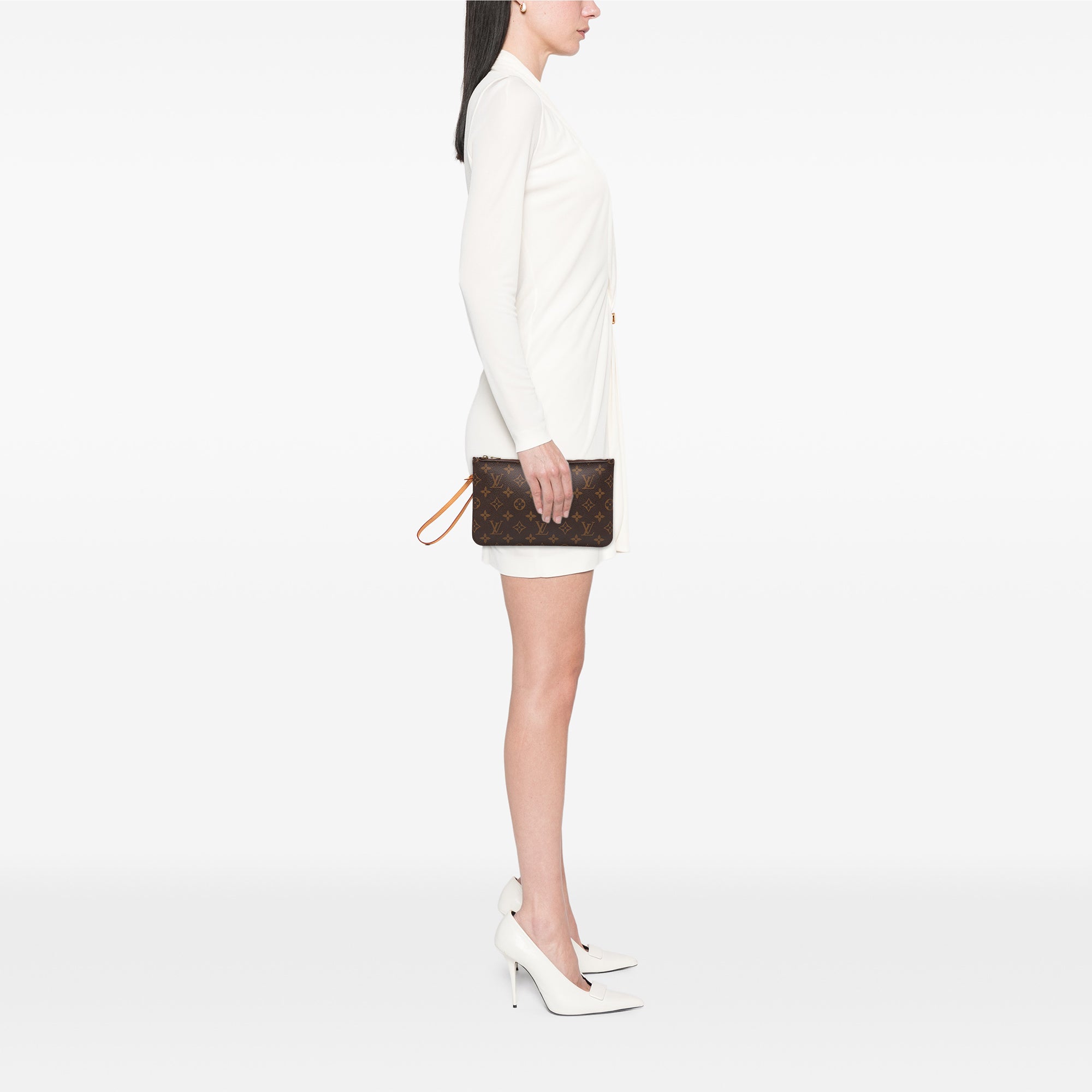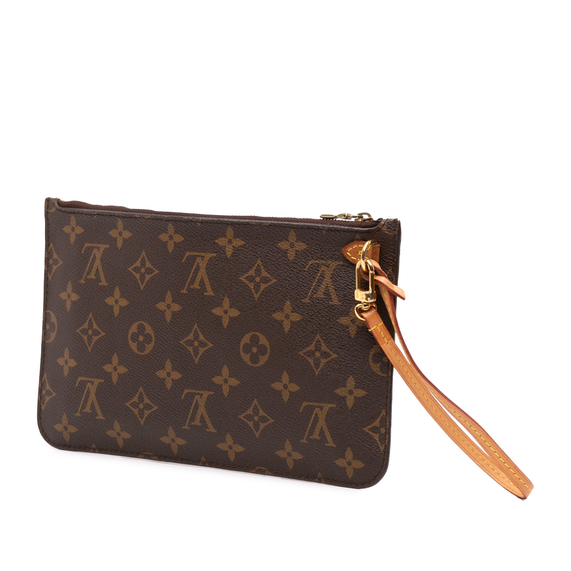 The Neverfull Pouch features a monogram canvas body, a detachable flat vachetta leather wrist strap, a top zip closure, and an interior slip pocket. Retail Price: 780.00