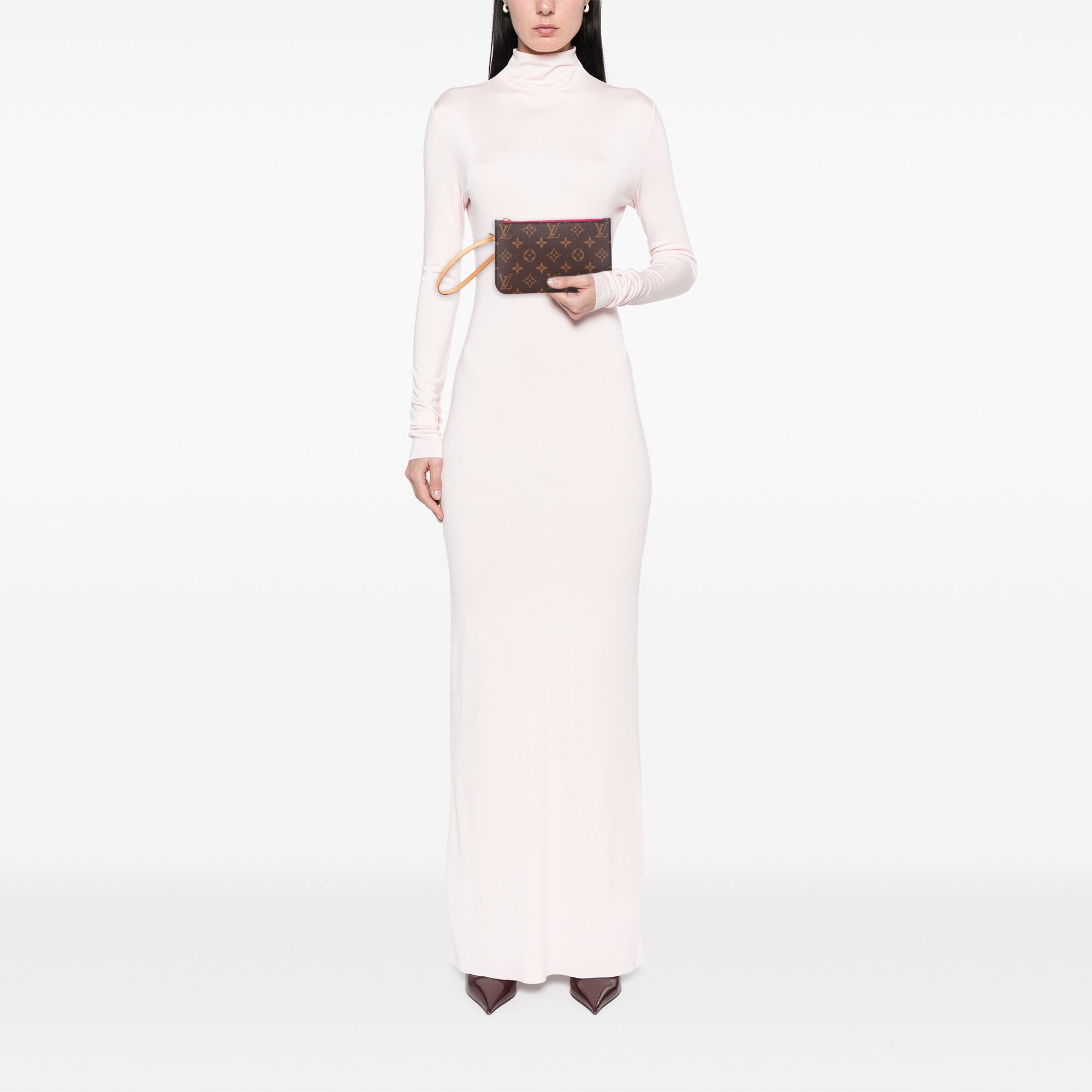 The Neverfull pouch features a monogram canvas body, a flat vachetta leather strap, a top zip closure, and an interior slip pocket. Retail Price: 900.00