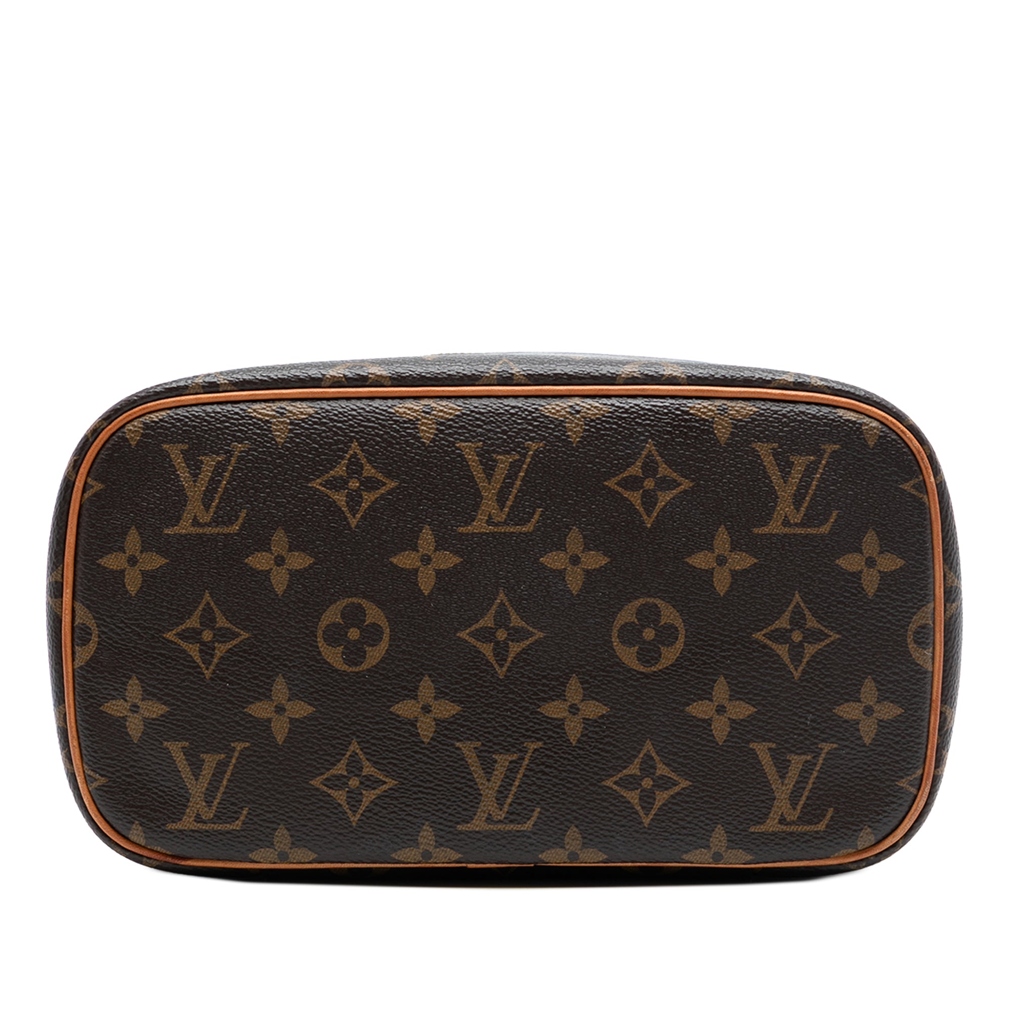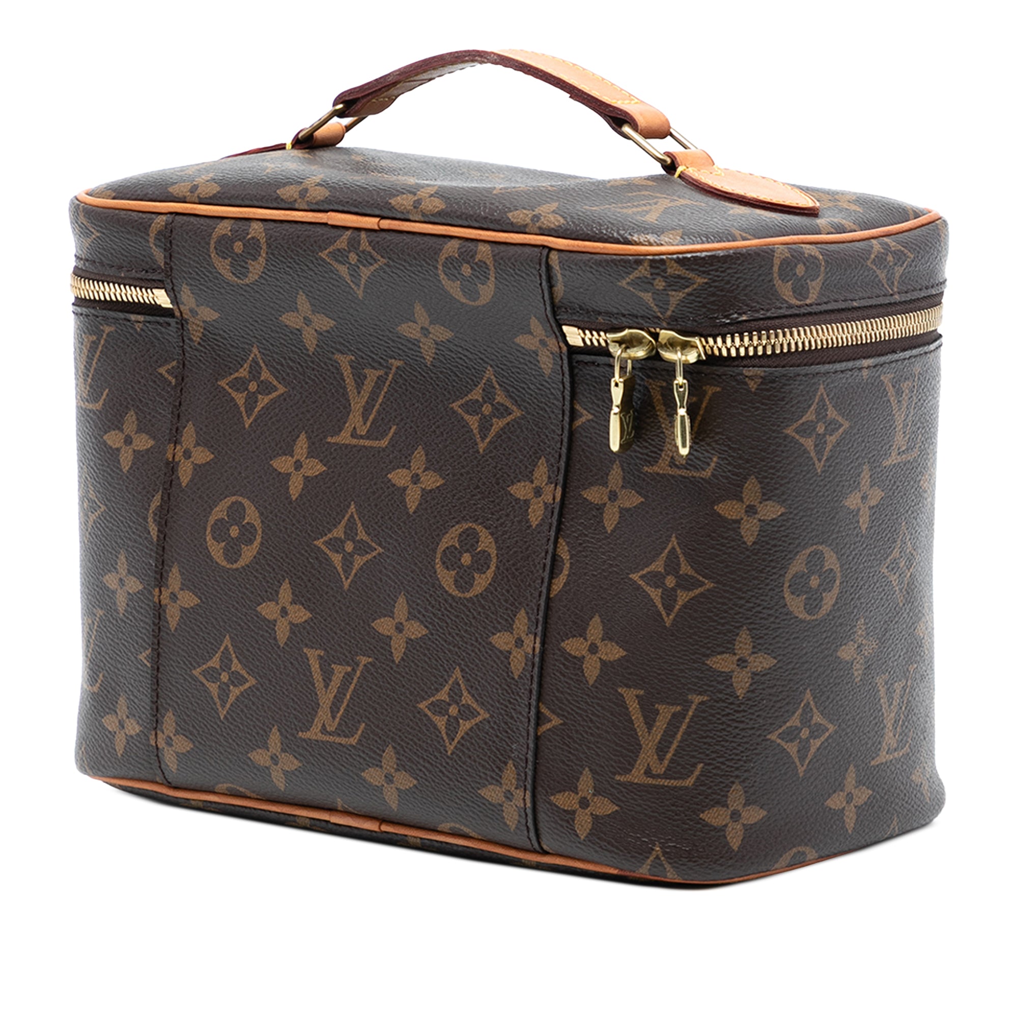 The Nice BB Vanity Case features a monogram canvas body with vachetta leather trim, a flat vachetta leather top handle, a top zip-around closure, and interior slip pockets. Retail Price: 1930.00