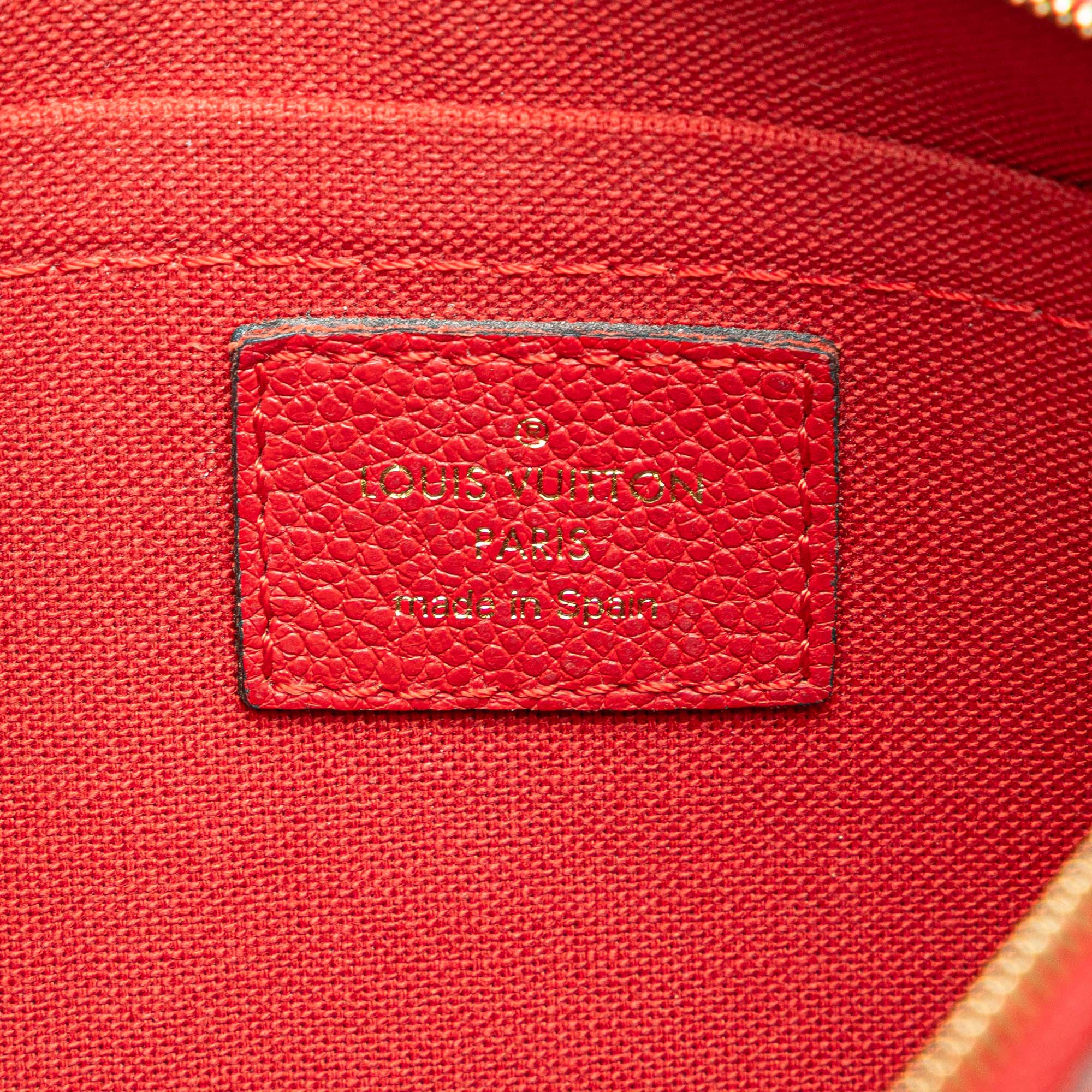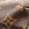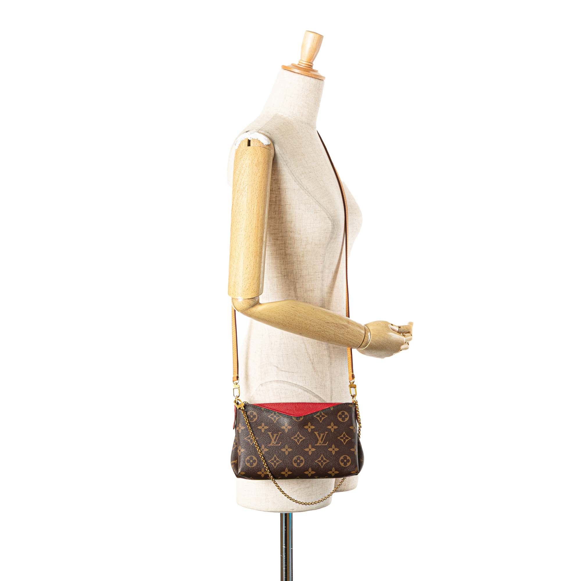 The Pallas Clutch features a monogram canvas body with leather trim, a gold-tone chain handle, a detachable flat vachetta shoulder strap, a top zip closure, an exterior front slip pocket, and an interior slip pocket. Retail Price: 1558.00