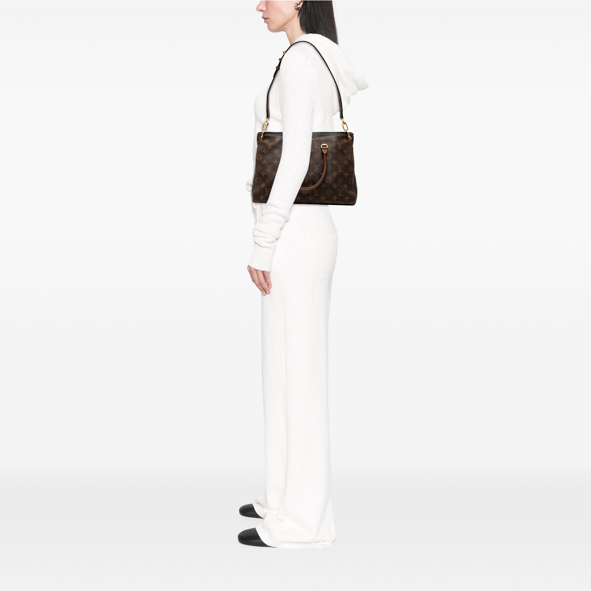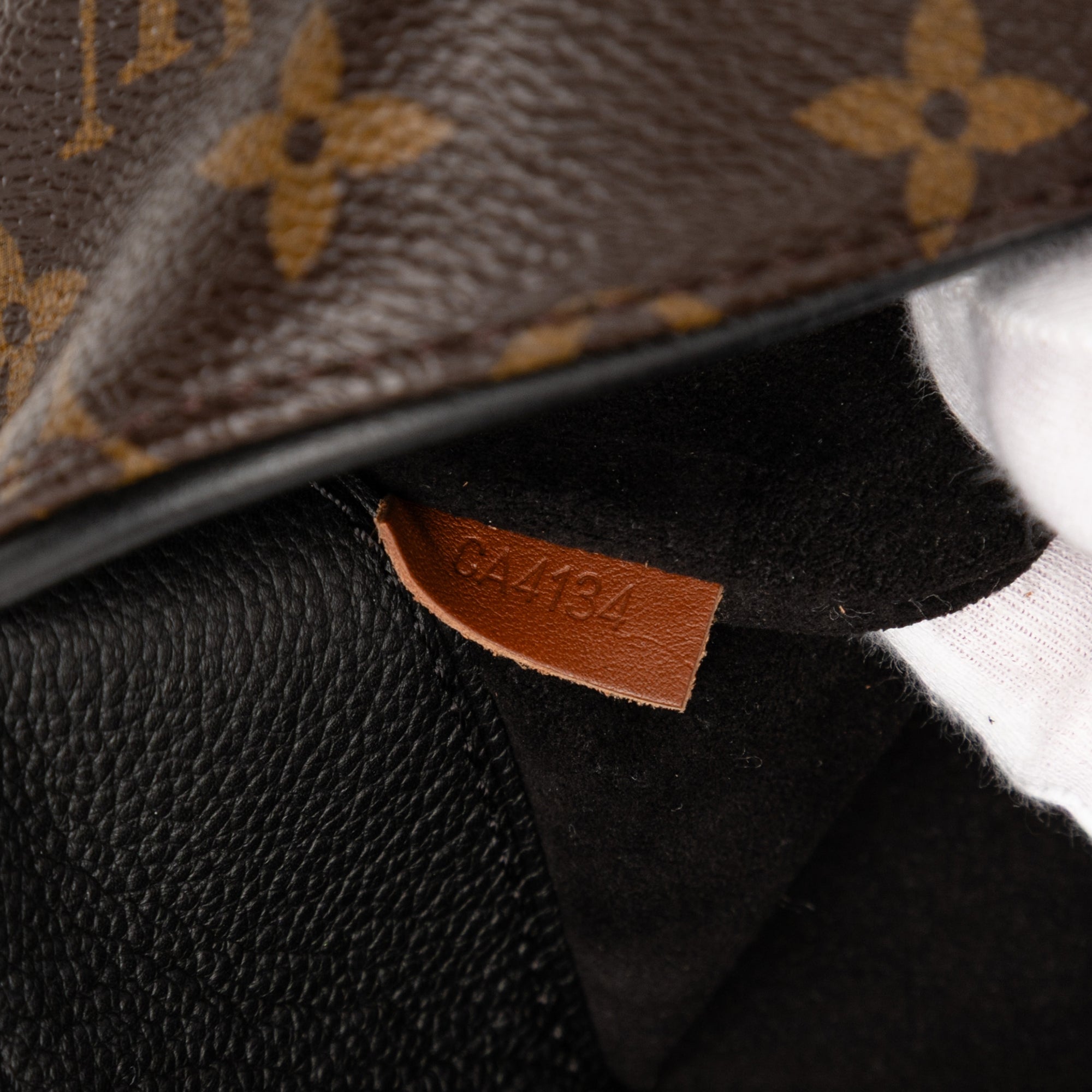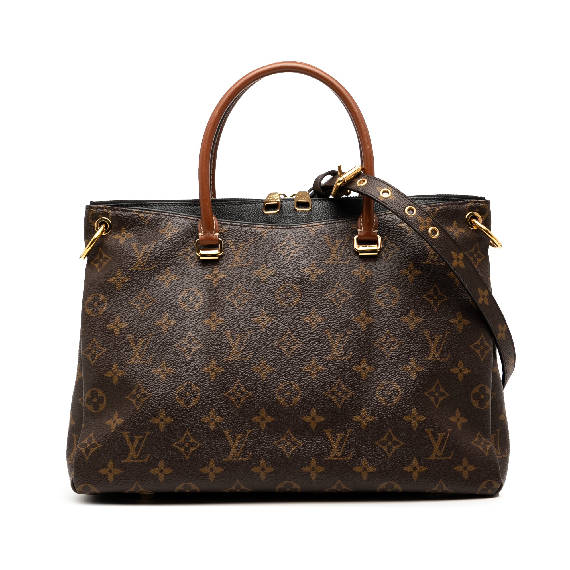 The Pallas satchel features a monogram canvas body, rolled leather top handles, a detachable and adjustable flat strap, a top zip closure, and interior slip and zip pockets. Retail Price: 2490.00