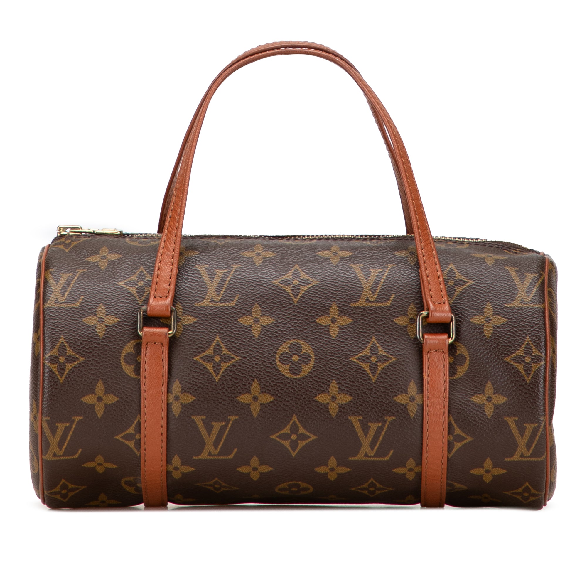 The Papillon 26 features a monogram canvas body with leather trim, flat leather handles, and a top zip closure. Retail Price: 1075.00