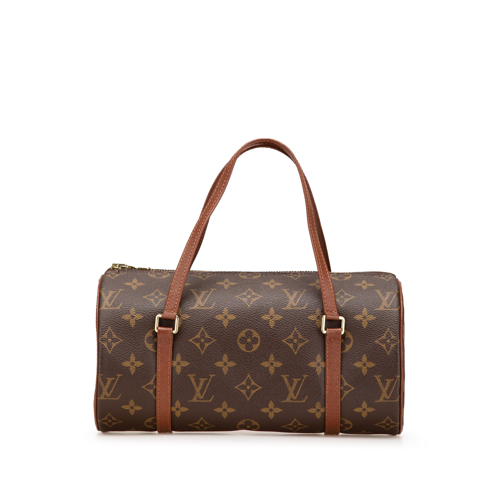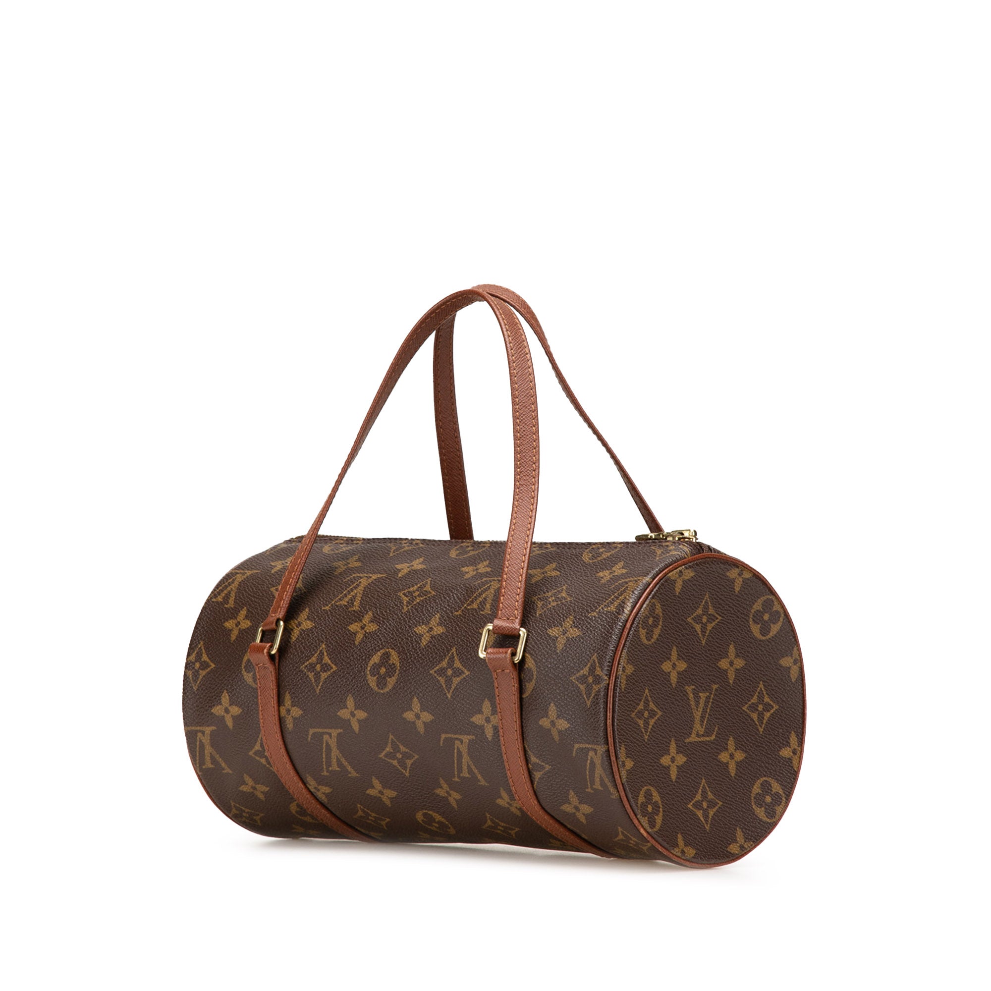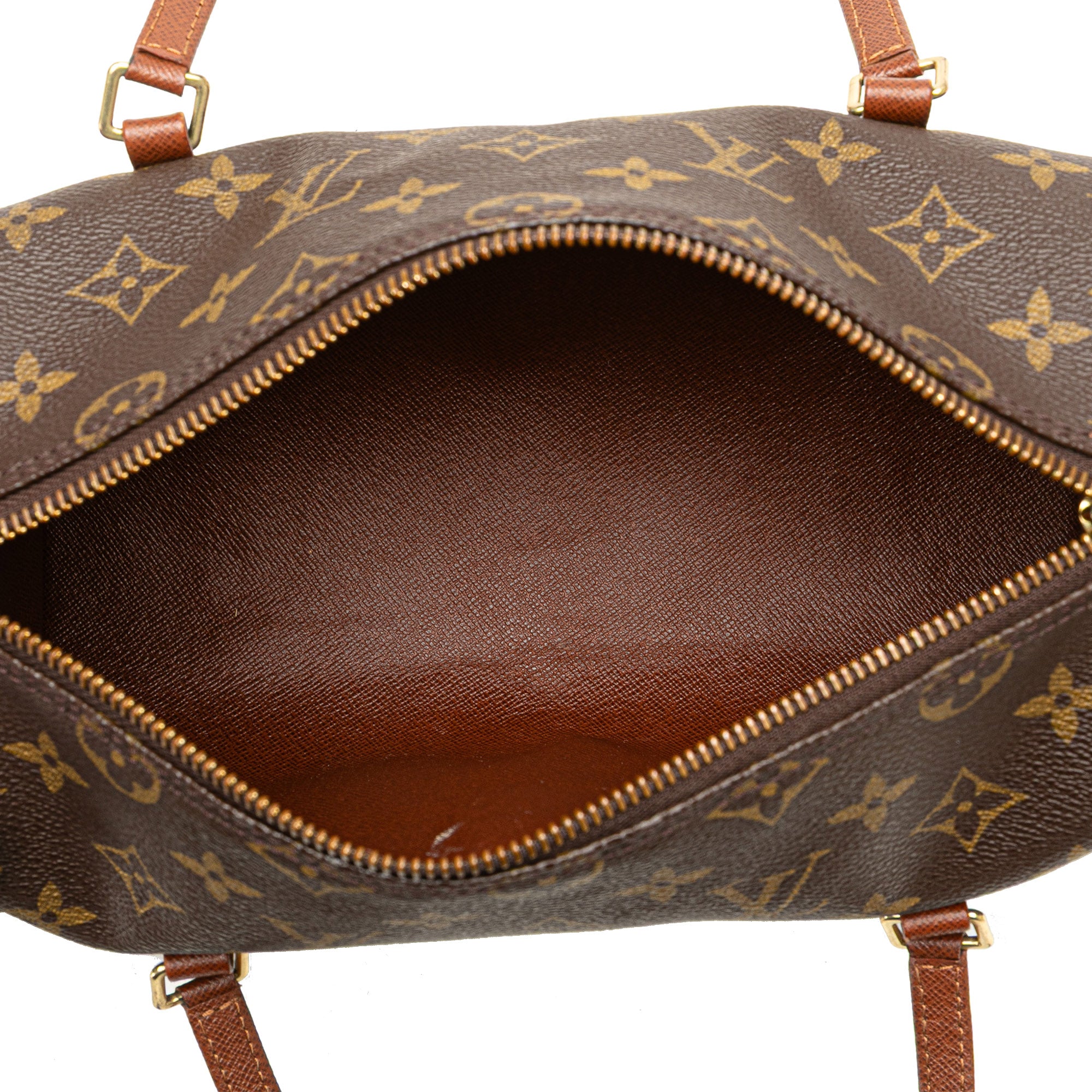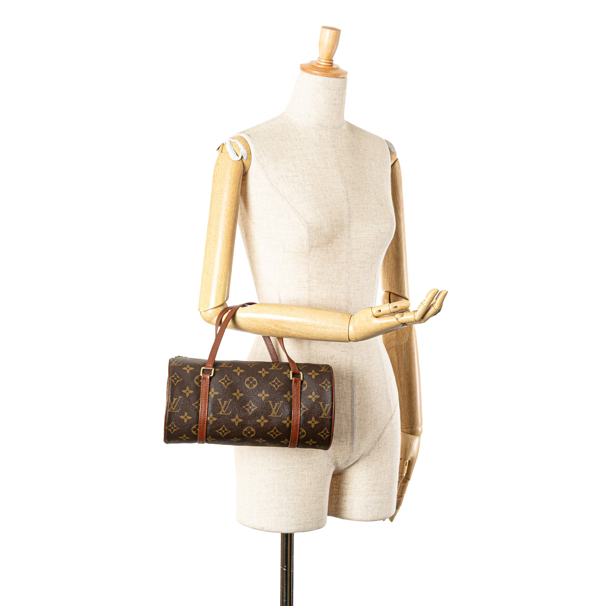 The Papillon 26 features a monogram canvas body with leather trim, flat leather handles, and a top zip closure. Retail Price: 1075.00