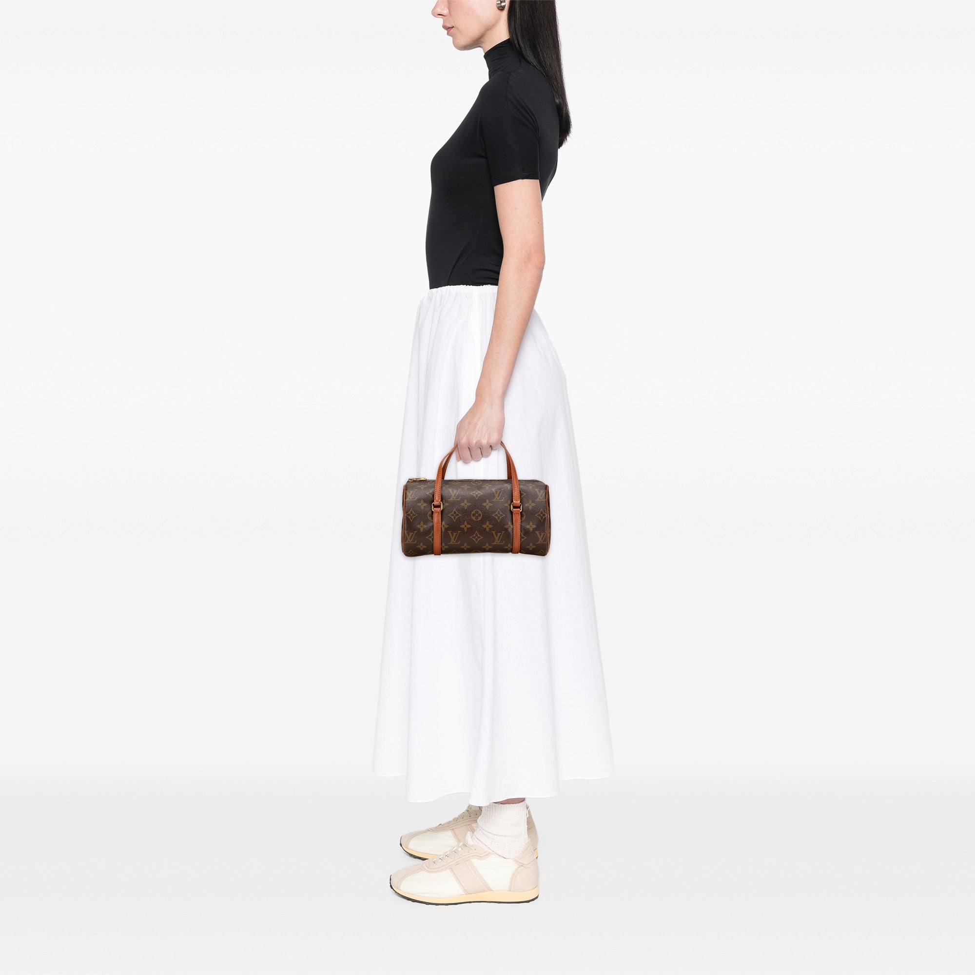 The Papillon 26 features a monogram canvas body with leather trim, flat leather handles, and a top zip closure. Retail Price: 1075.00