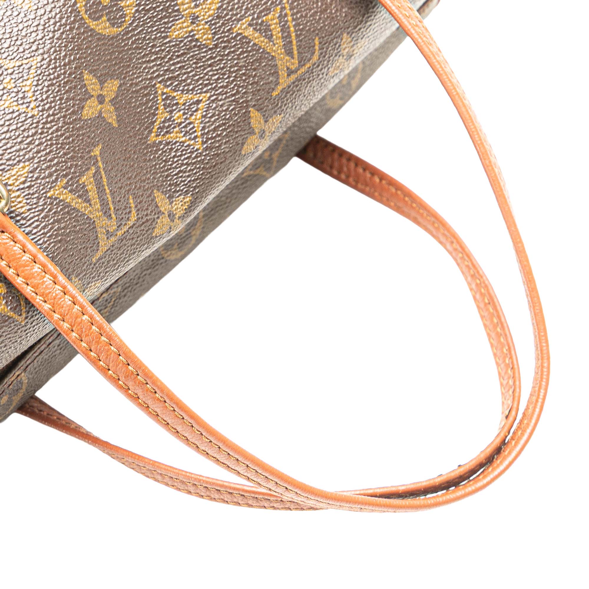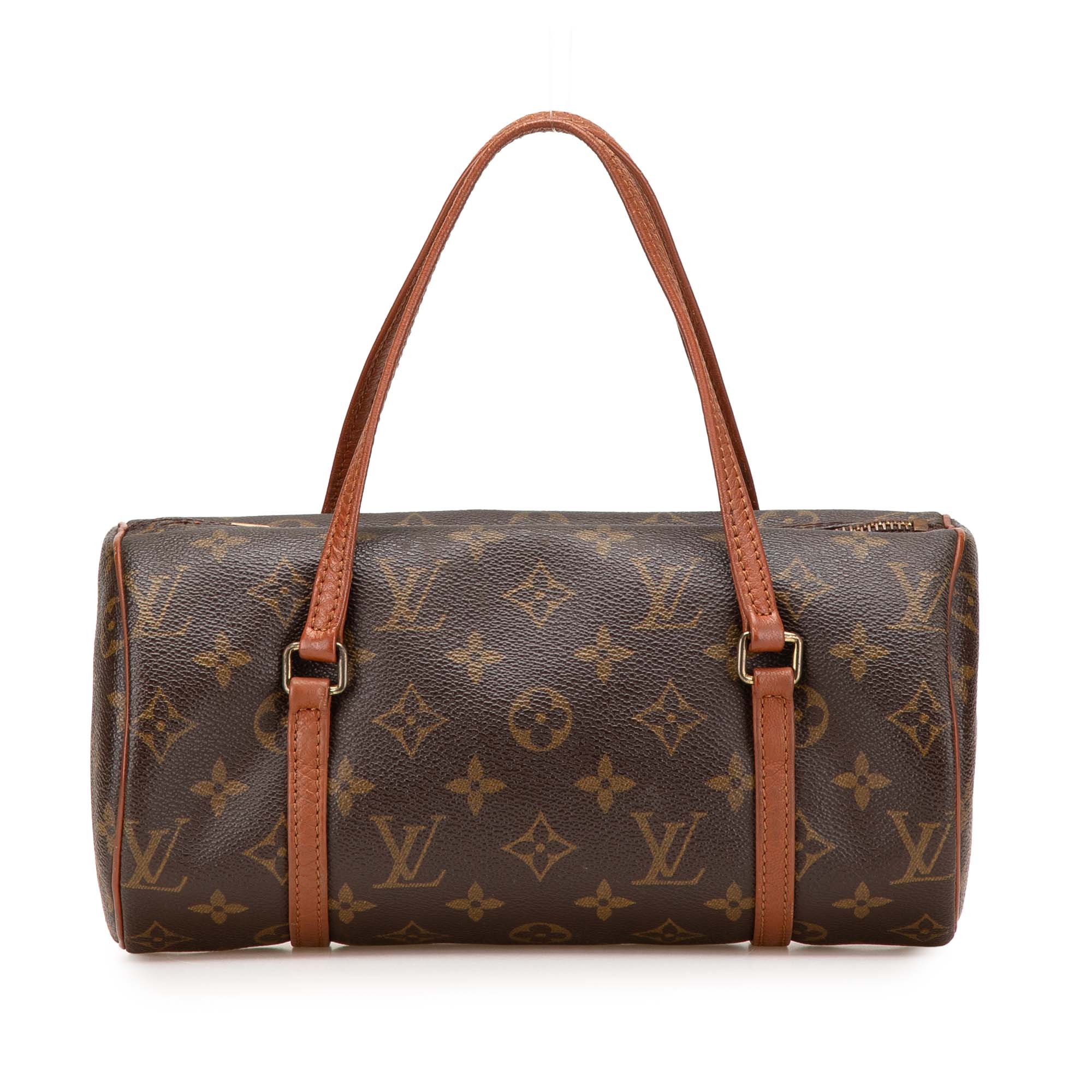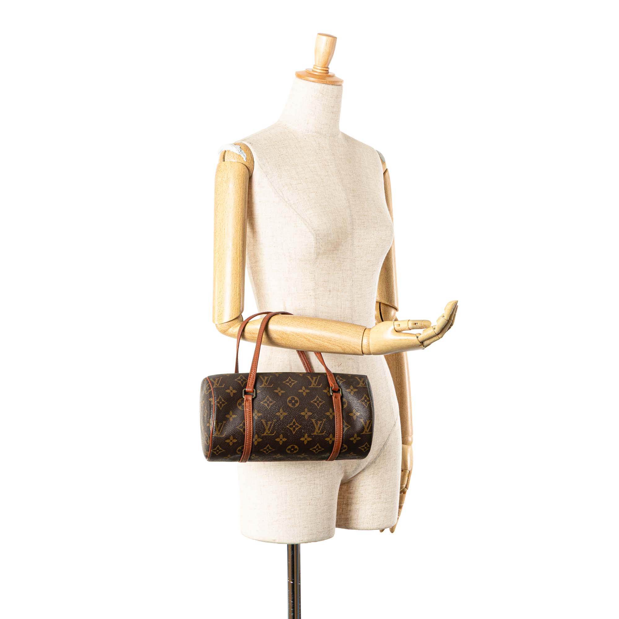 The Papillon 26 features a monogram canvas body with vachetta leather trim, flat vachetta leather handles, and a top zip closure. Retail Price: 1075.00