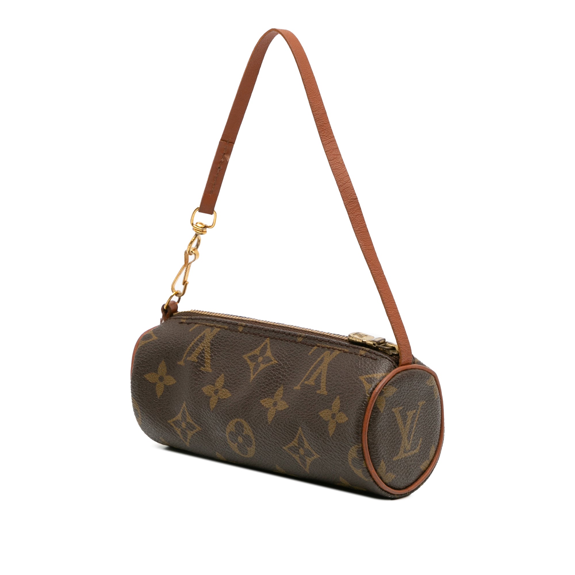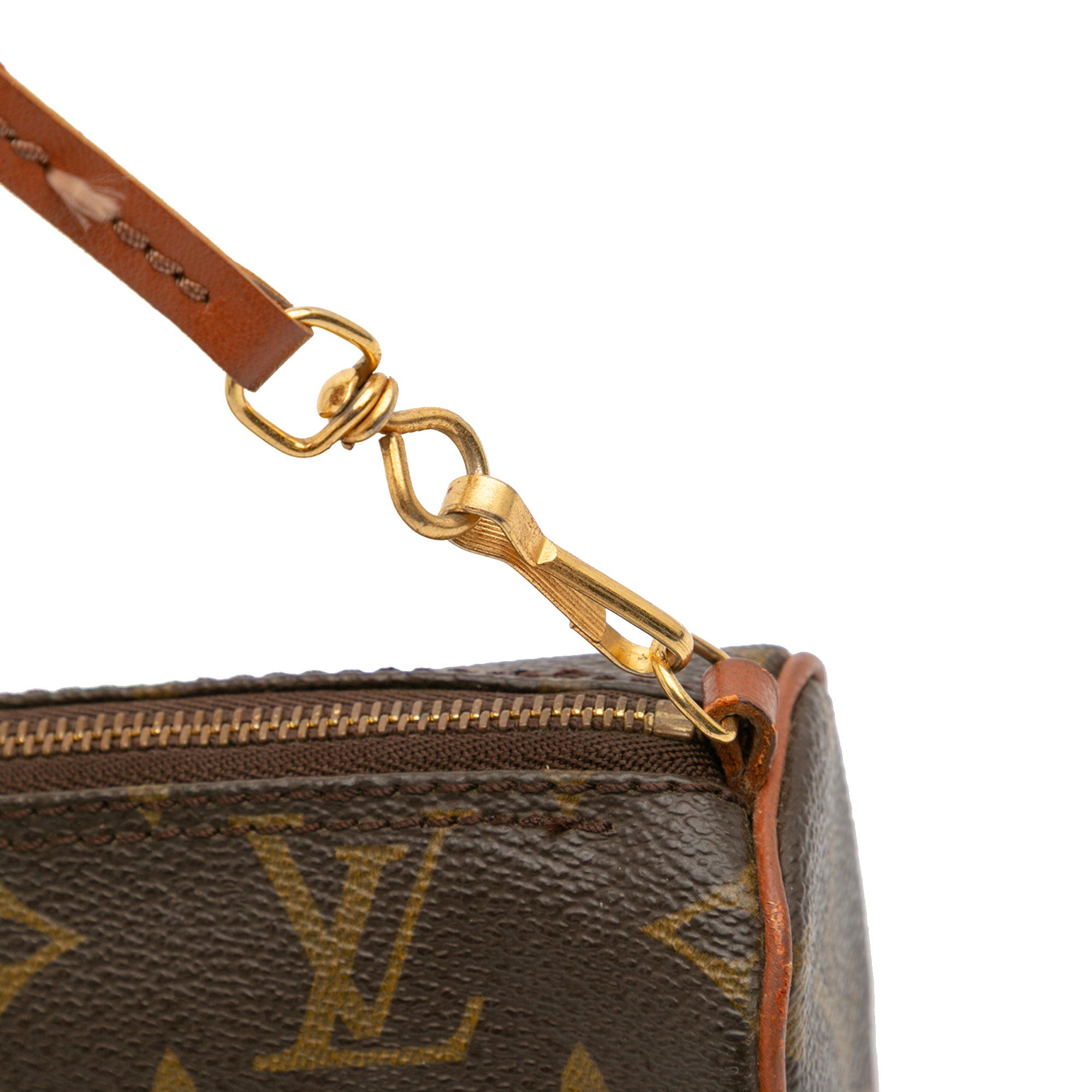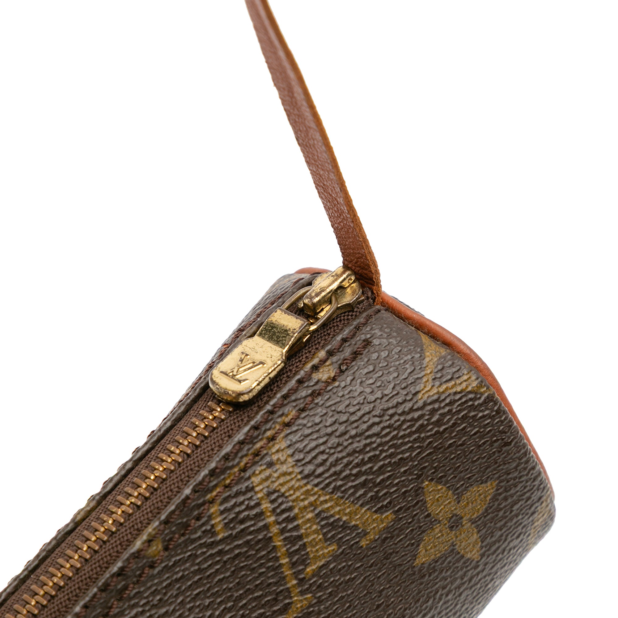 The Pochette Papillon features a monogram canvas body, a detachable leather strap, and a top zip closure. Retail Price: 750.00