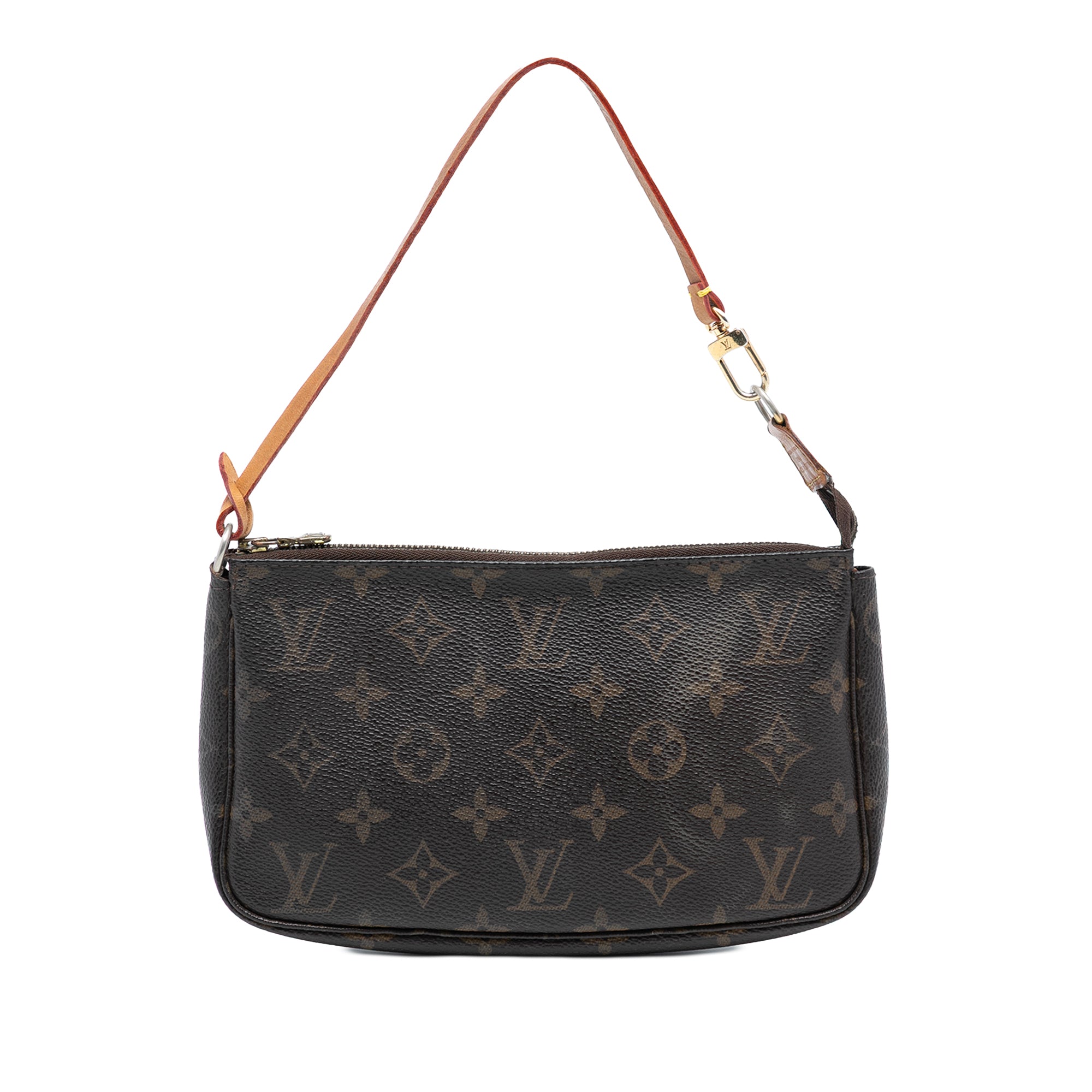 The Pochette Accessoires features a monogram canvas body, a flat vachetta leather handle, and a top zip closure. Retail Price: 1290.00