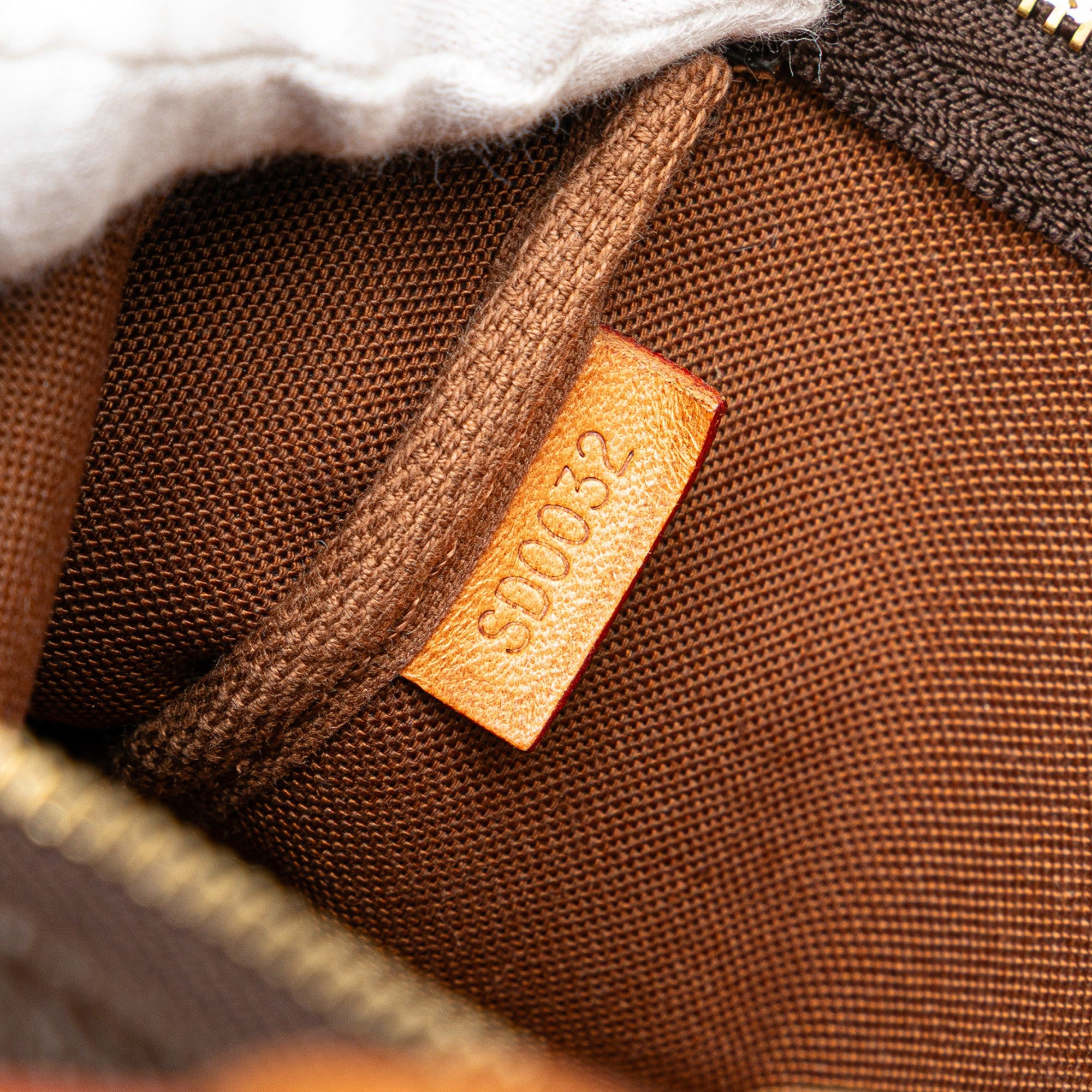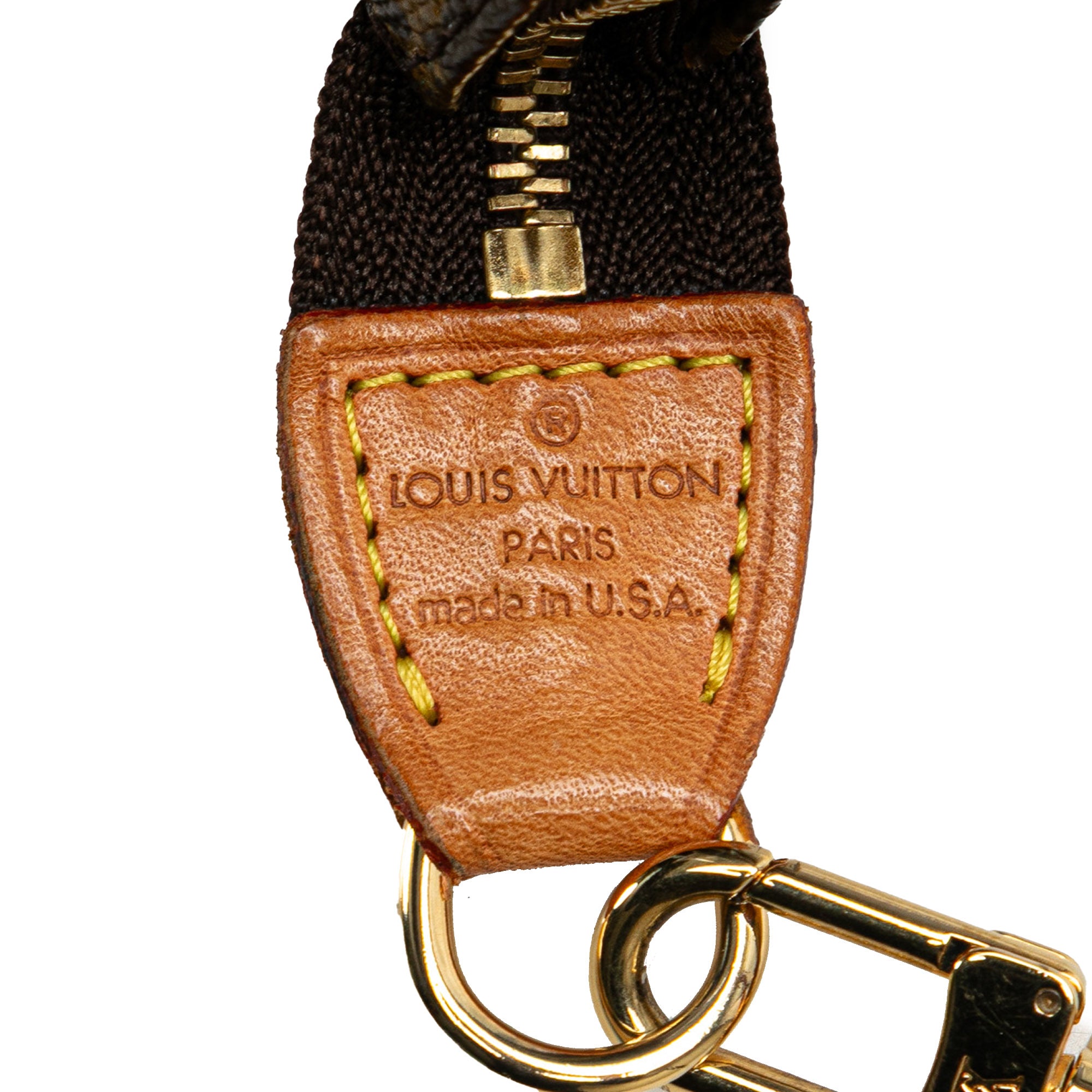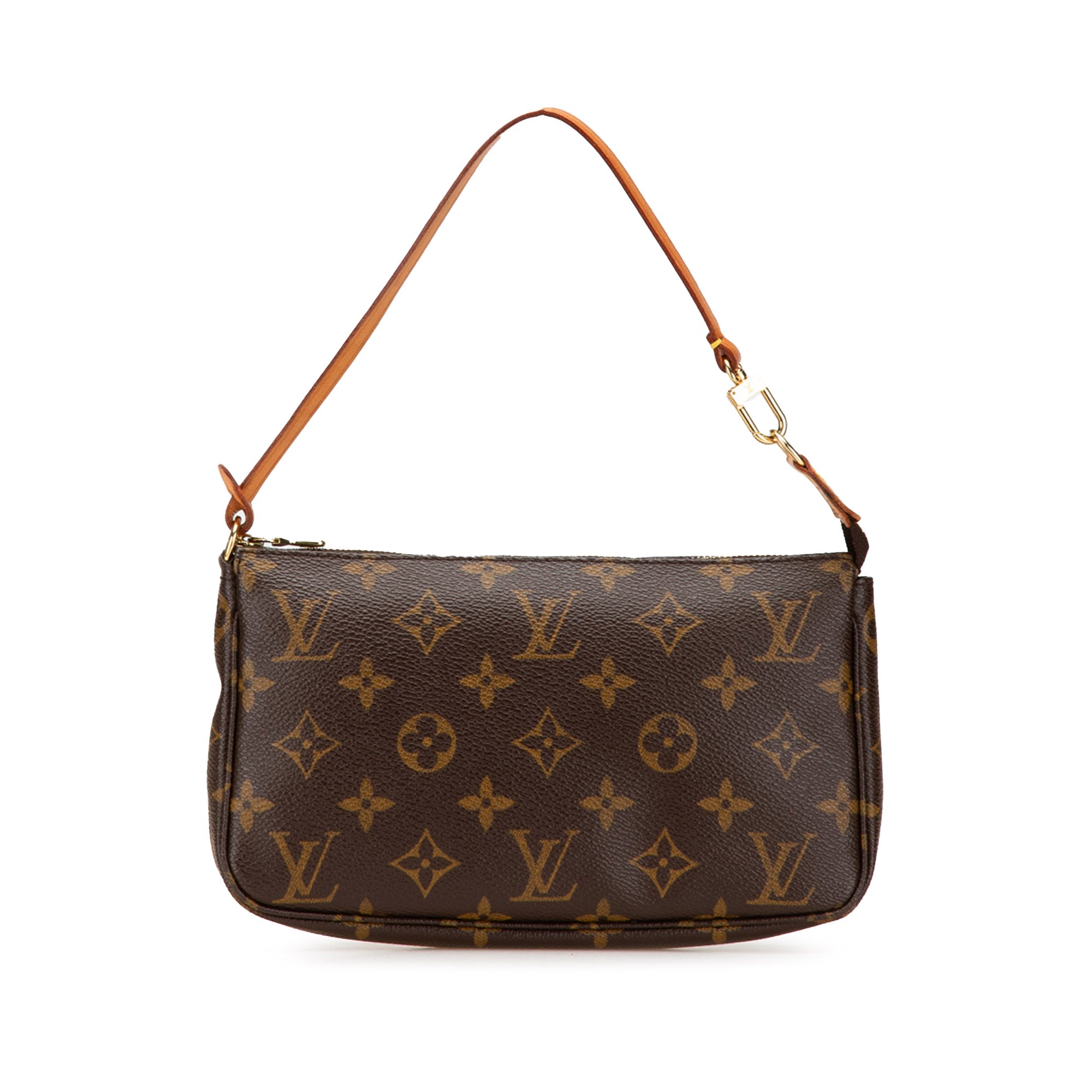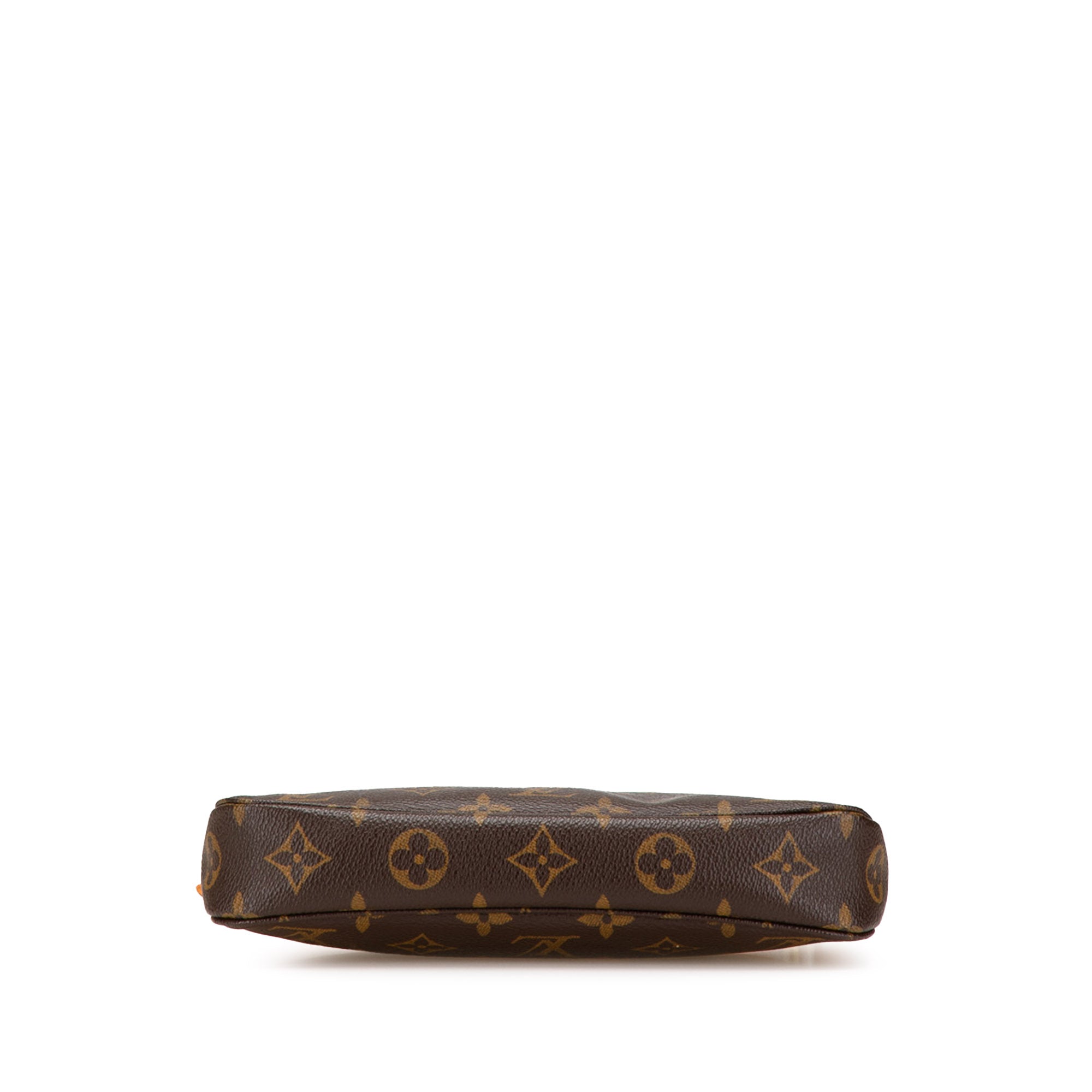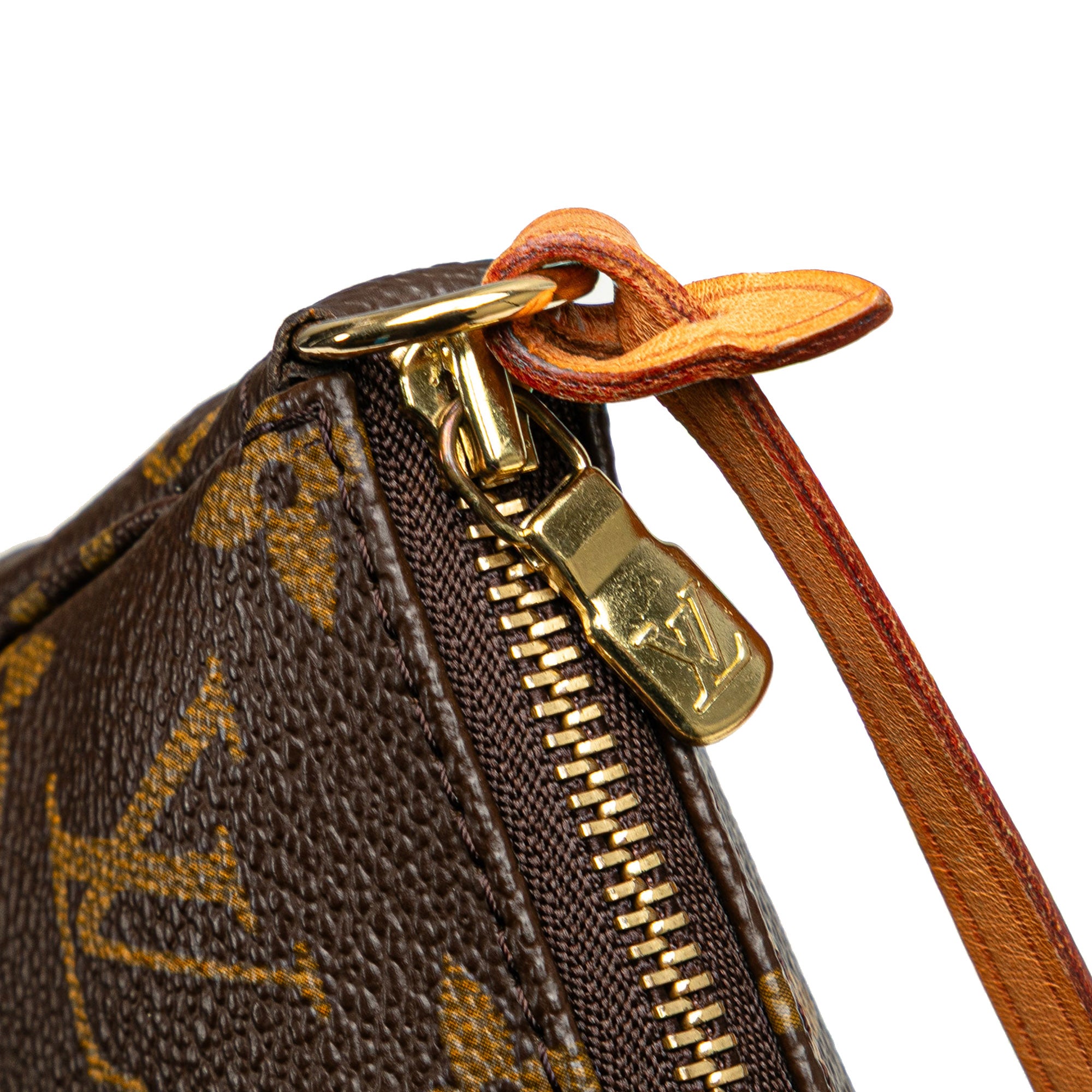 The Pochette Accessoires features a monogram canvas body, a flat vachetta leather handle, and a top zip closure. Retail Price: 1281.00