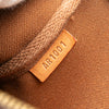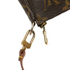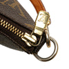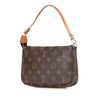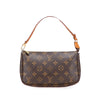 The Pochette Accessoires features a monogram canvas body, a flat vachetta leather handle, and a top zip closure. Retail Price: 1290.00
