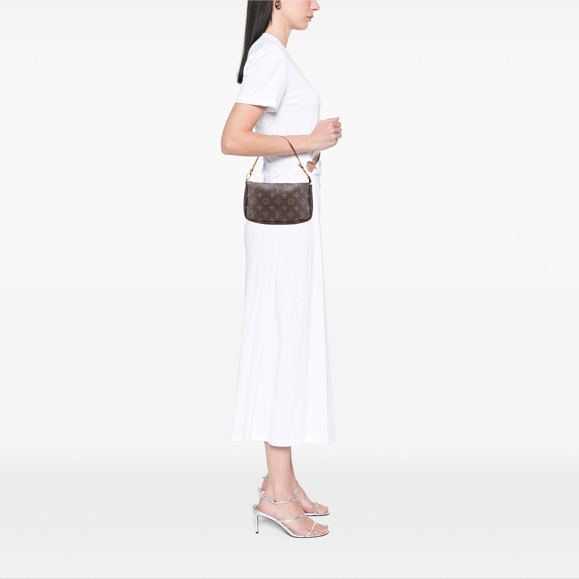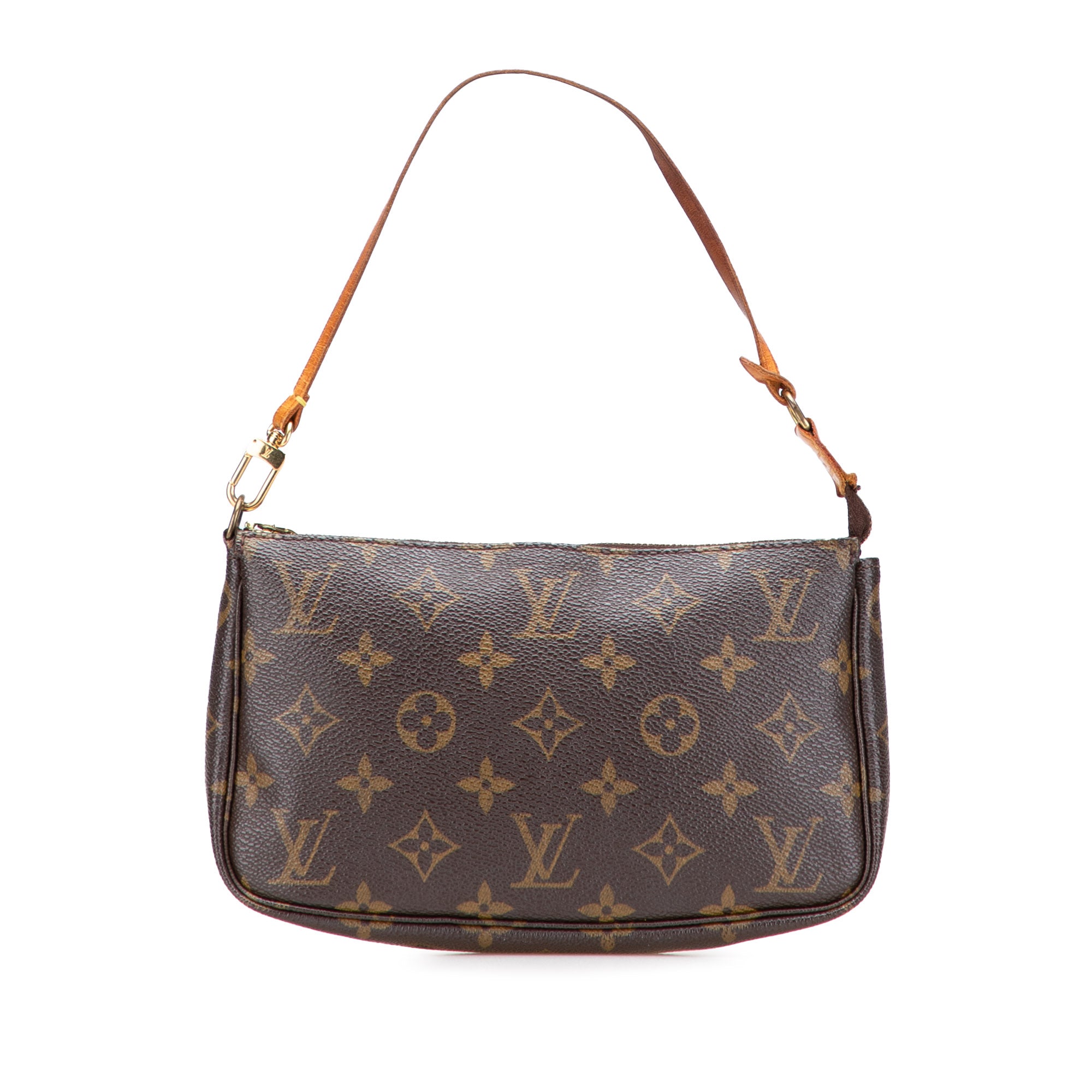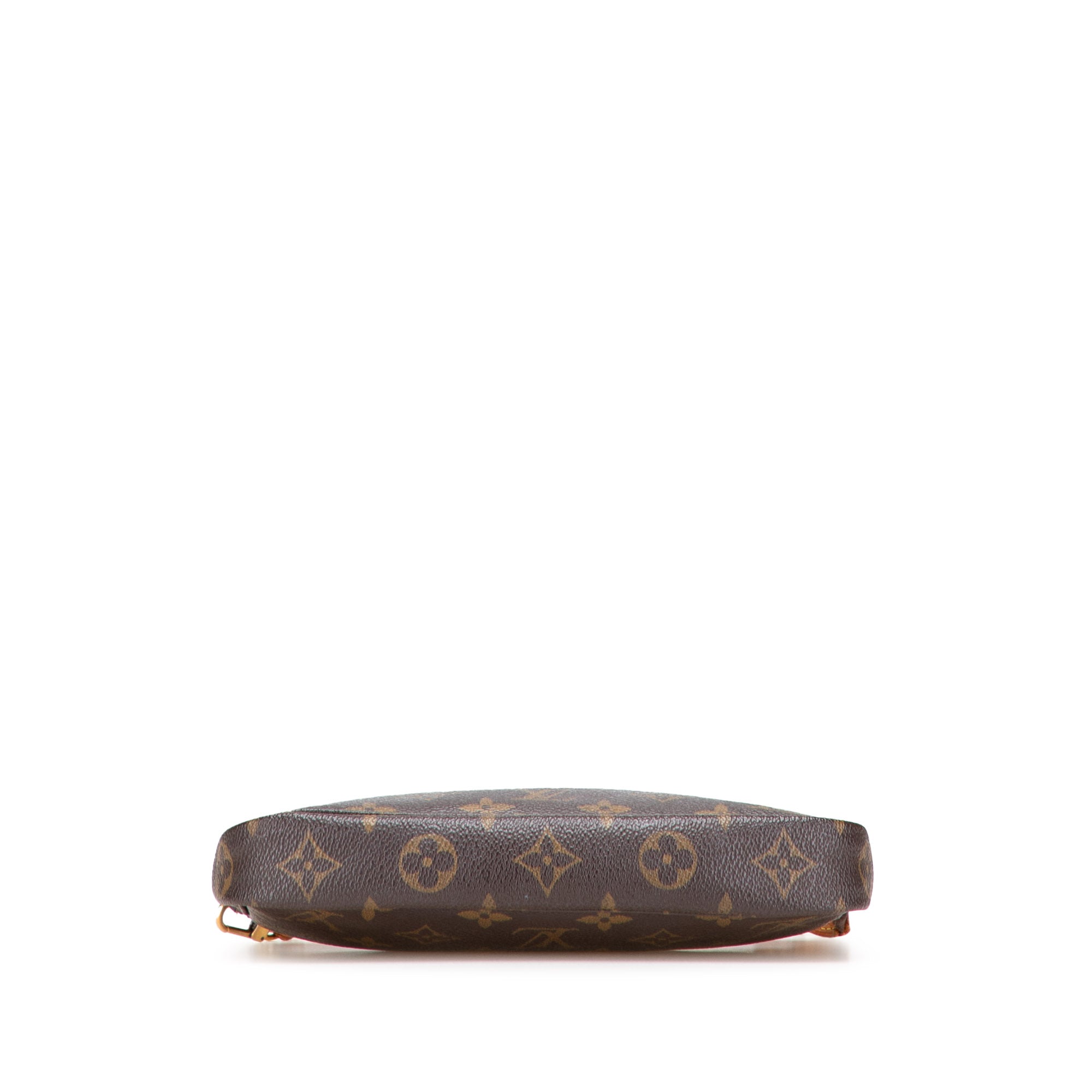 The Pochette Accessoires features a monogram canvas body, a flat vachetta leather handle, and a top zip closure. Retail Price: 1290.00