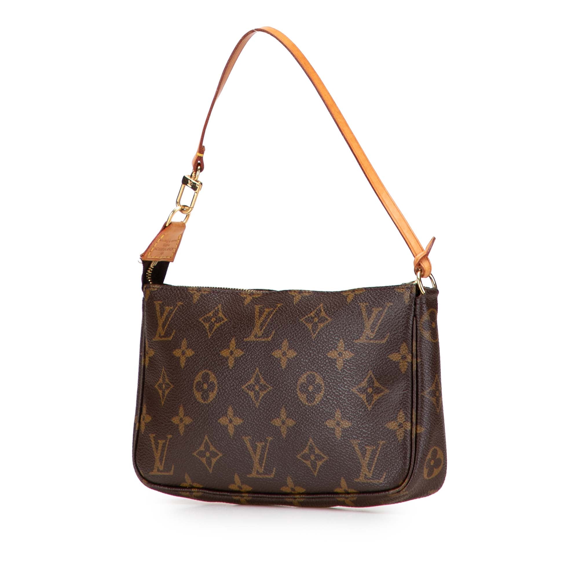 The Pochette Accessoires features a monogram canvas body, a flat vachetta leather handle, and a top zip closure. Inclusion: Dust bag. Retail Price: 1290.00