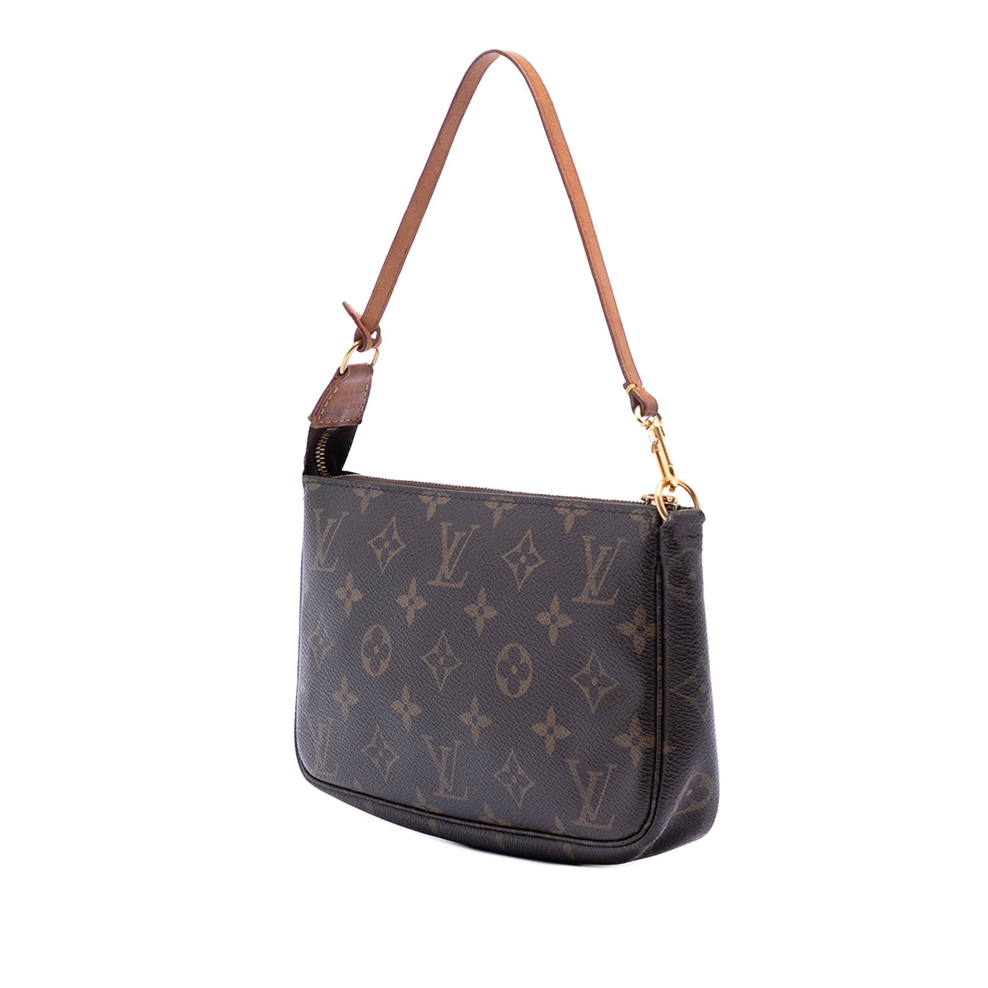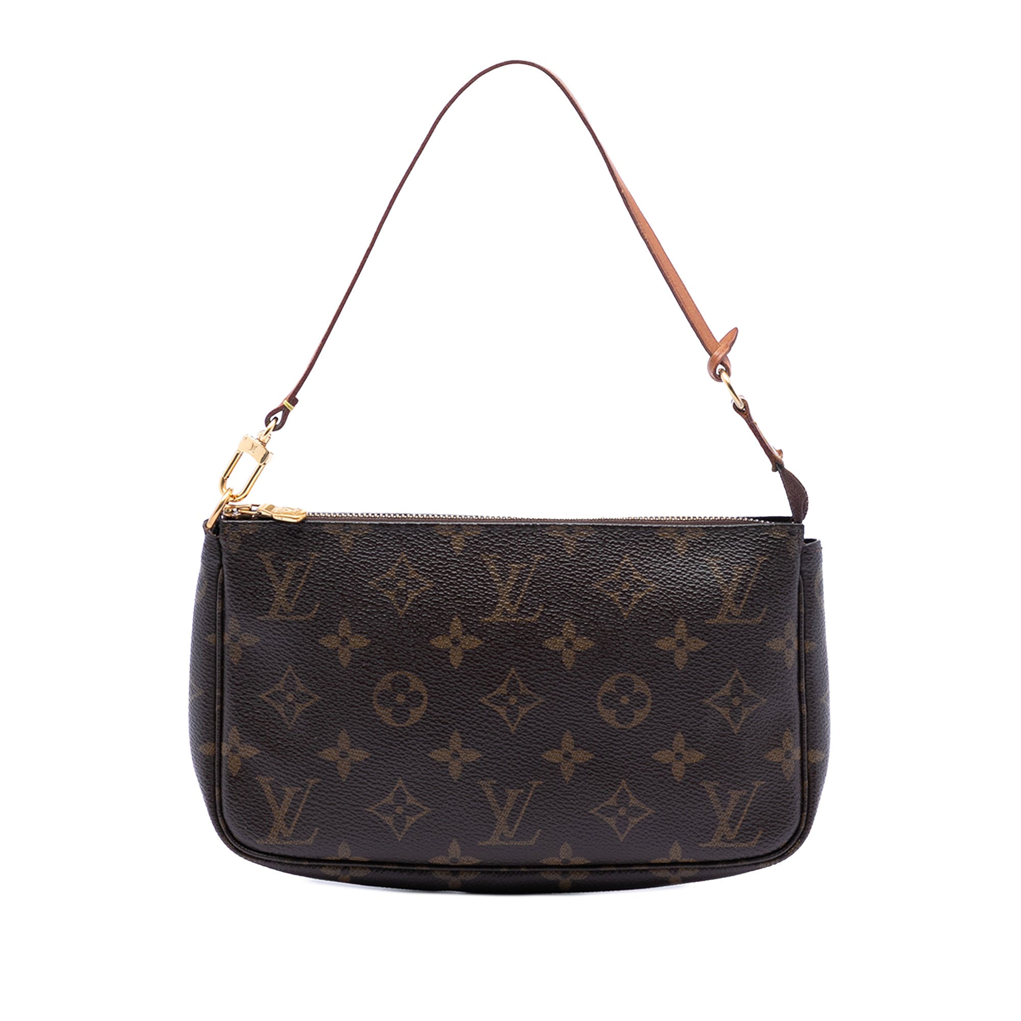 The Pochette Accessoires features a monogram canvas body, a flat vachetta leather strap, and a top zip closure. Retail Price: 1290.00