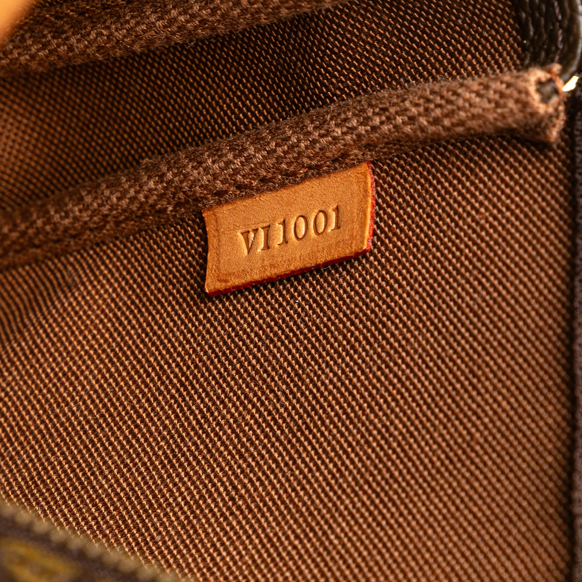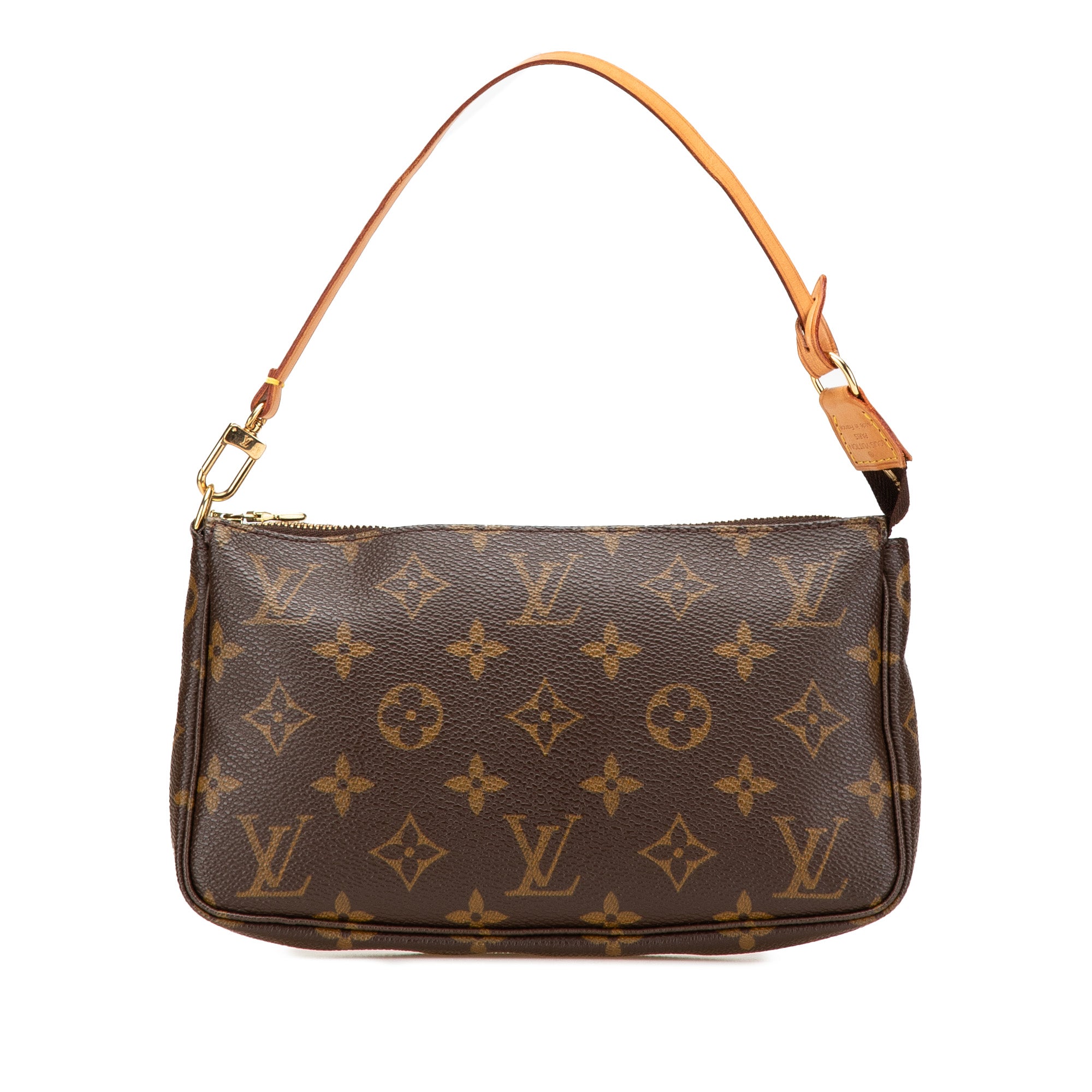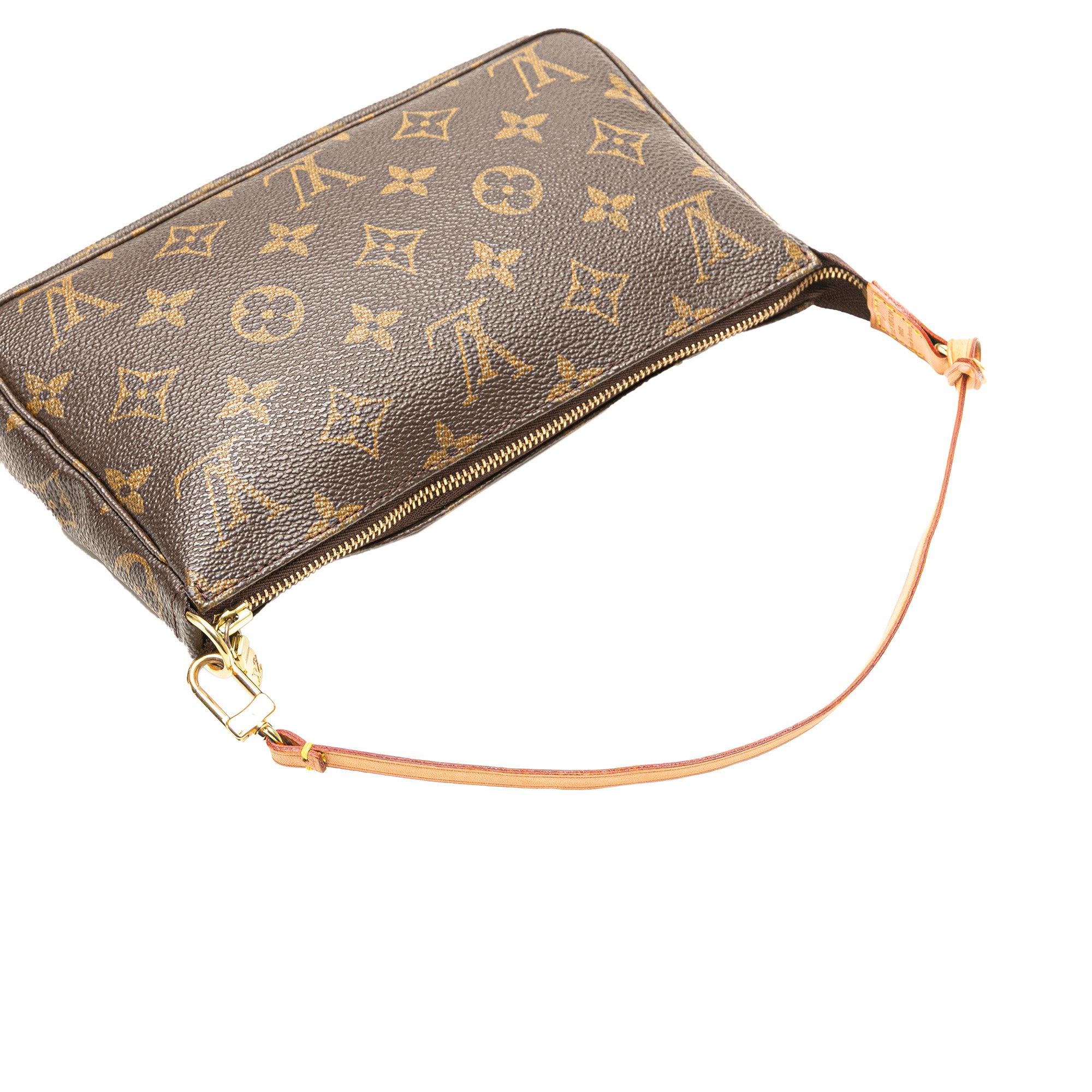 The Pochette Accessoires features a monogram canvas body, a flat vachetta leather strap, and a top zip closure. Retail Price: 1286.00