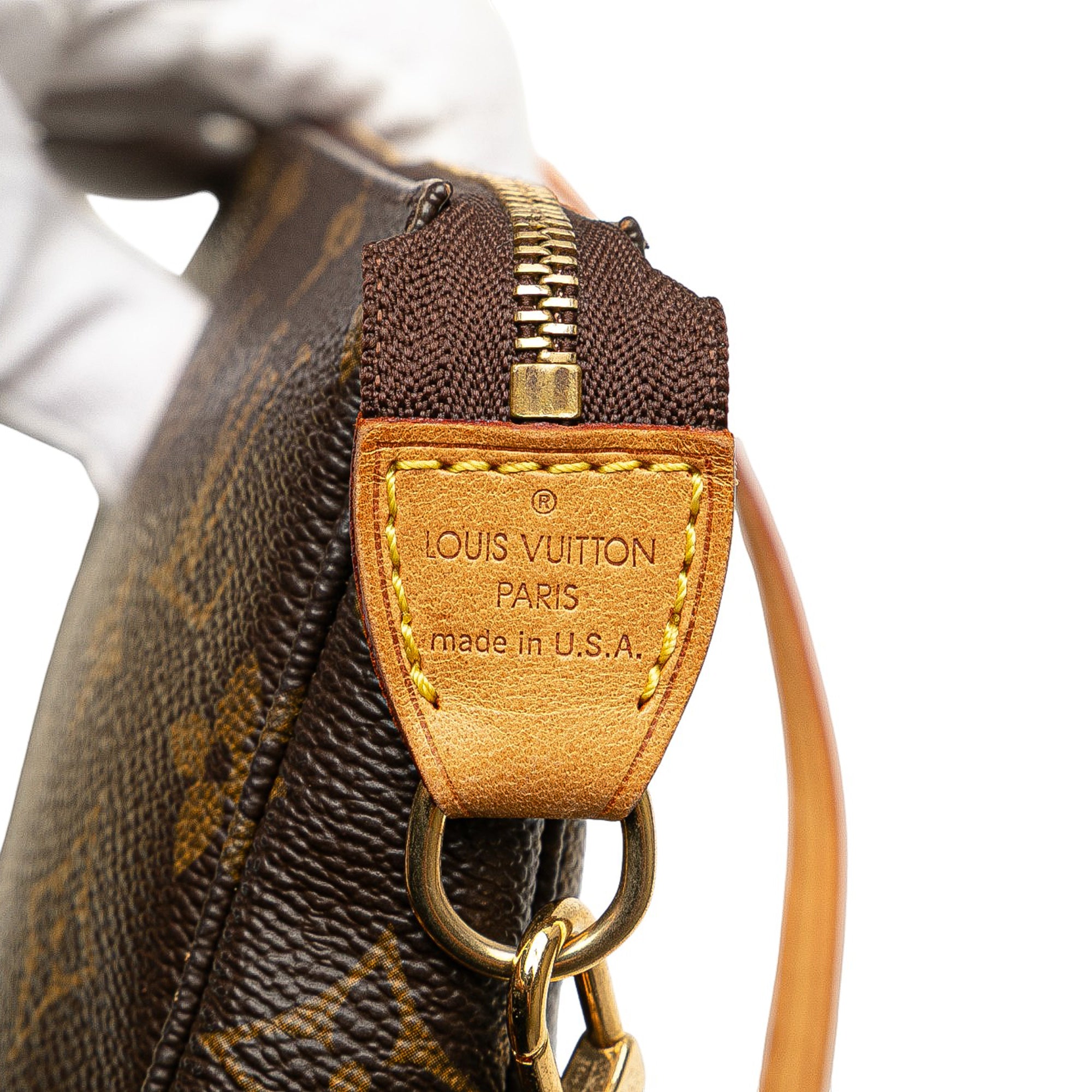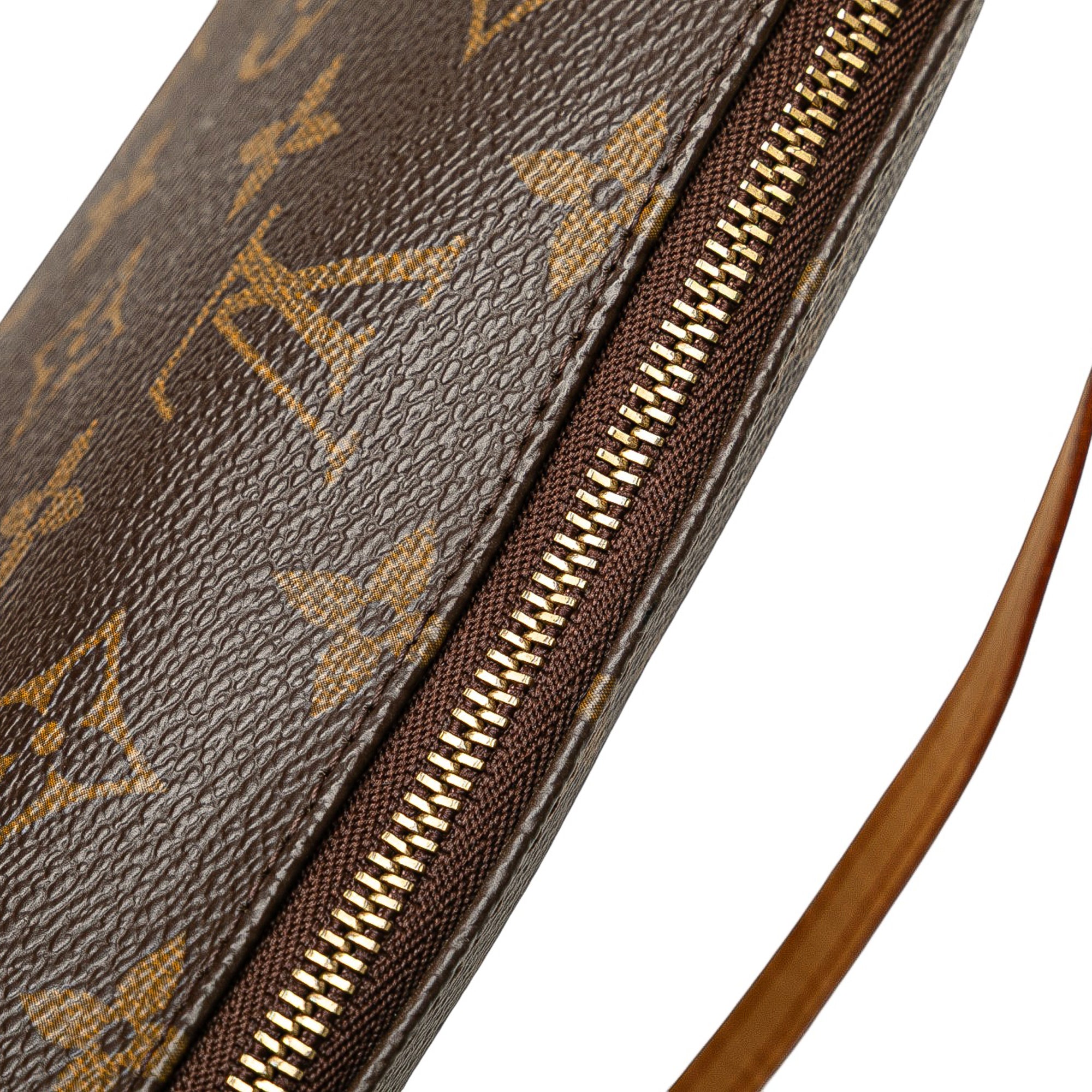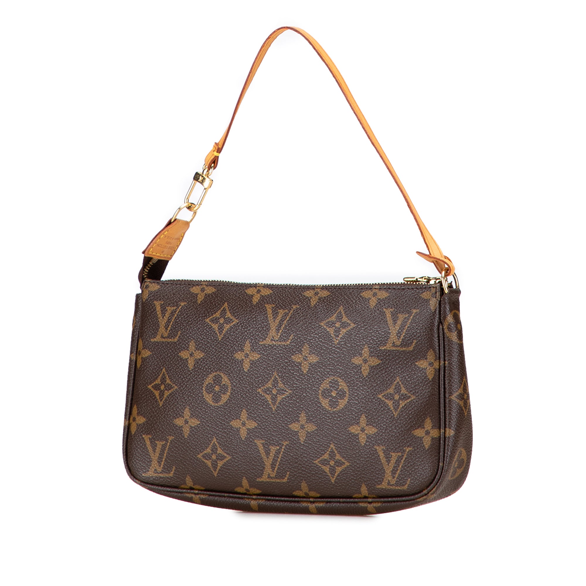 The Pochette Accessoires features a monogram canvas body, a flat vachetta leather handle, and a top zip closure. Retail Price: 1290.00