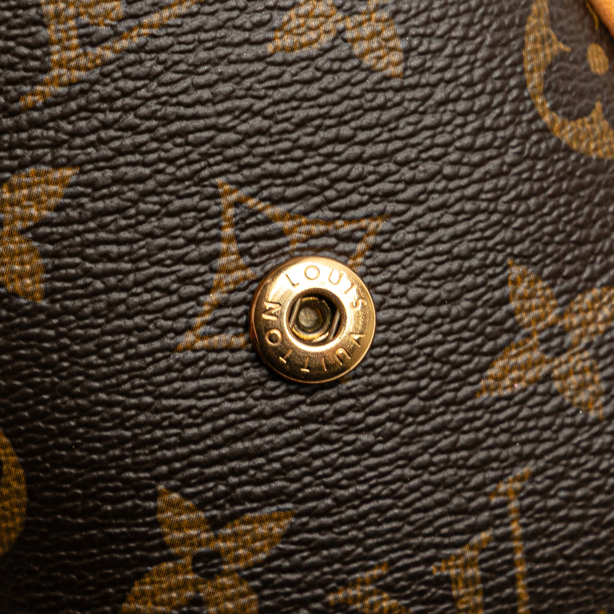 The Cancun features a monogram canvas body with vachetta leather trim, a flat vachetta leather strap, and a top flap with snap button closure. Retail Price: 825.00