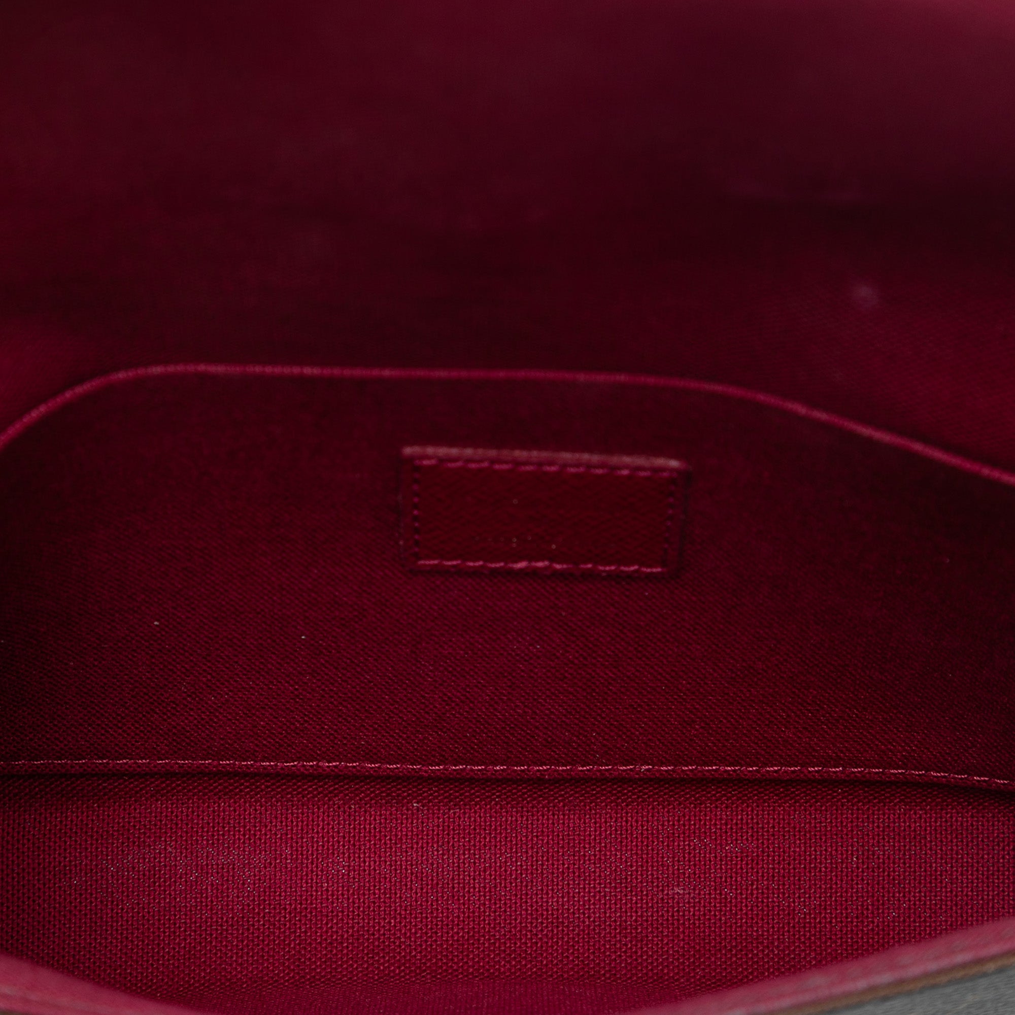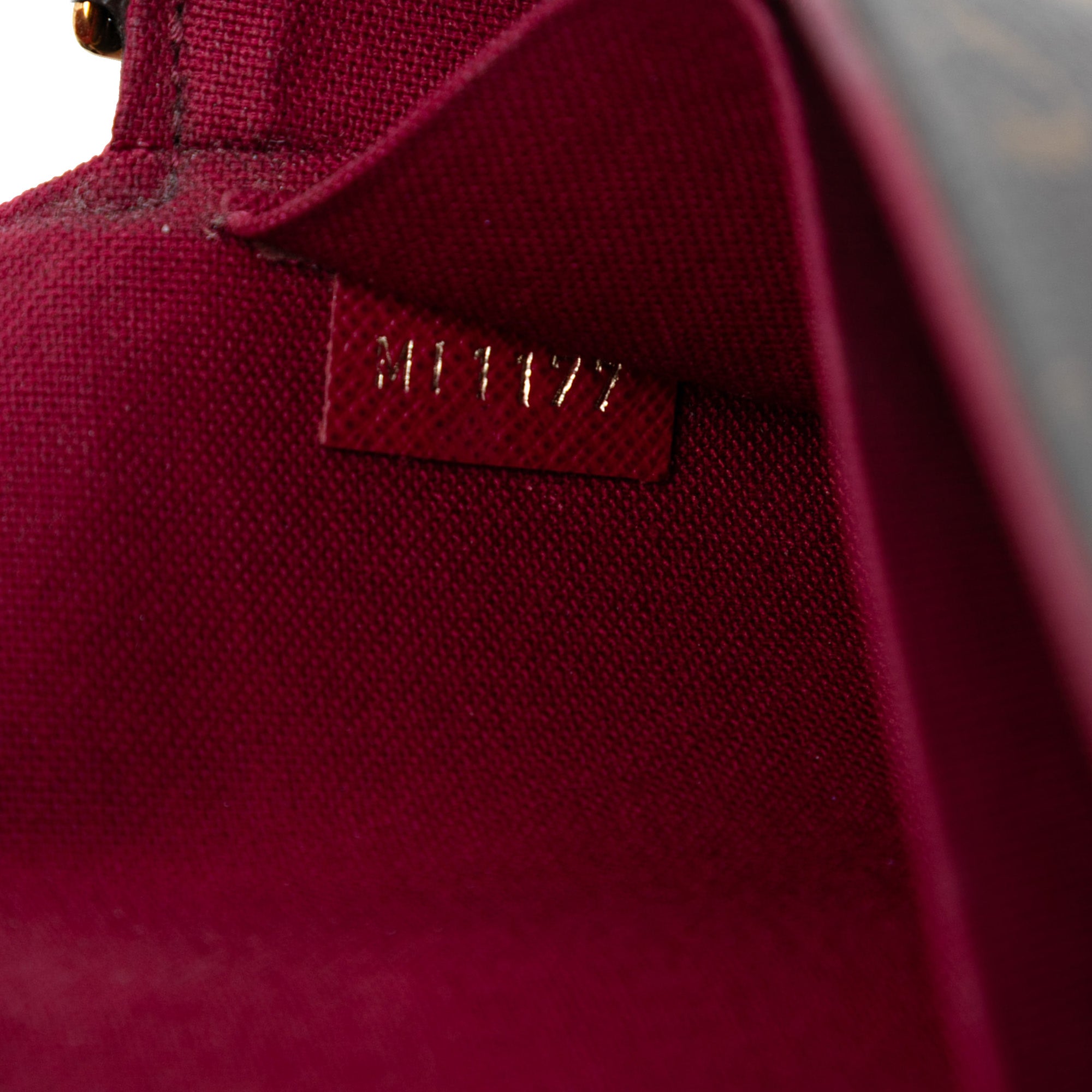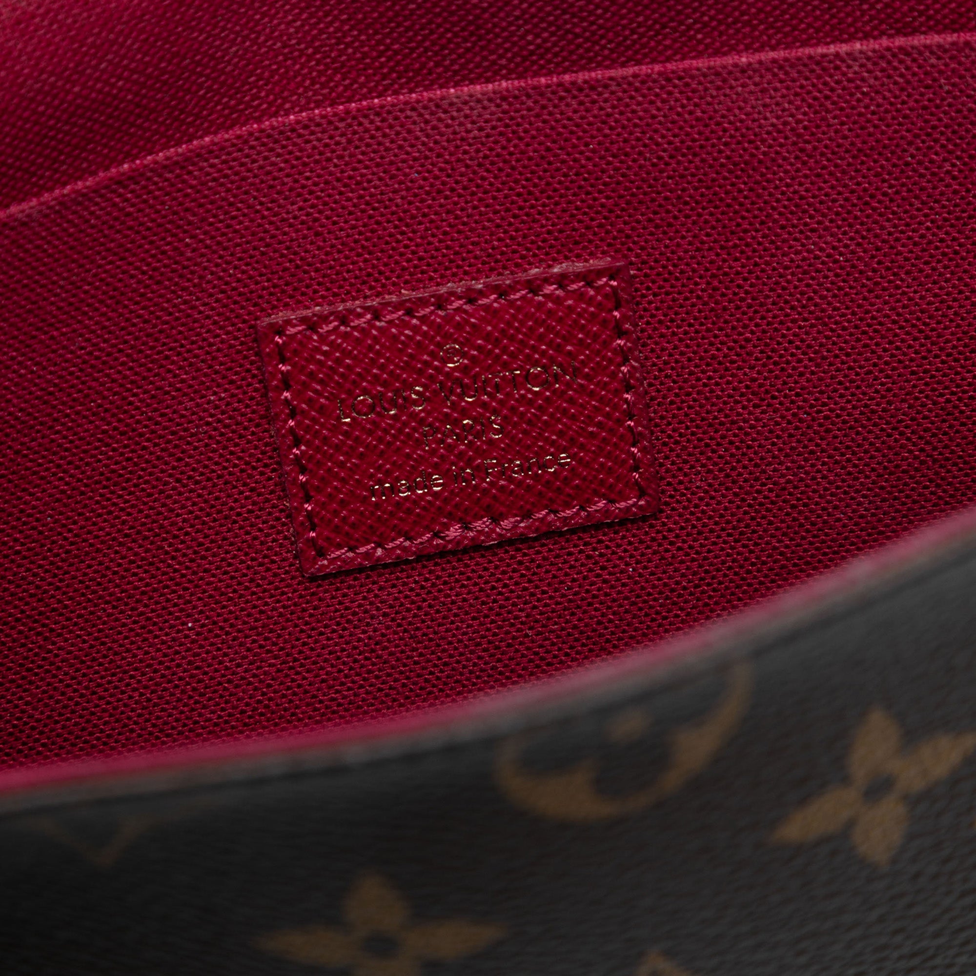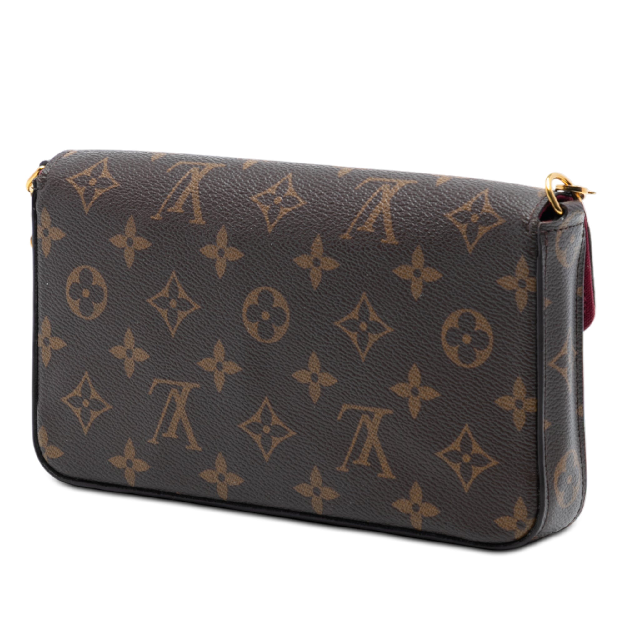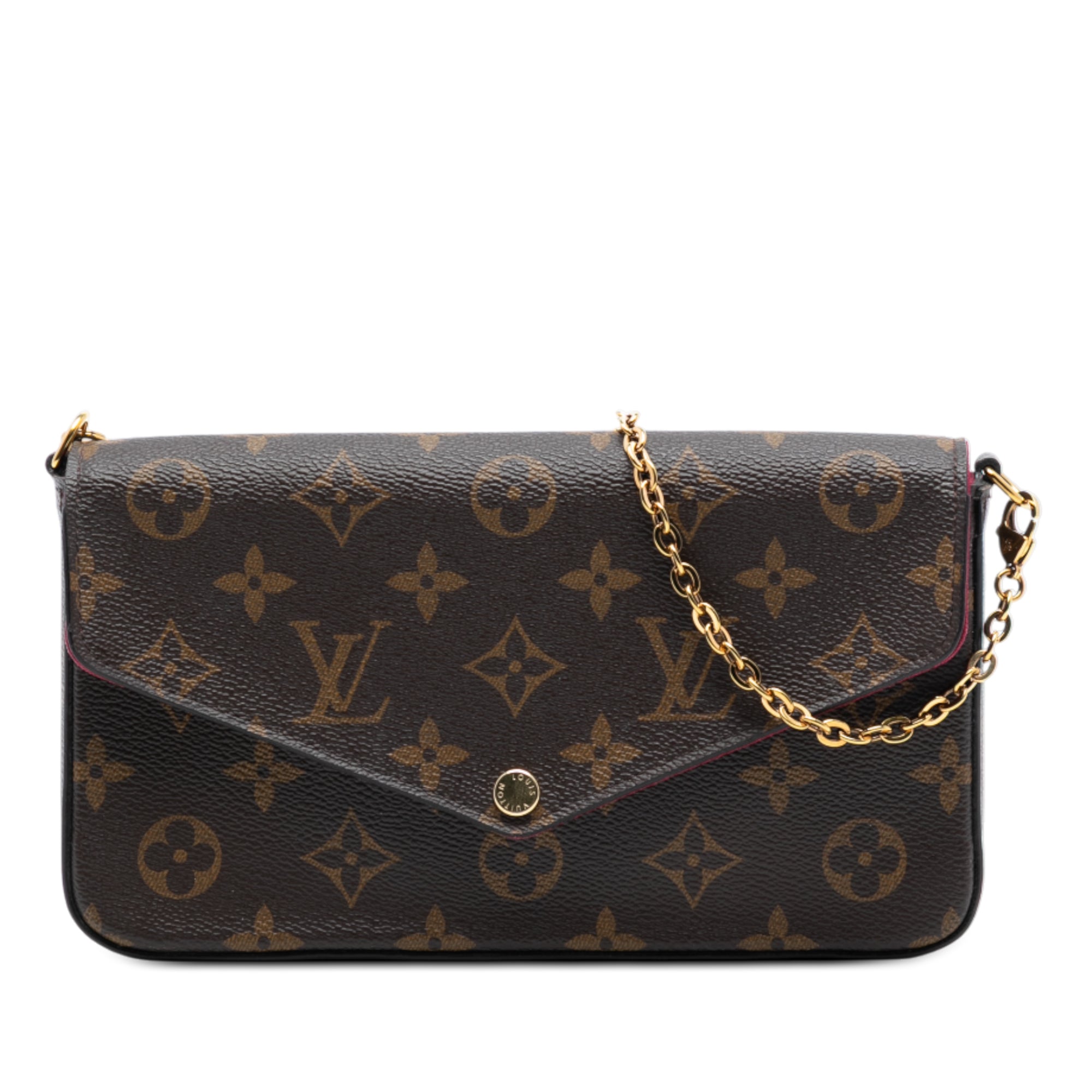 The Pochette Felicie crossbody bag features a monogram canvas body, a detachable gold-tone chain shoulder strap, a top flap with snap closure, and an interior slip pocket. Retail Price: 1641.00