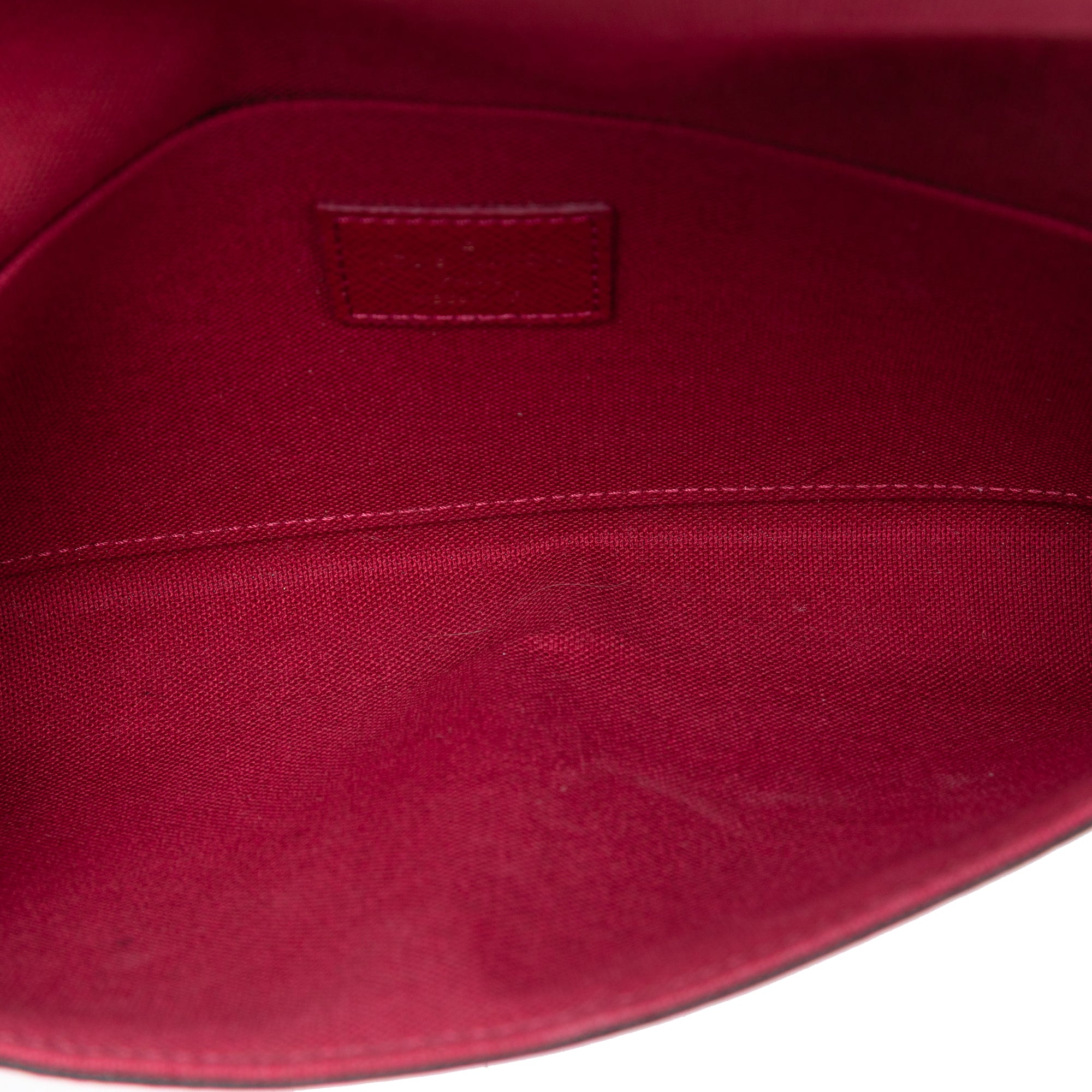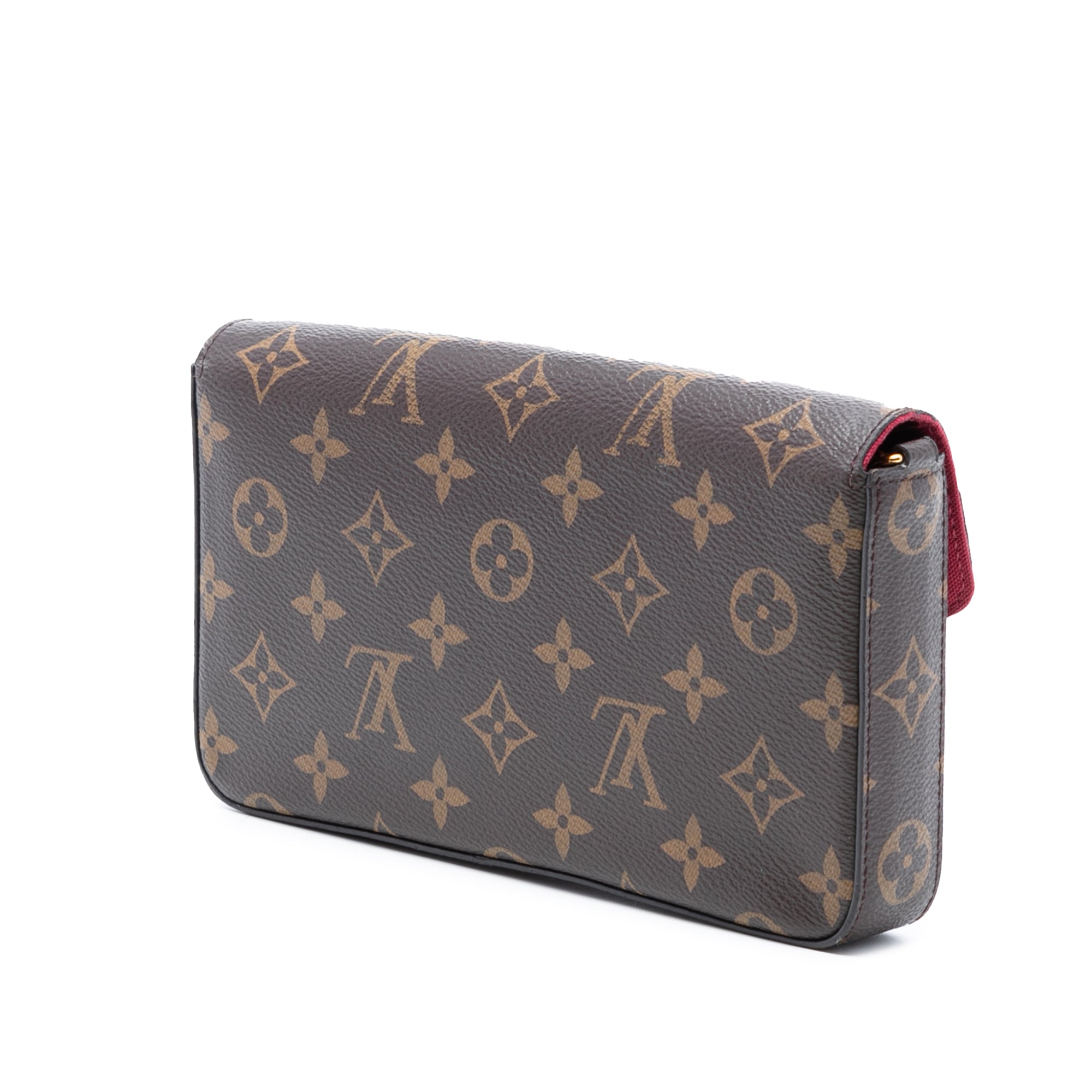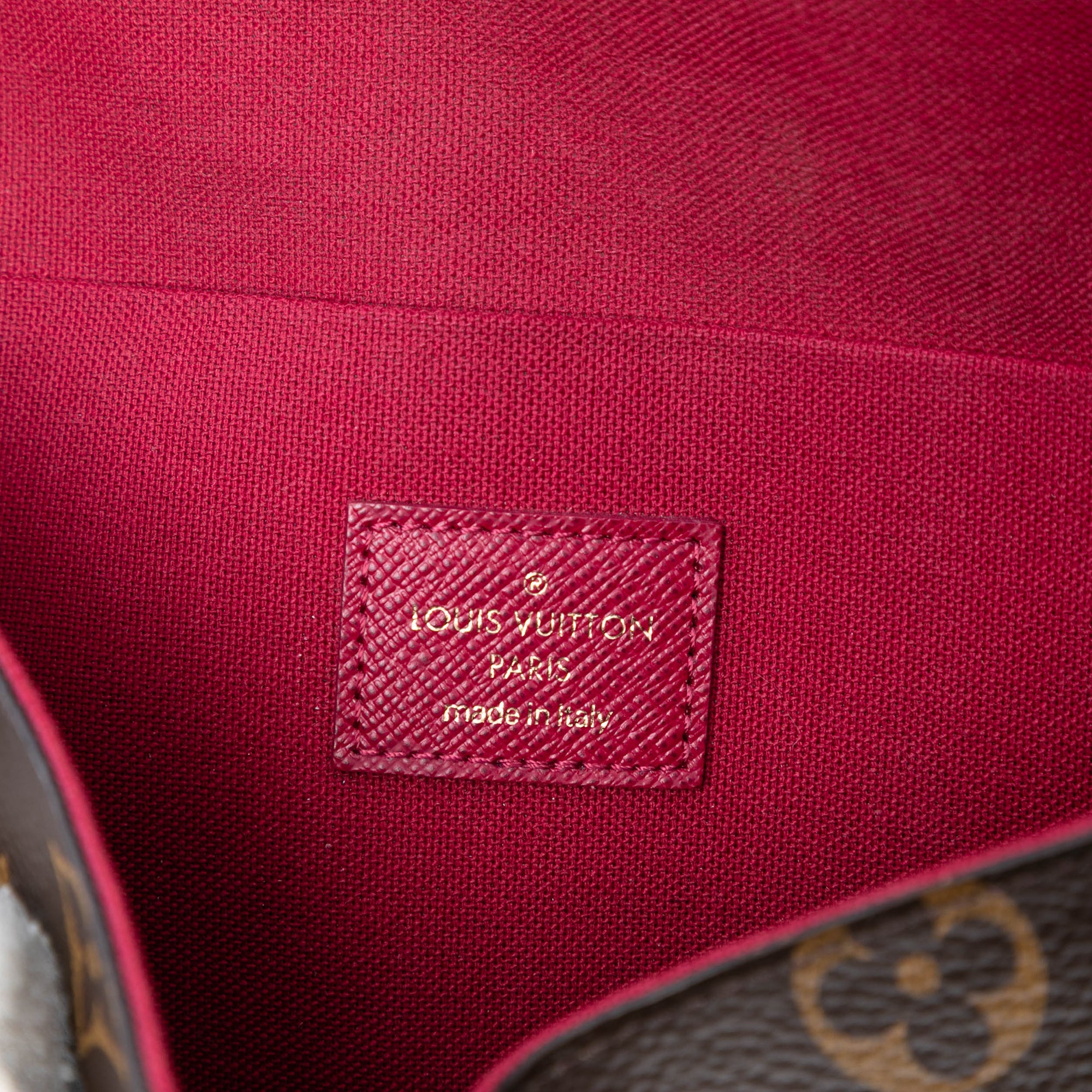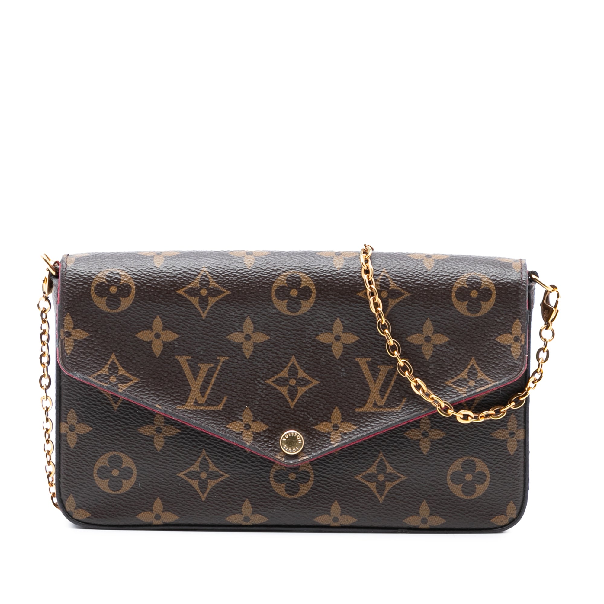 The Pochette Felicie crossbody bag features a monogram canvas body, a detachable gold-tone chain shoulder strap, a top flap with snap closure, an interior slip pocket, and pouch inclusions. Retail Price: 1641.00