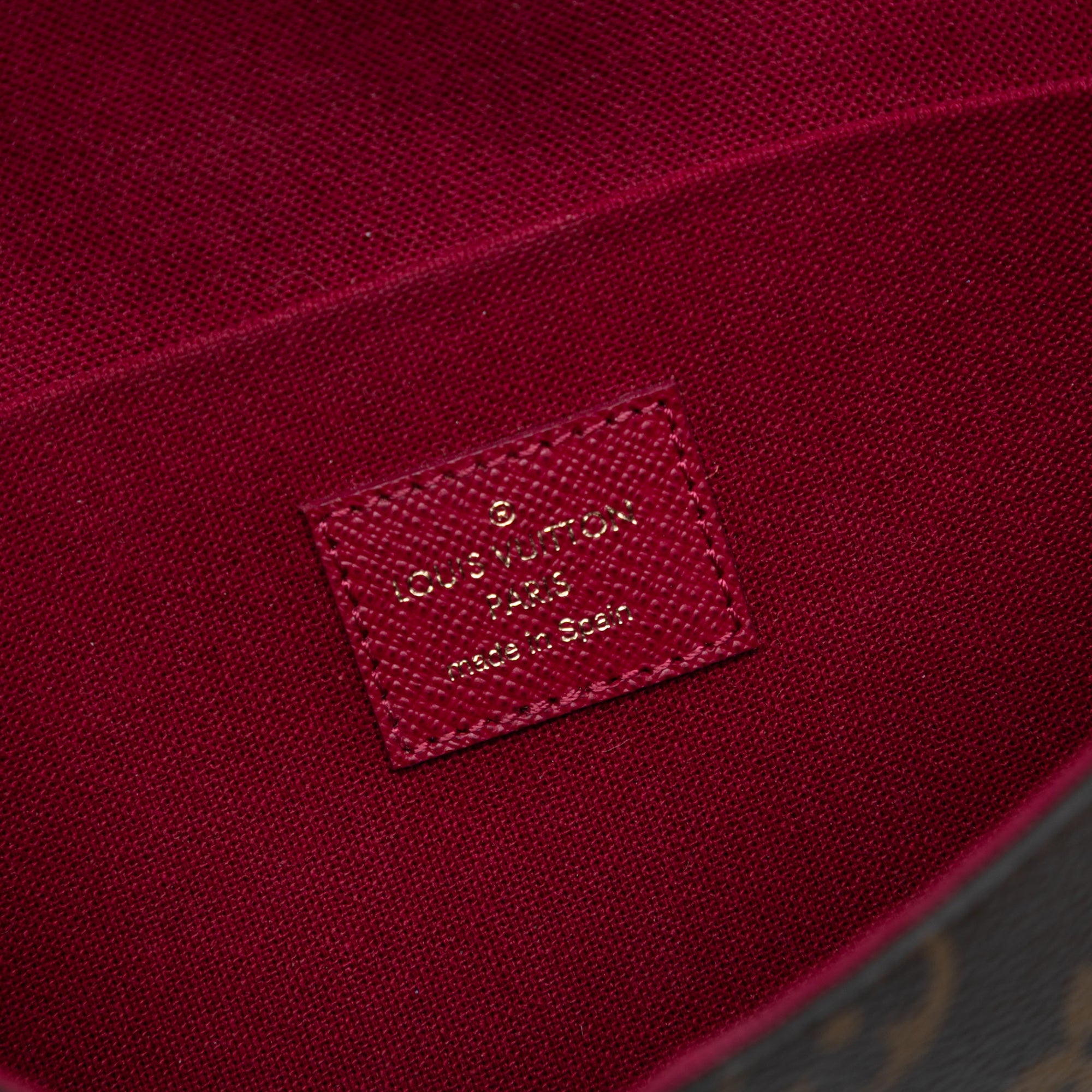 The Pochette Felicie crossbody bag features a monogram canvas body, a detachable gold-tone chain link shoulder strap, a top flap with snap closure, an interior slip pocket, and pouch inclusions. Retail Price: 1641.00