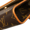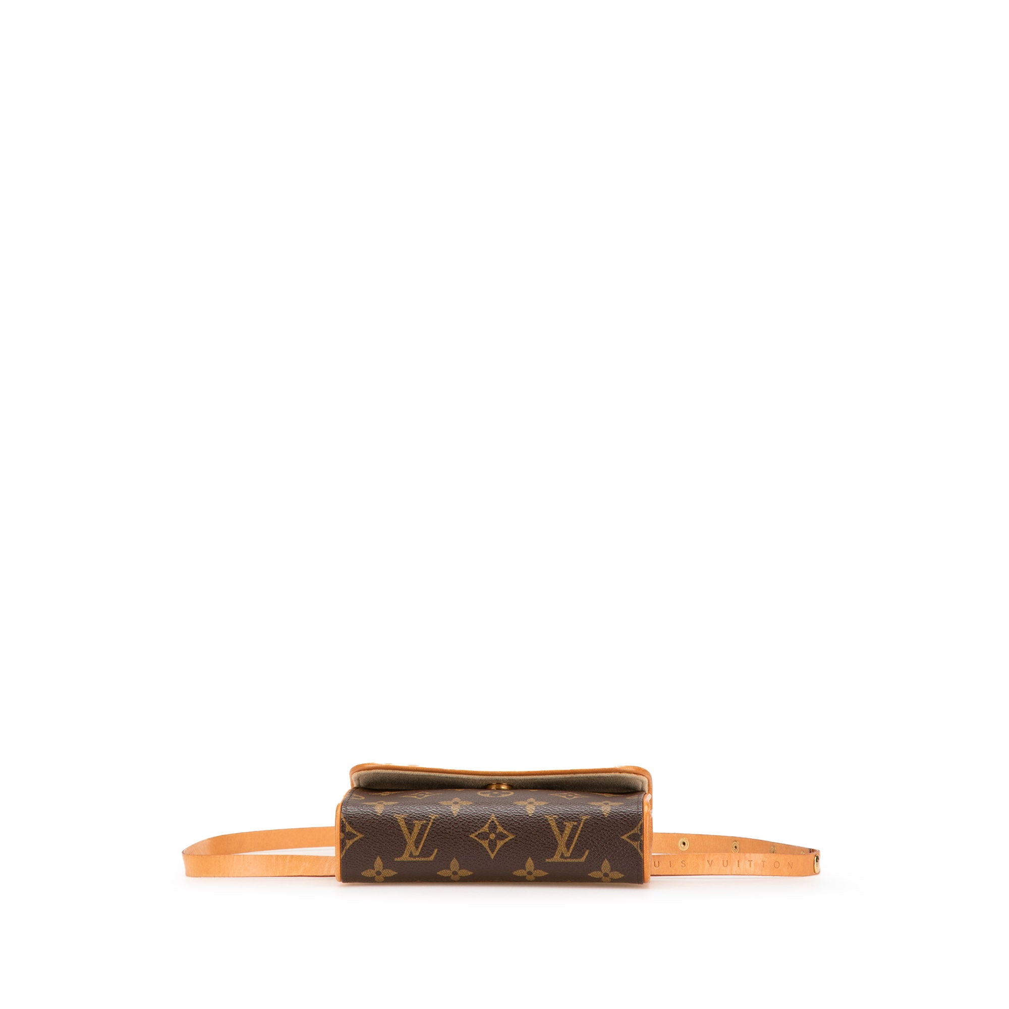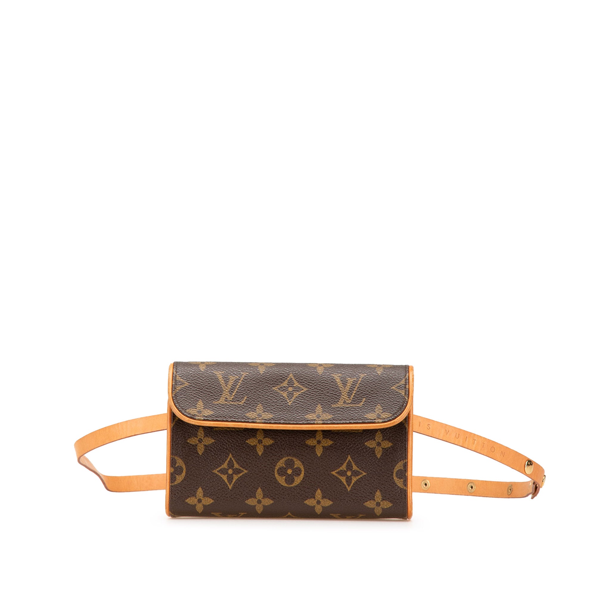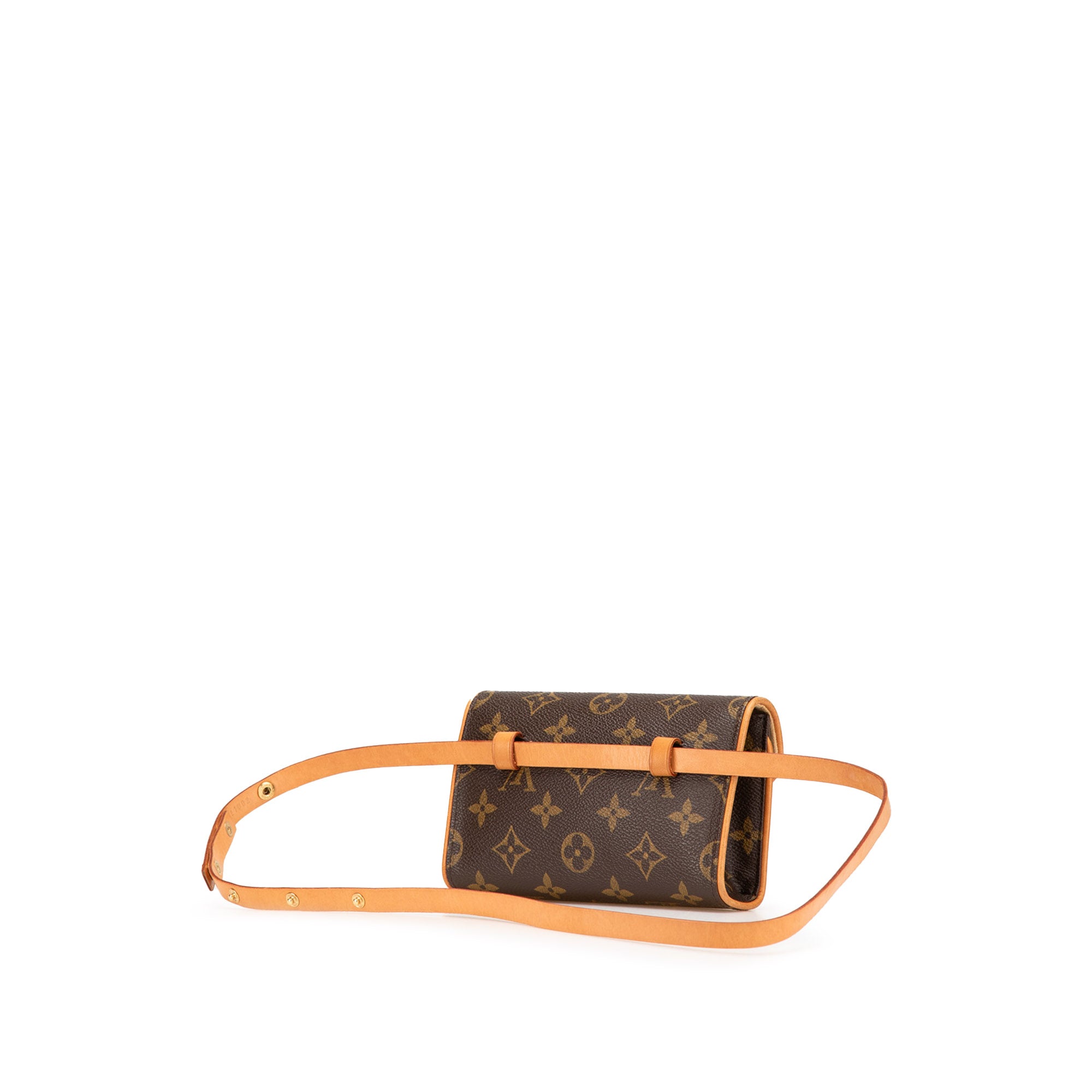 The Pochette Florentine features a monogram canvas body with vachetta leather trim, a flat vachetta leather waist strap, and a front flap with magnetic snap closure. Retail Price: 617.00