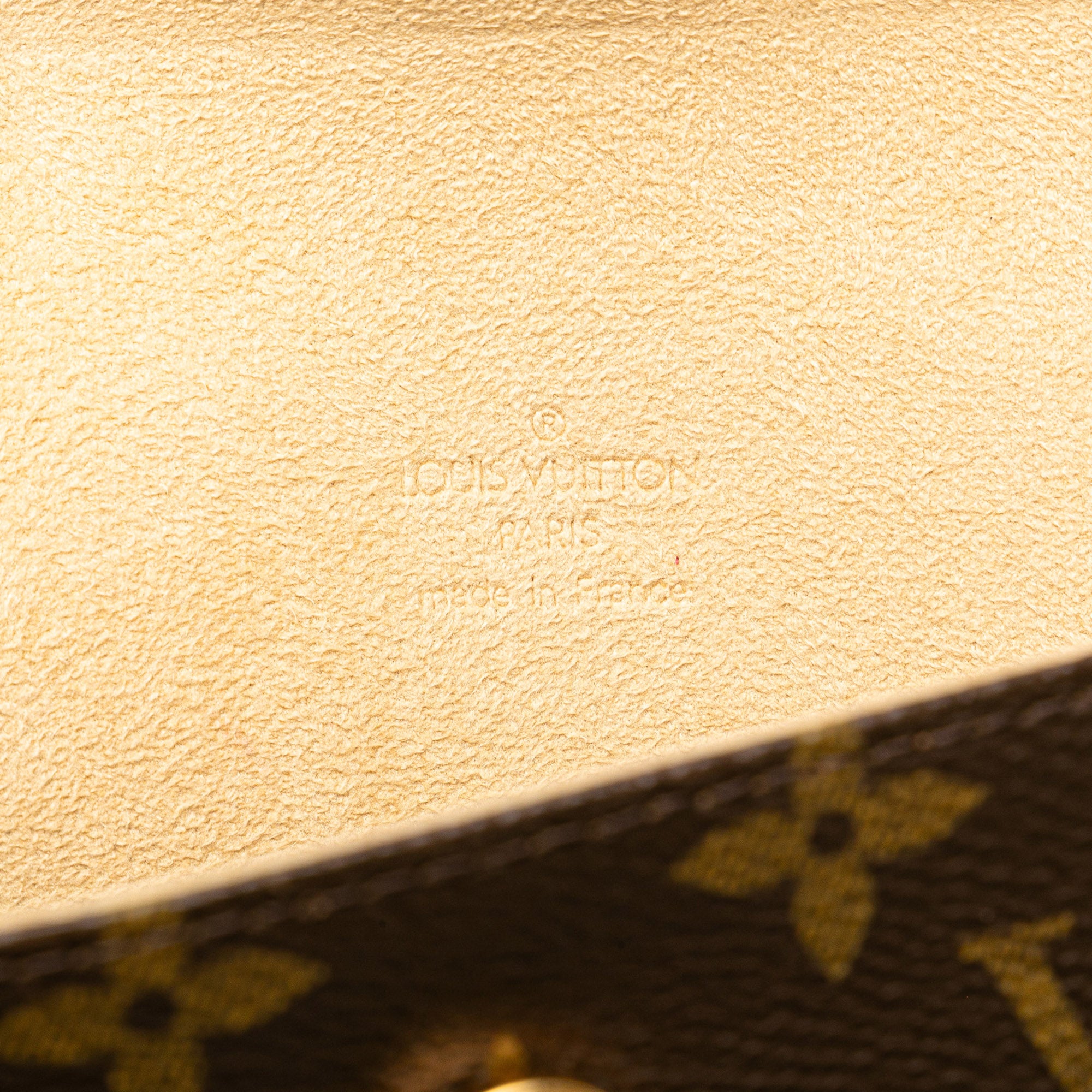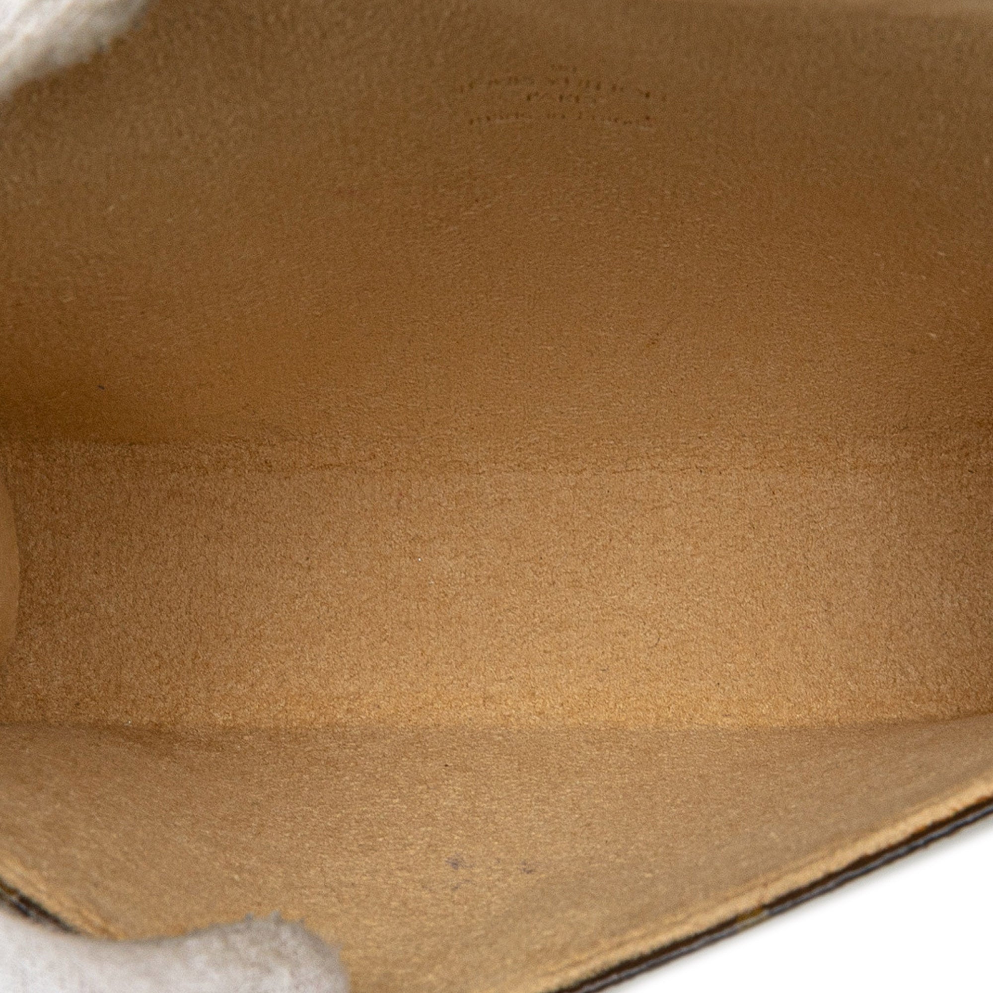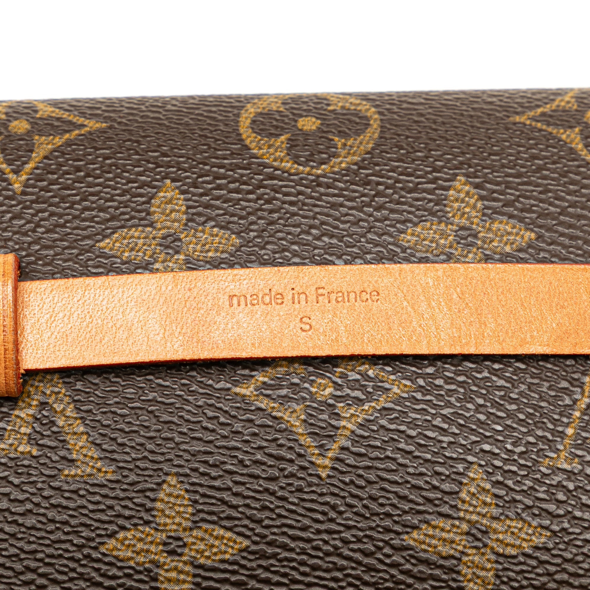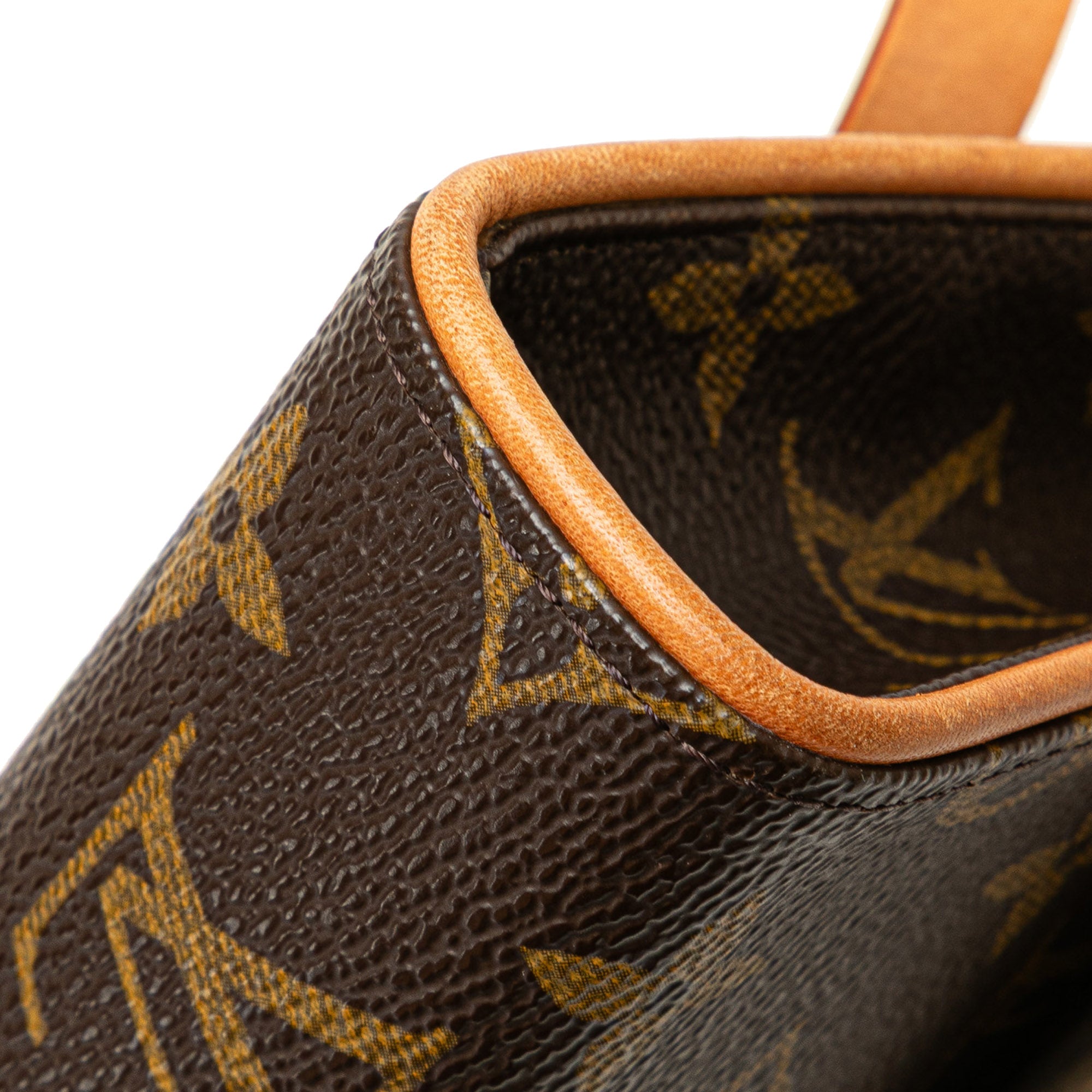The Pochette Florentine features a monogram canvas body with vachetta leather trim, a flat vachetta leather waist strap, and a front flap with magnetic snap closure. Retail Price: 617.00
