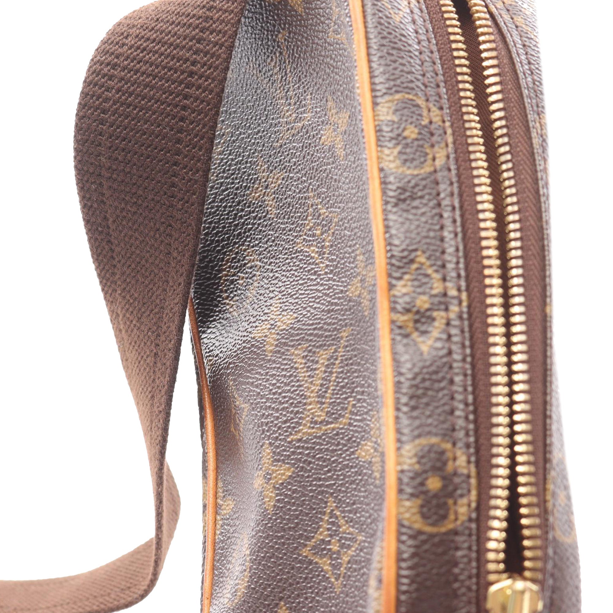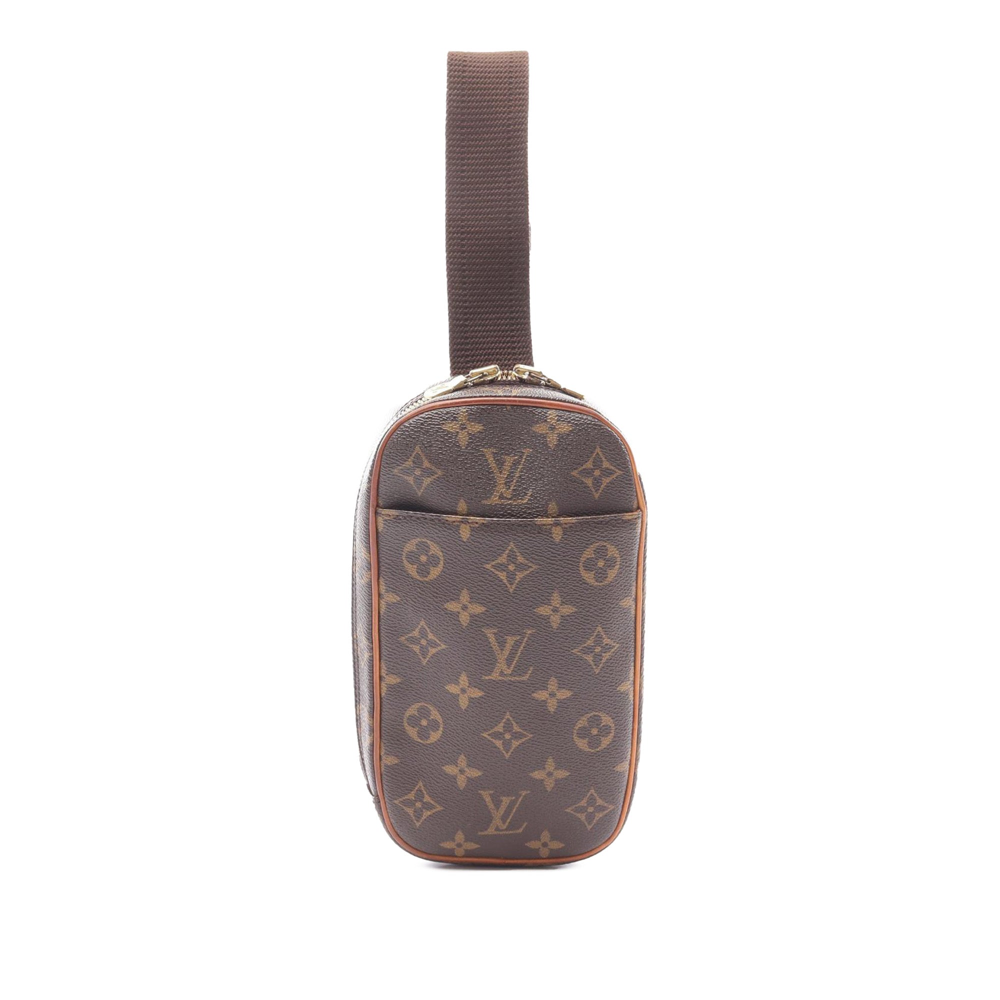 The Gange Pochette features a monogram canvas body, an adjustable strap, a top zip closure, and an exterior front slip pocket. Retail Price: 1180.00