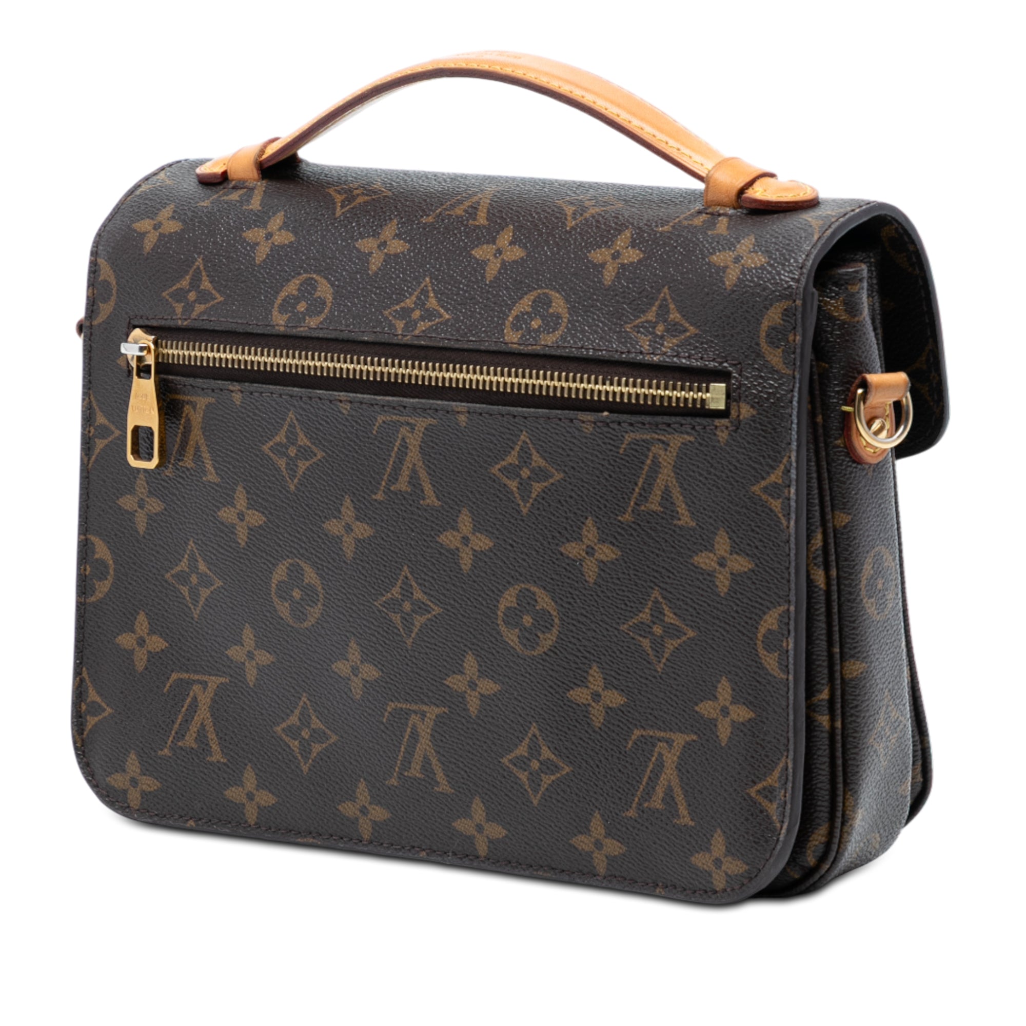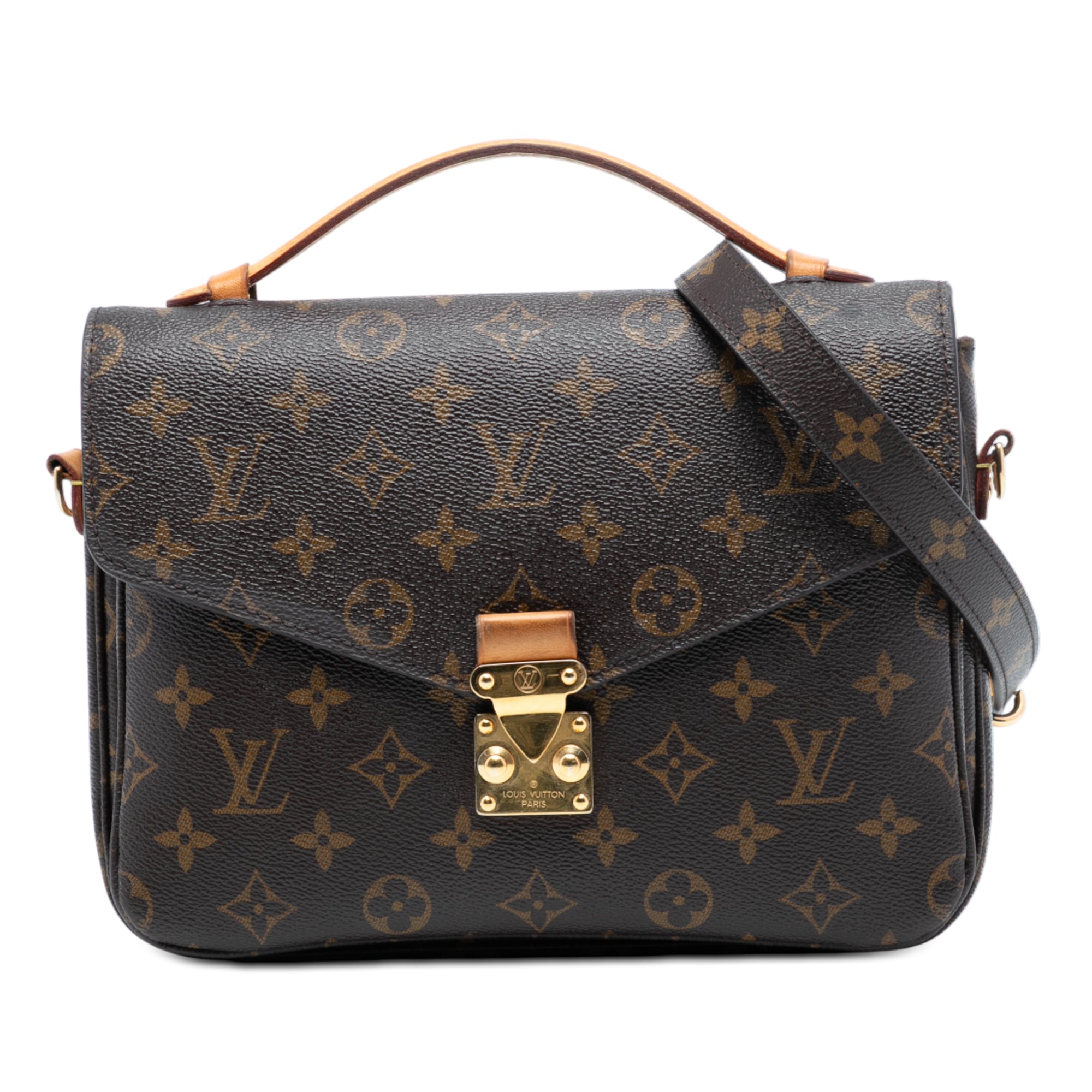 The Pochette Metis features a monogram canvas body, a flat vachetta leather top handle, a detachable flat shoulder strap, a front flap with an S-lock closure, an exterior back zip pocket, and an interior slip pocket. Retail Price: 2200.00