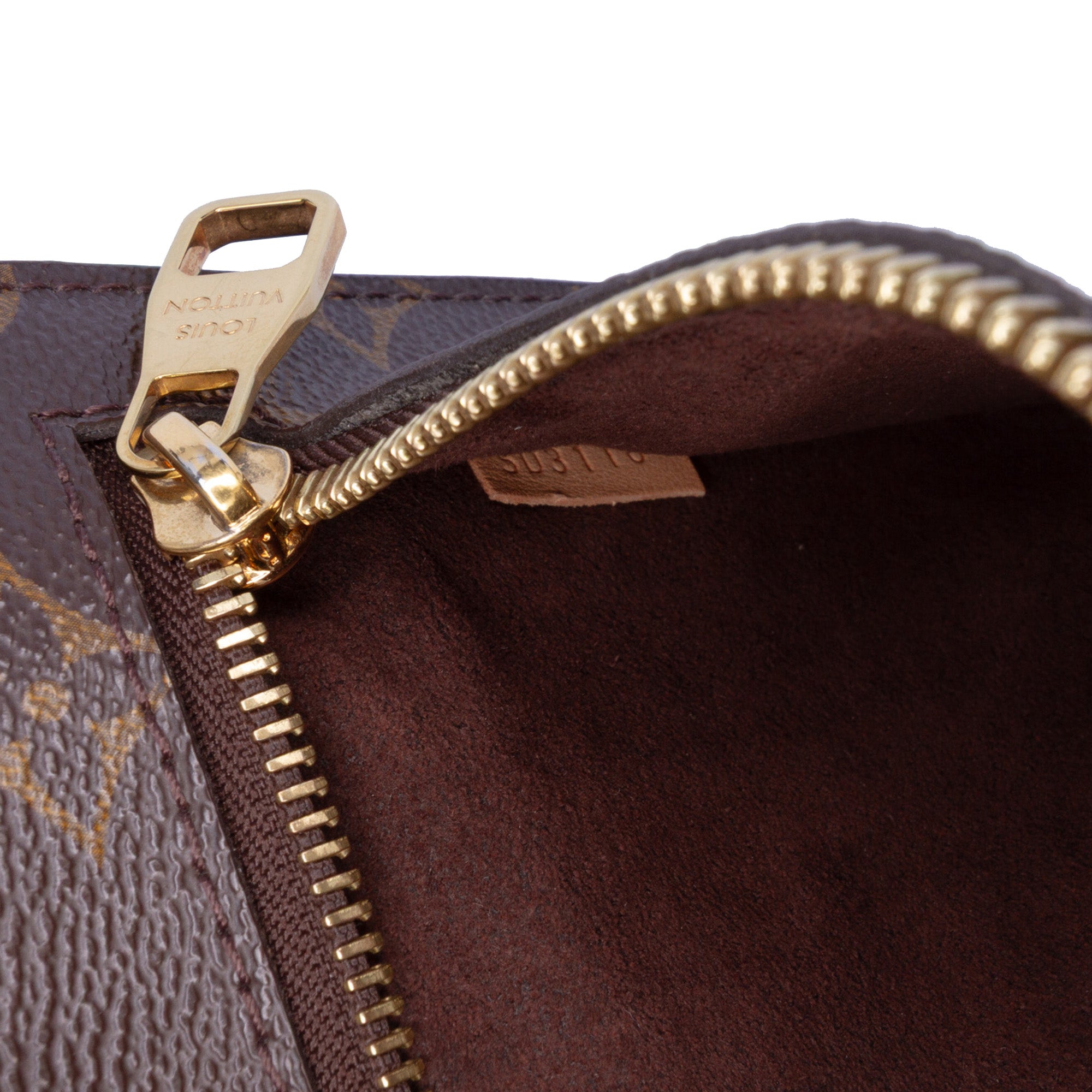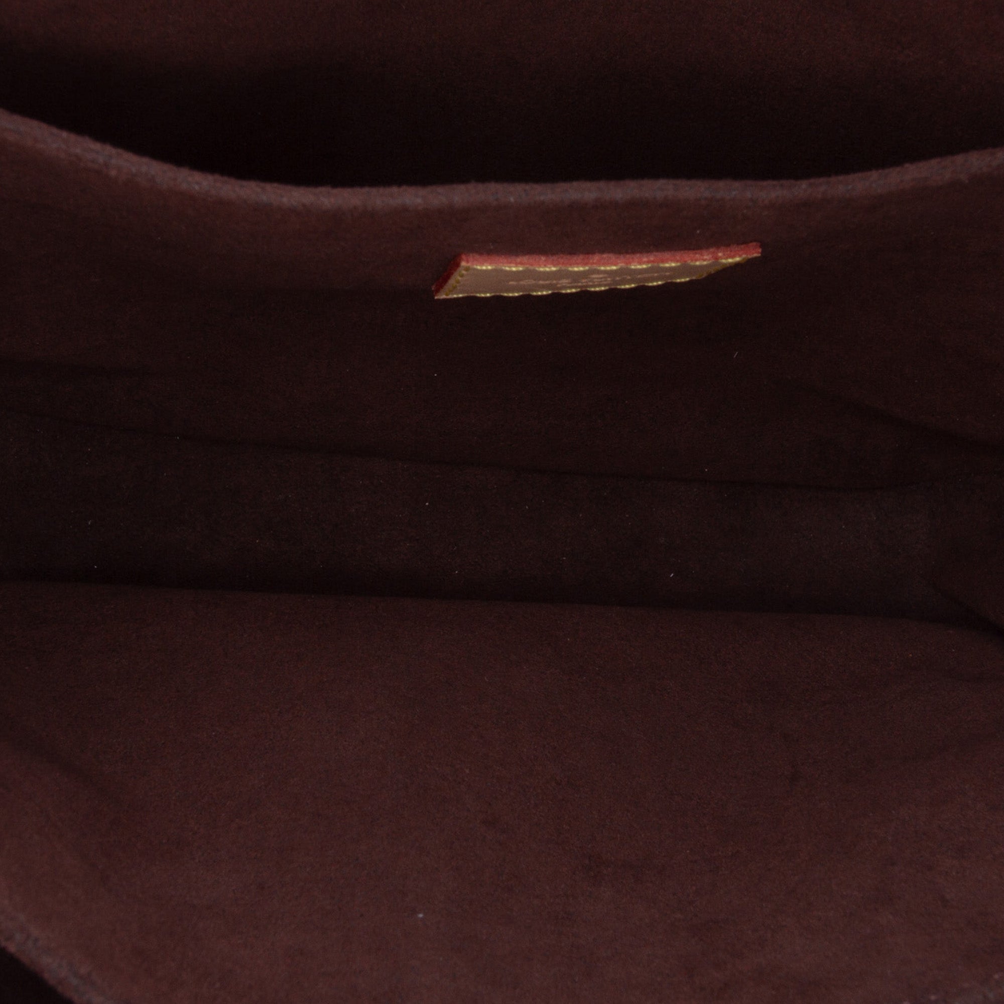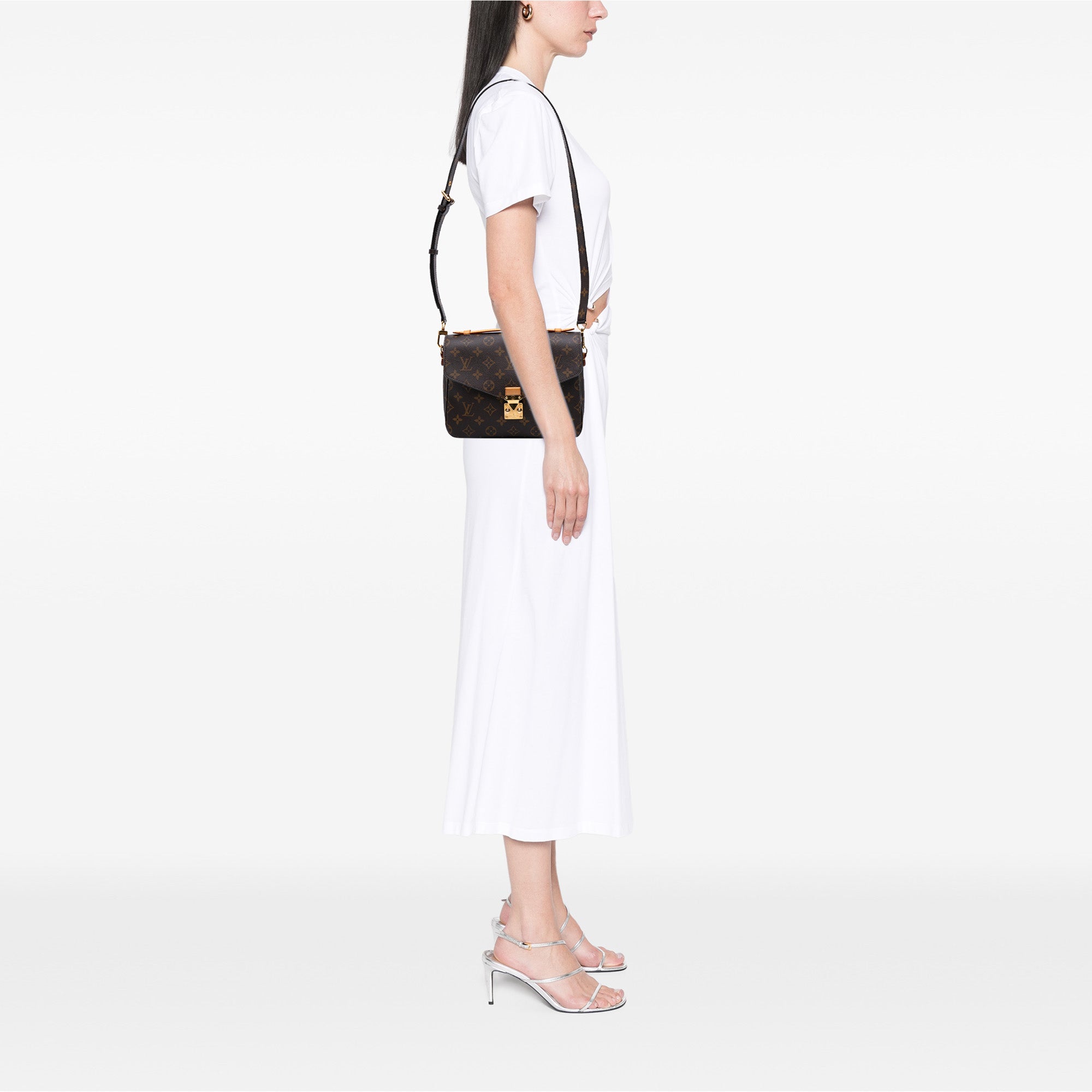 The Pochette Metis features a monogram canvas body, a flat vachetta leather top handle, a detachable flat shoulder strap, a front flap with an S-lock closure, an exterior zip pocket, and interior slip pockets. Retail Price: 2615.00