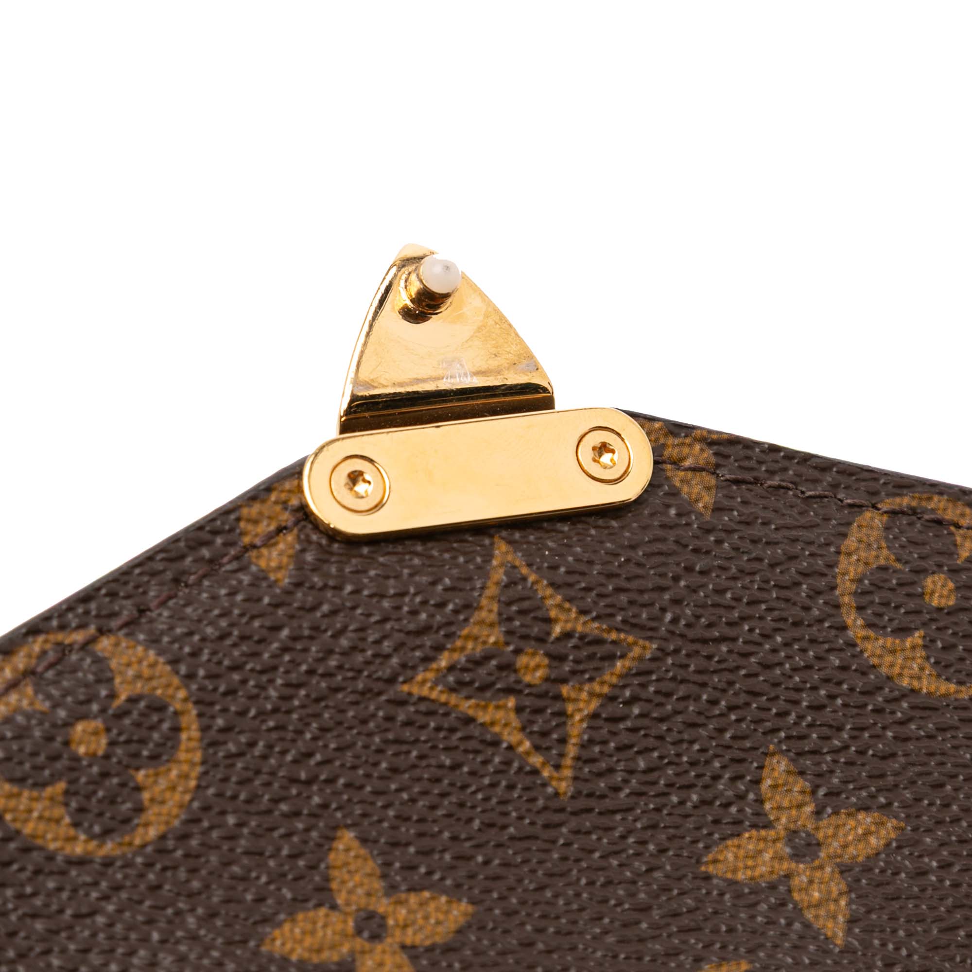 The Pochette Metis features a monogram canvas body, a flat vachetta leather top handle, a detachable flat shoulder strap, a front flap with an S-lock closure, an exterior zip pocket, and interior slip pockets. Retail Price: 2425.00