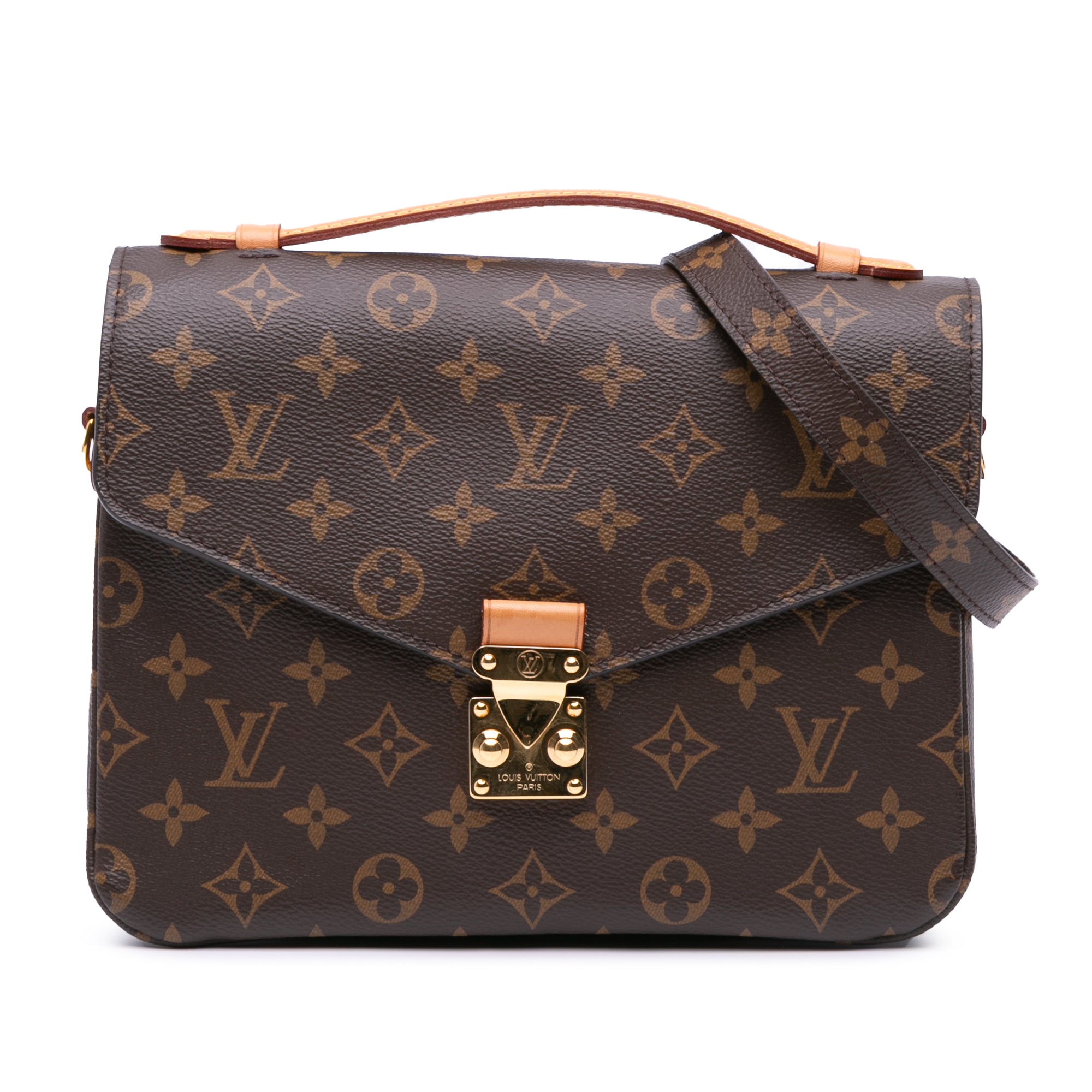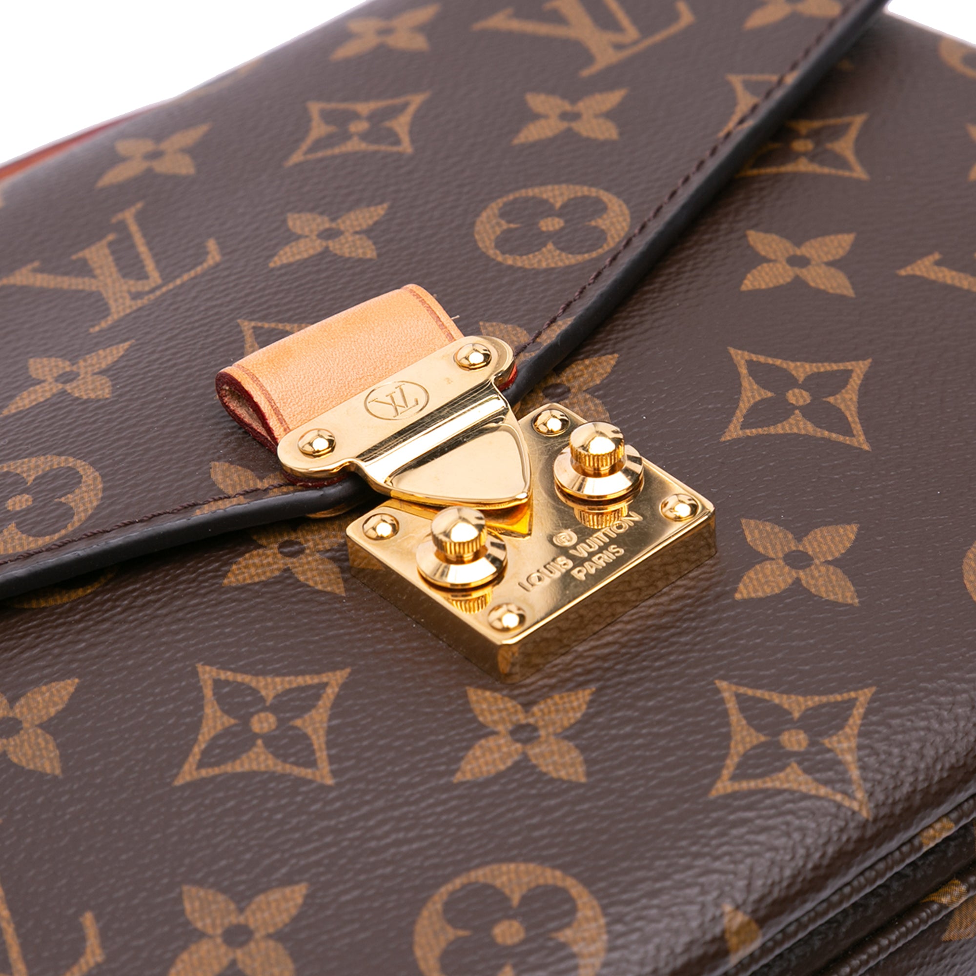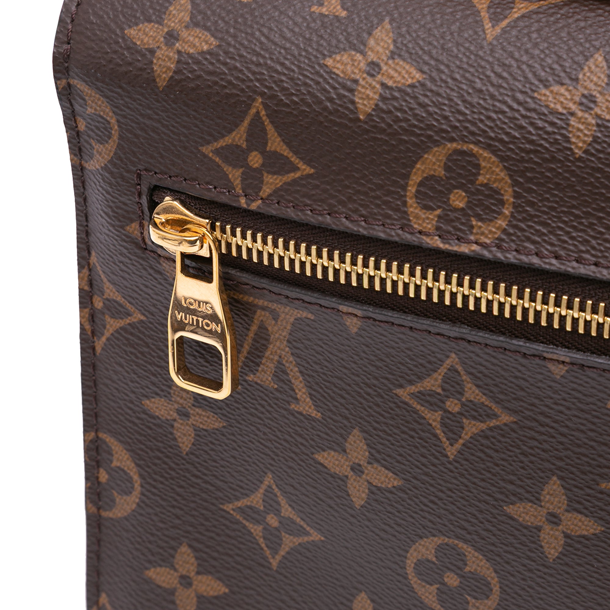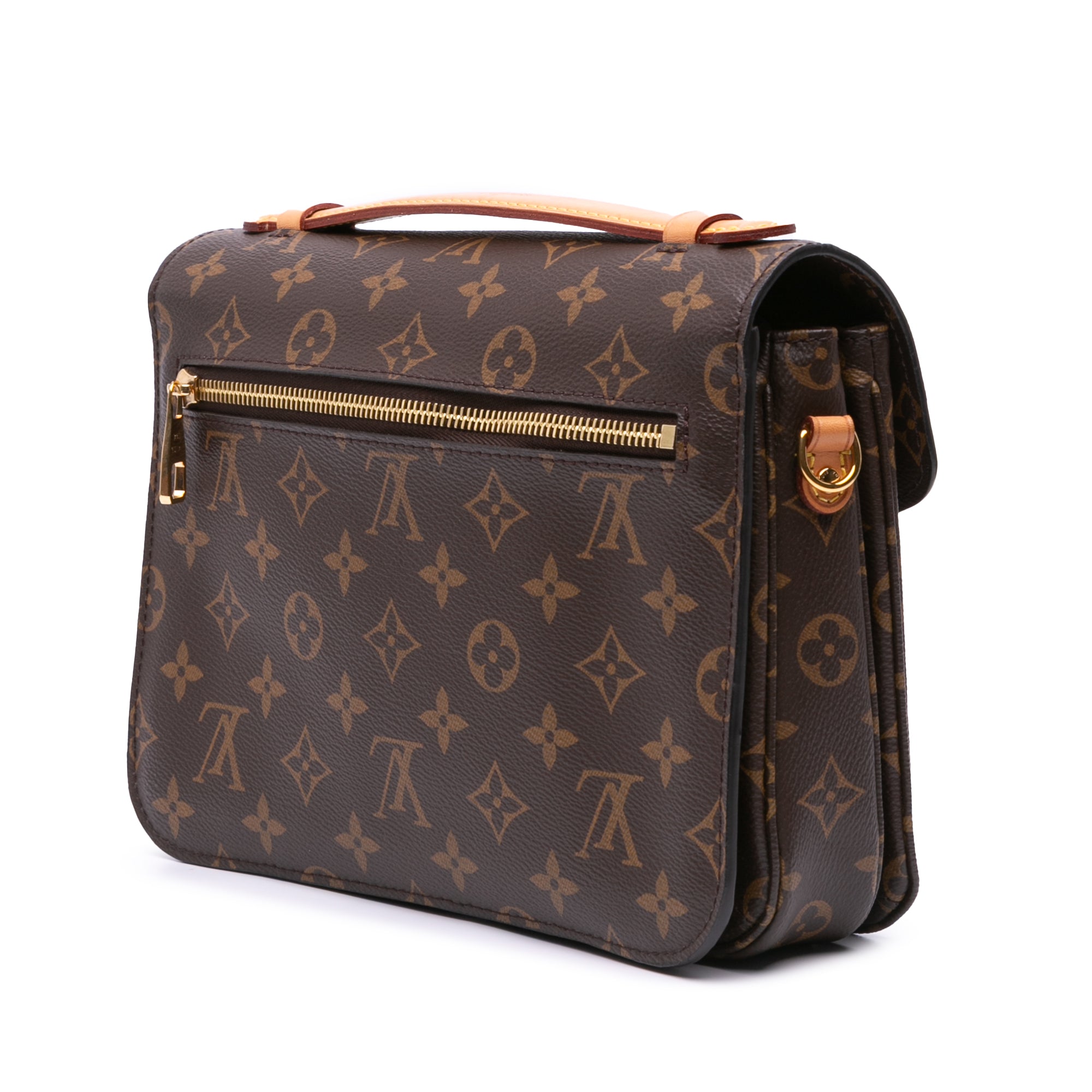 The Pochette Metis features a monogram canvas body, a flat vachetta leather top handle, a detachable flat shoulder strap, a front flap with an S-lock closure, an exterior zip pocket, and interior slip pockets. Retail Price: 2380.00