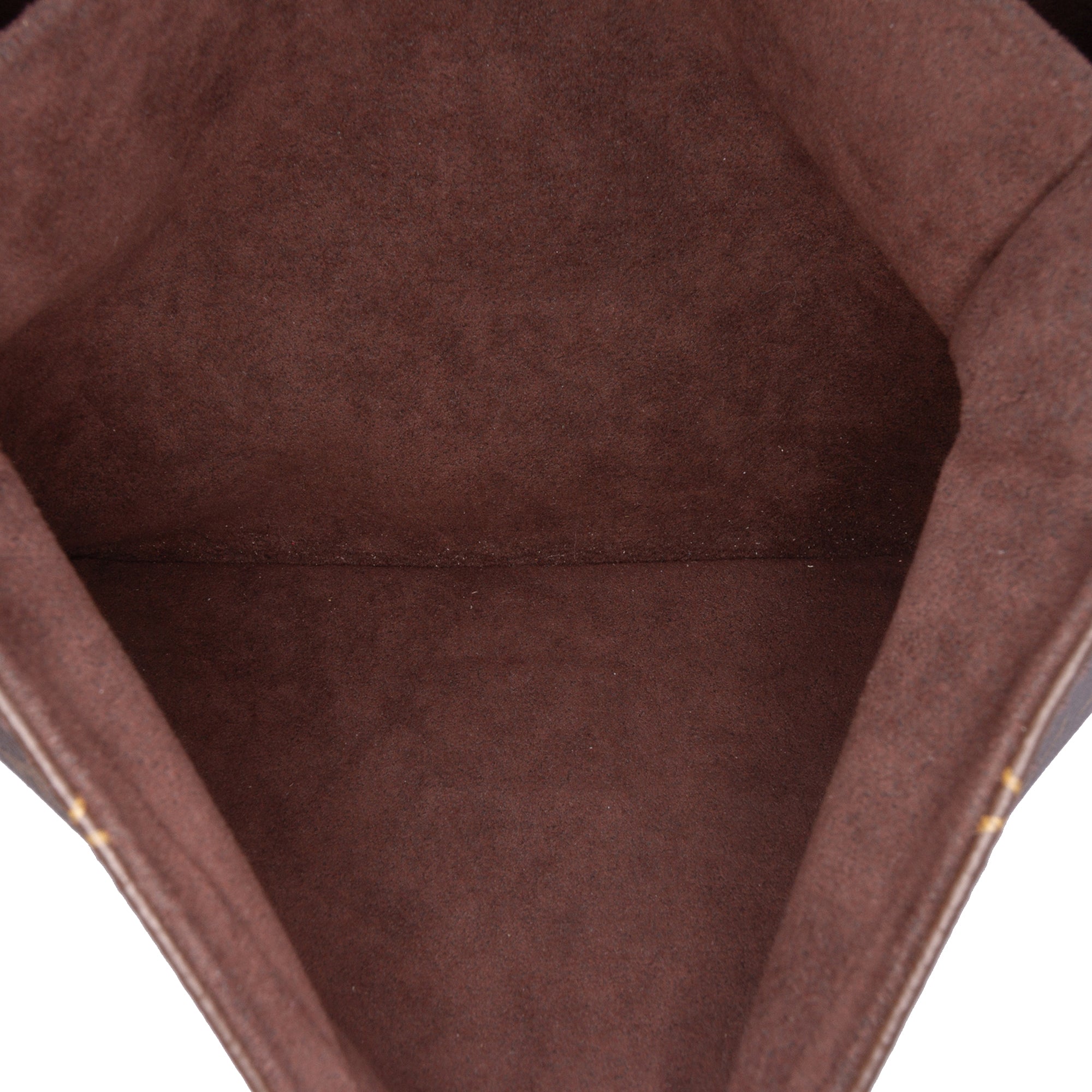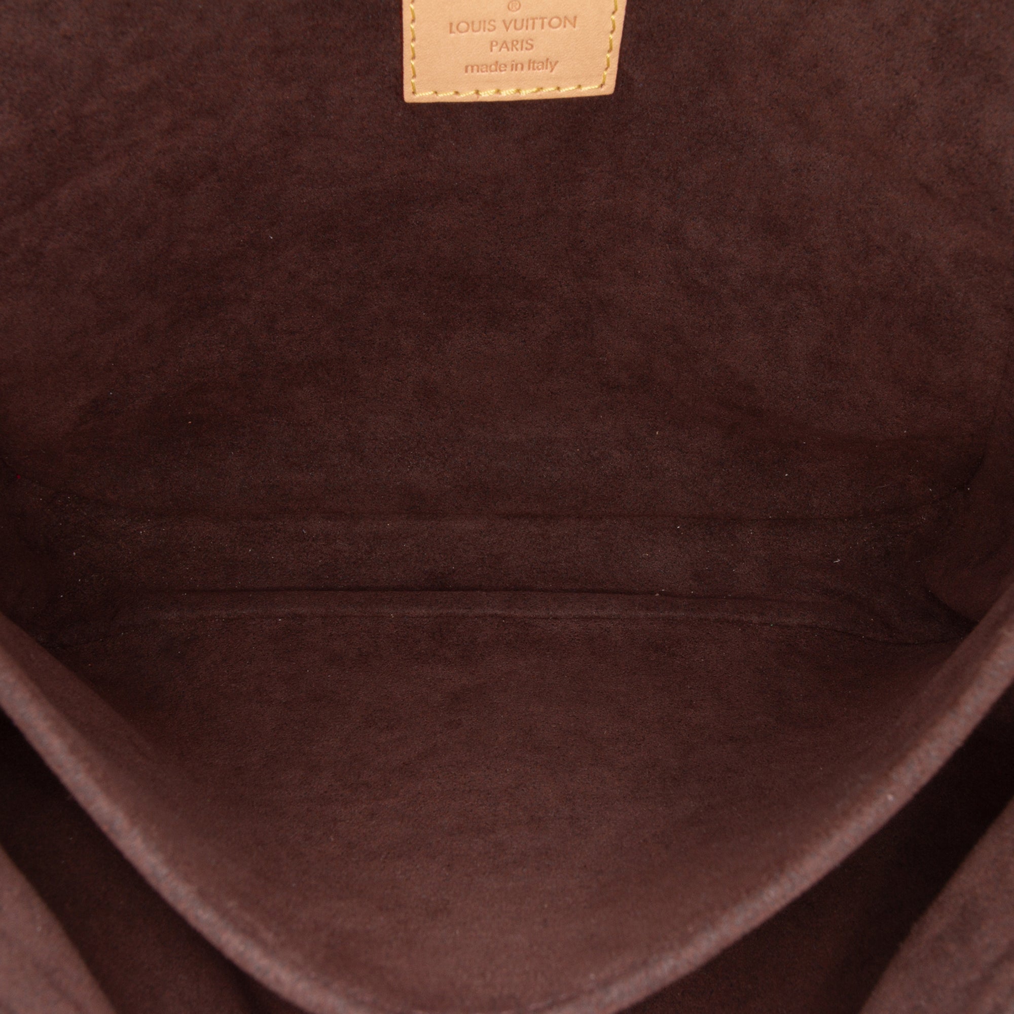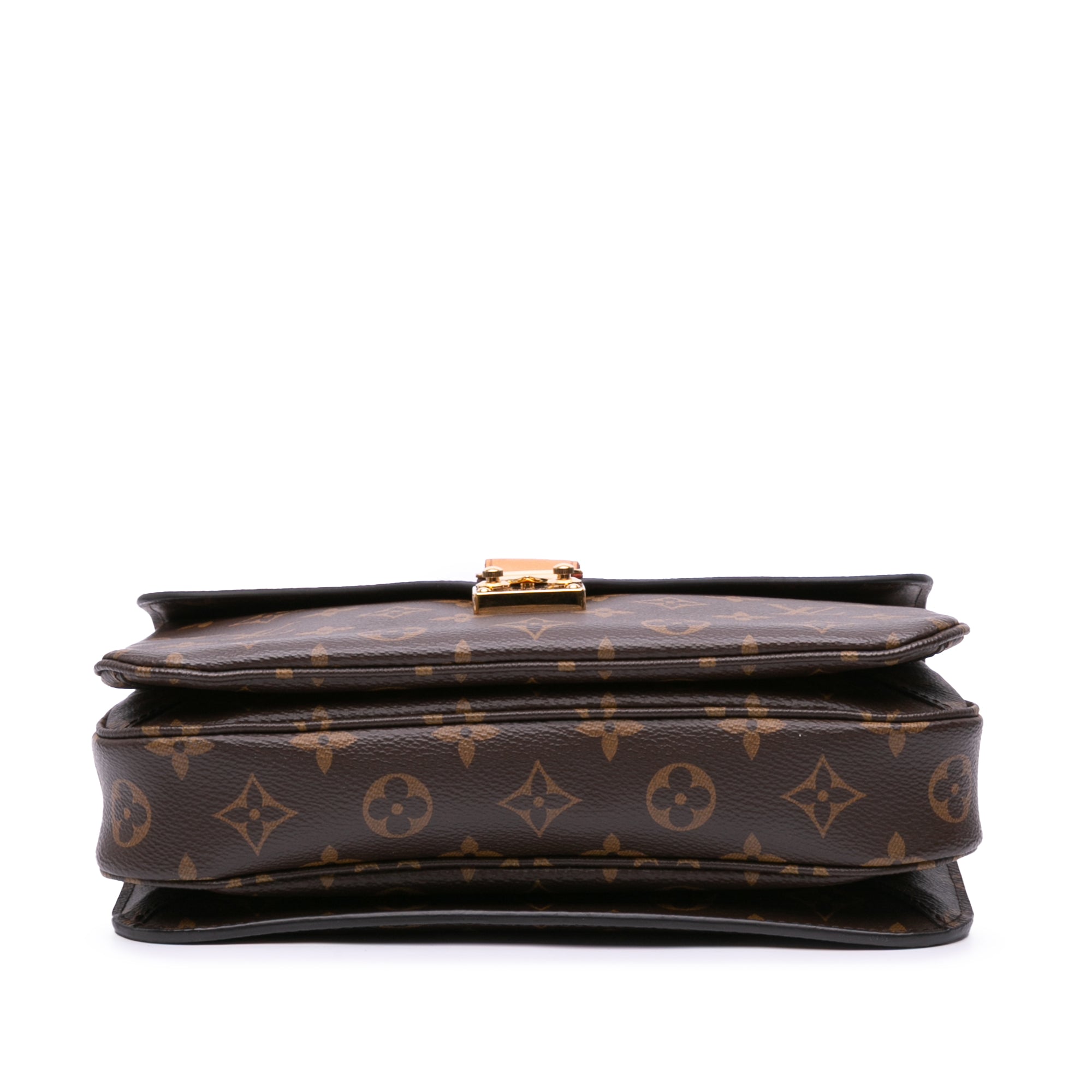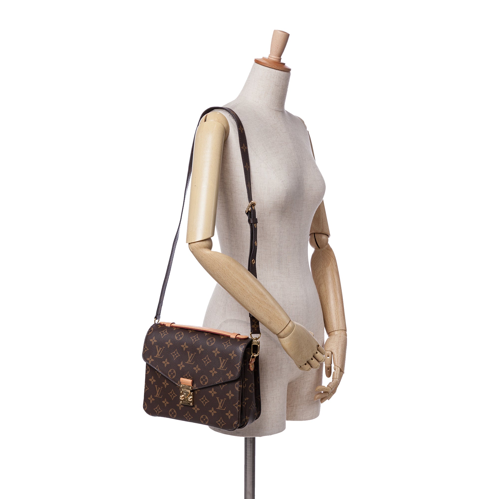 The Pochette Metis features a monogram canvas body, a flat vachetta leather top handle, a detachable flat shoulder strap, a front flap with an S-lock closure, an exterior zip pocket, and interior slip pockets. Retail Price: 2380.00