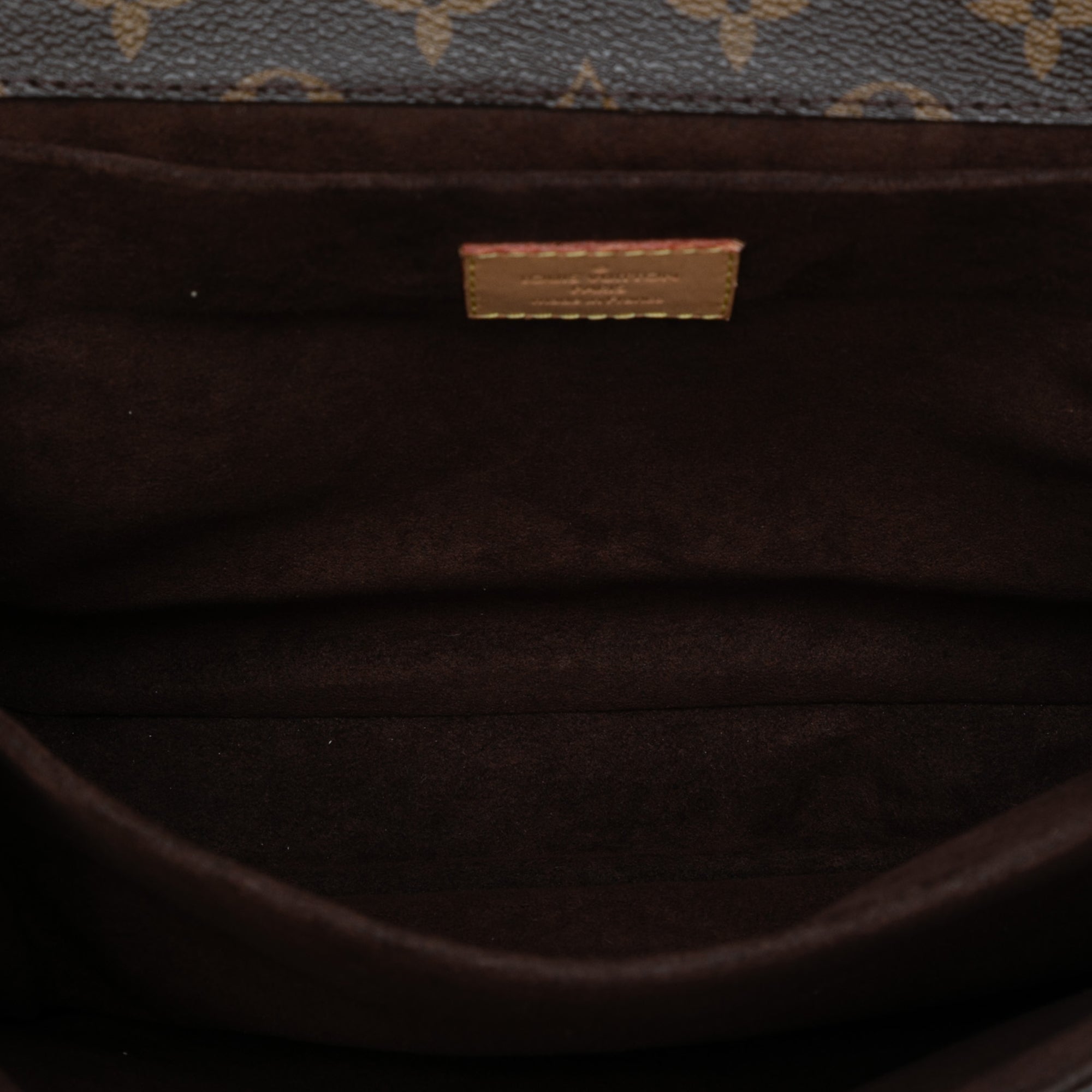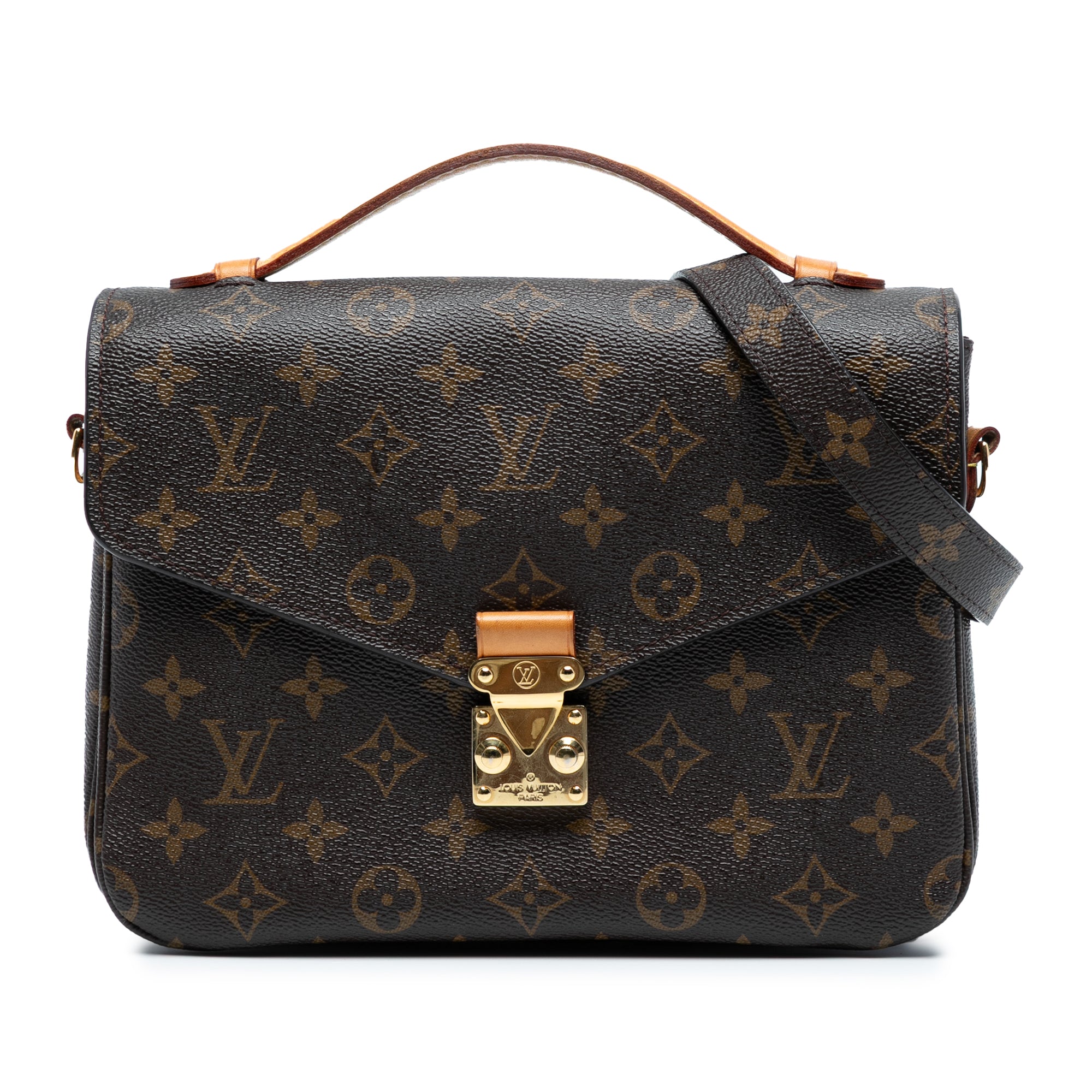 The Pochette Metis features a monogram canvas body, a flat vachetta leather top handle, a detachable flat shoulder strap, a front flap with an S-lock closure, an exterior zip pocket, and an interior slip pocket. Retail Price: 2400.00
