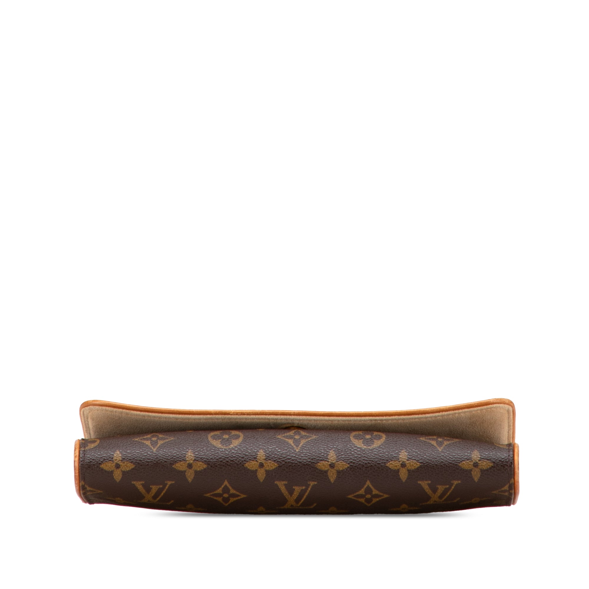 The Monogram Pochette Twin GM features a monogram canvas body, flat leather shoulder strap, and a front flap with magnetic snap closure, interior slip pocket. Retail Price: 990.00