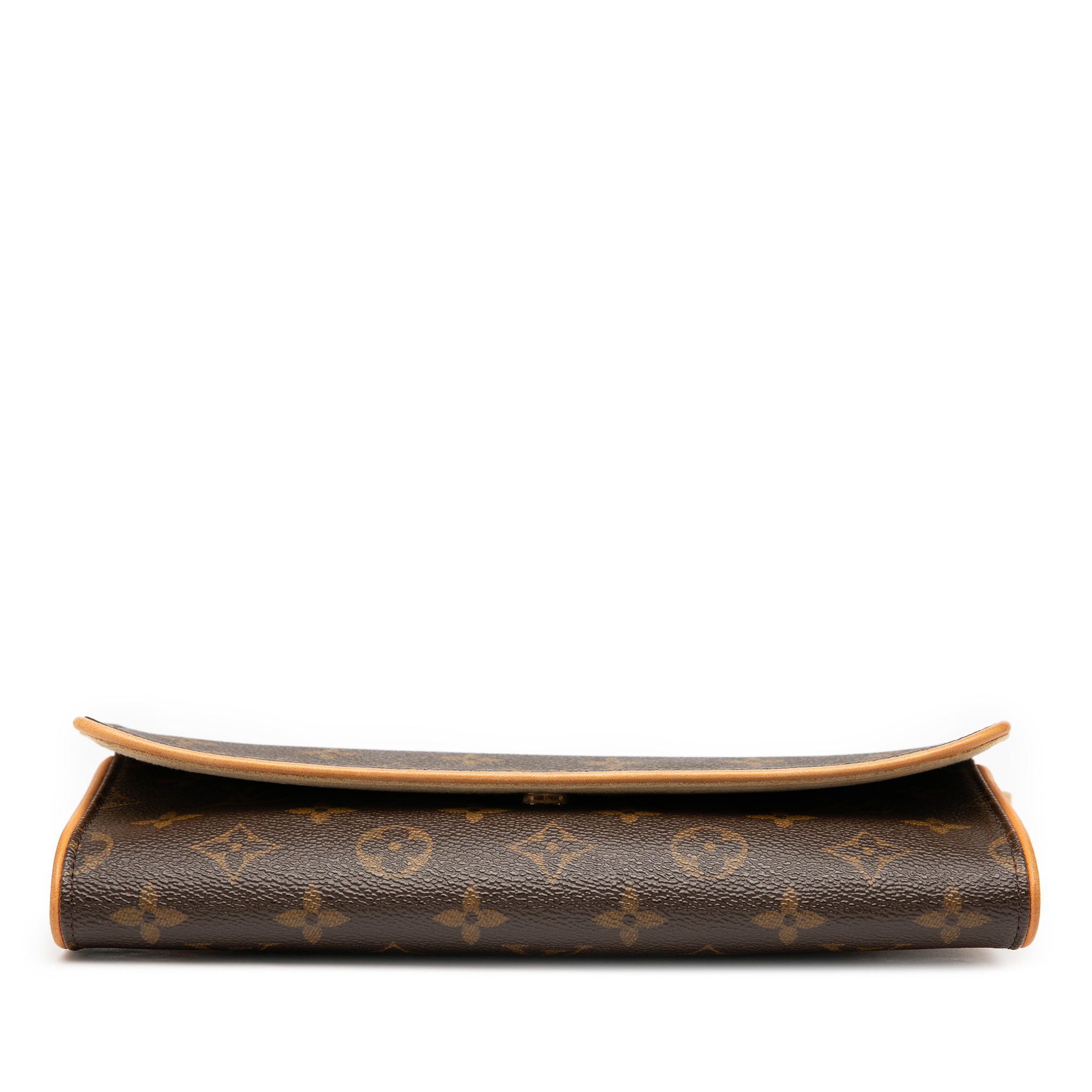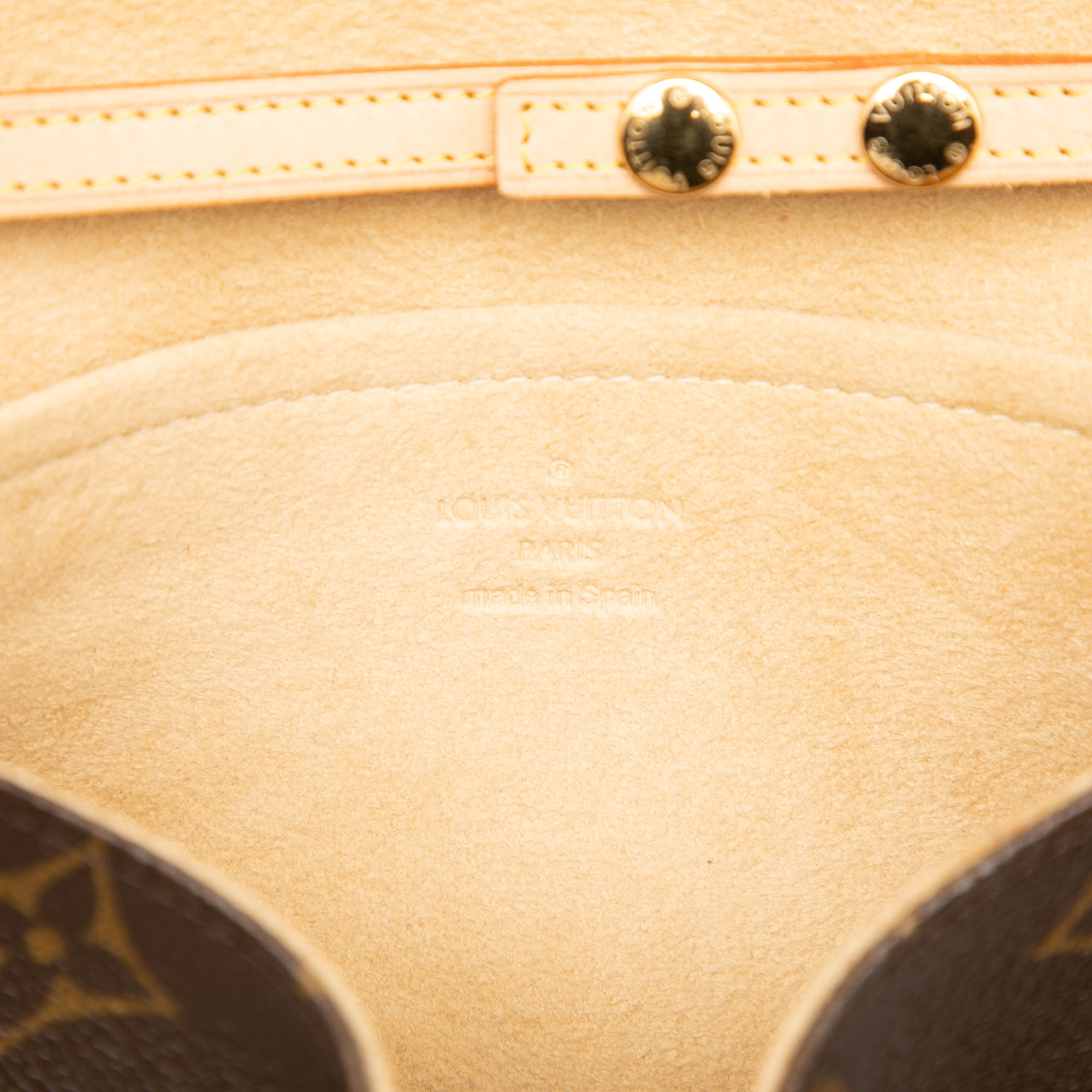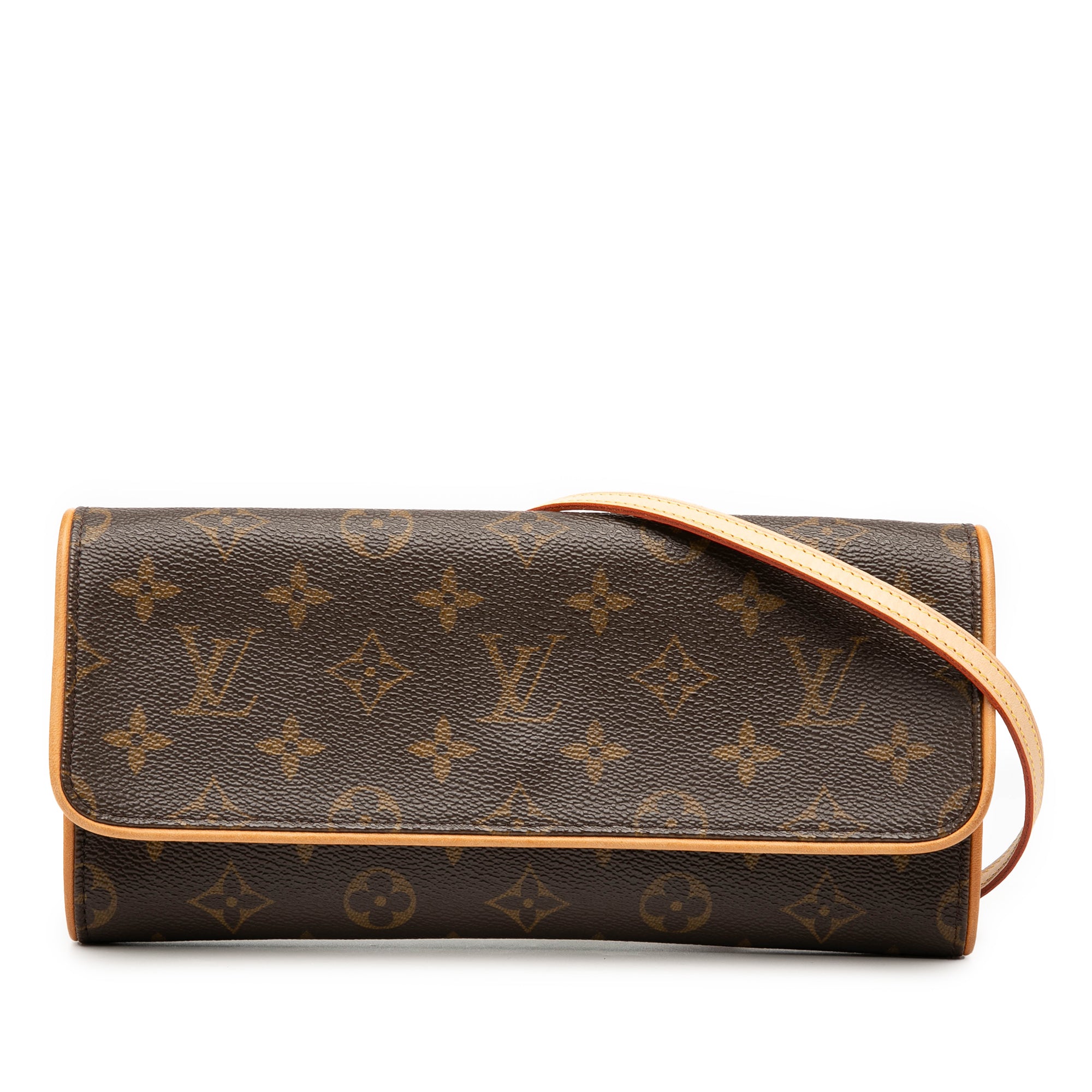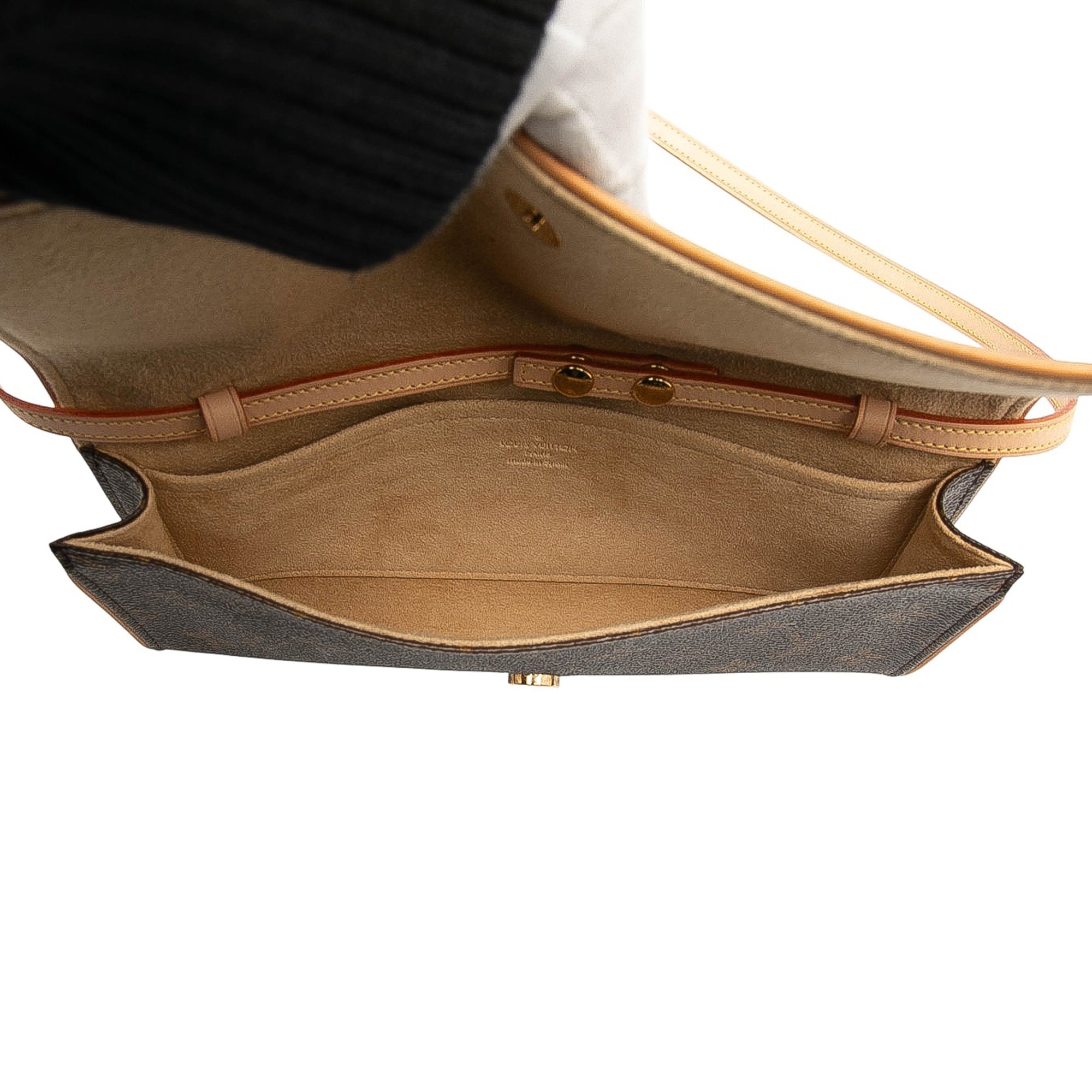 The Pochette Twin GM features a monogram canvas body with vachetta leather trim, a flat vachetta leather strap, a front flap with magnetic snap closure, and an interior slip pocket. Retail Price: 990.00