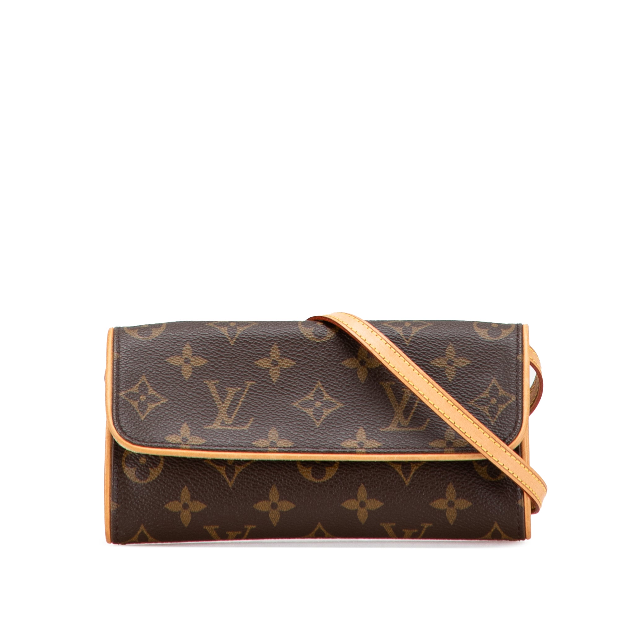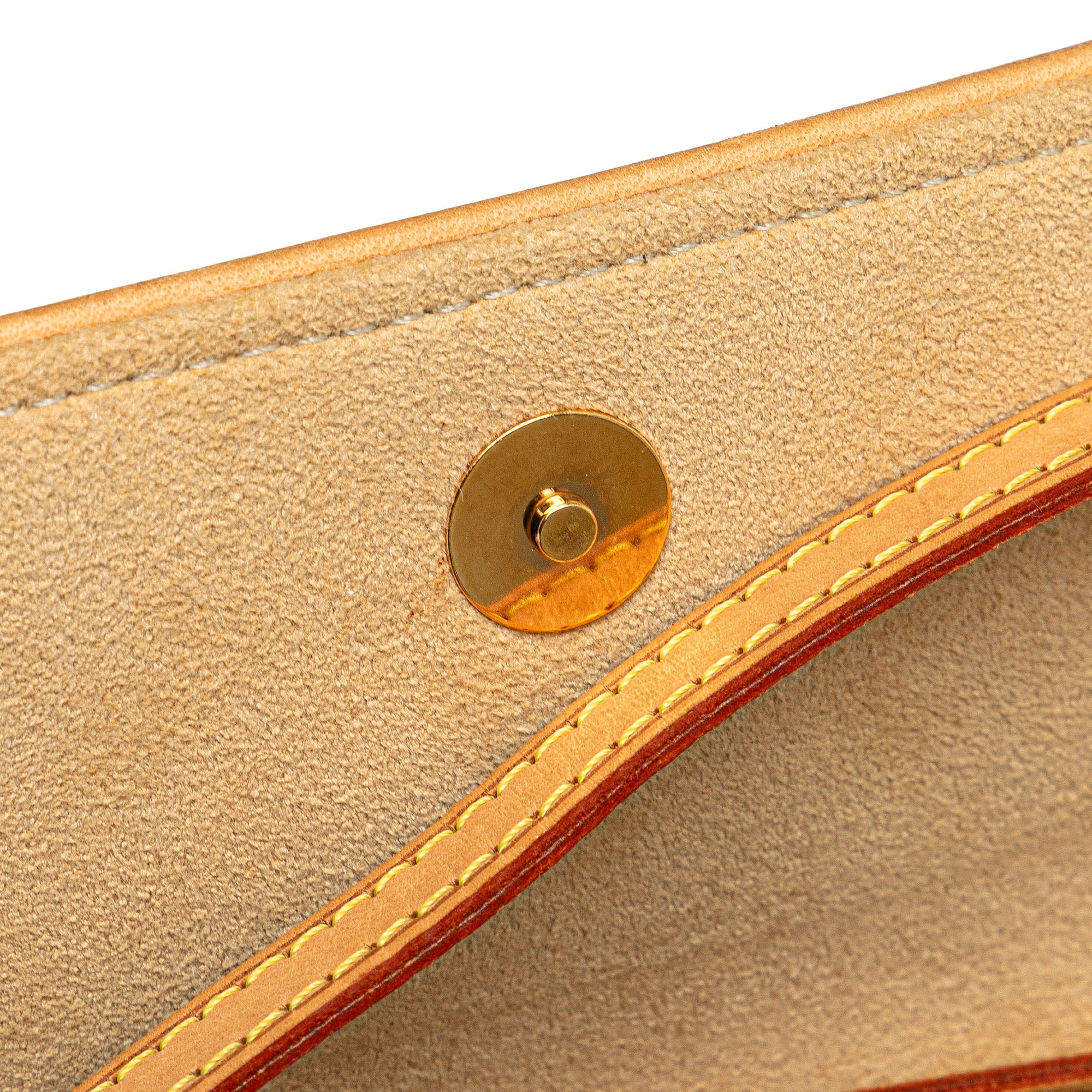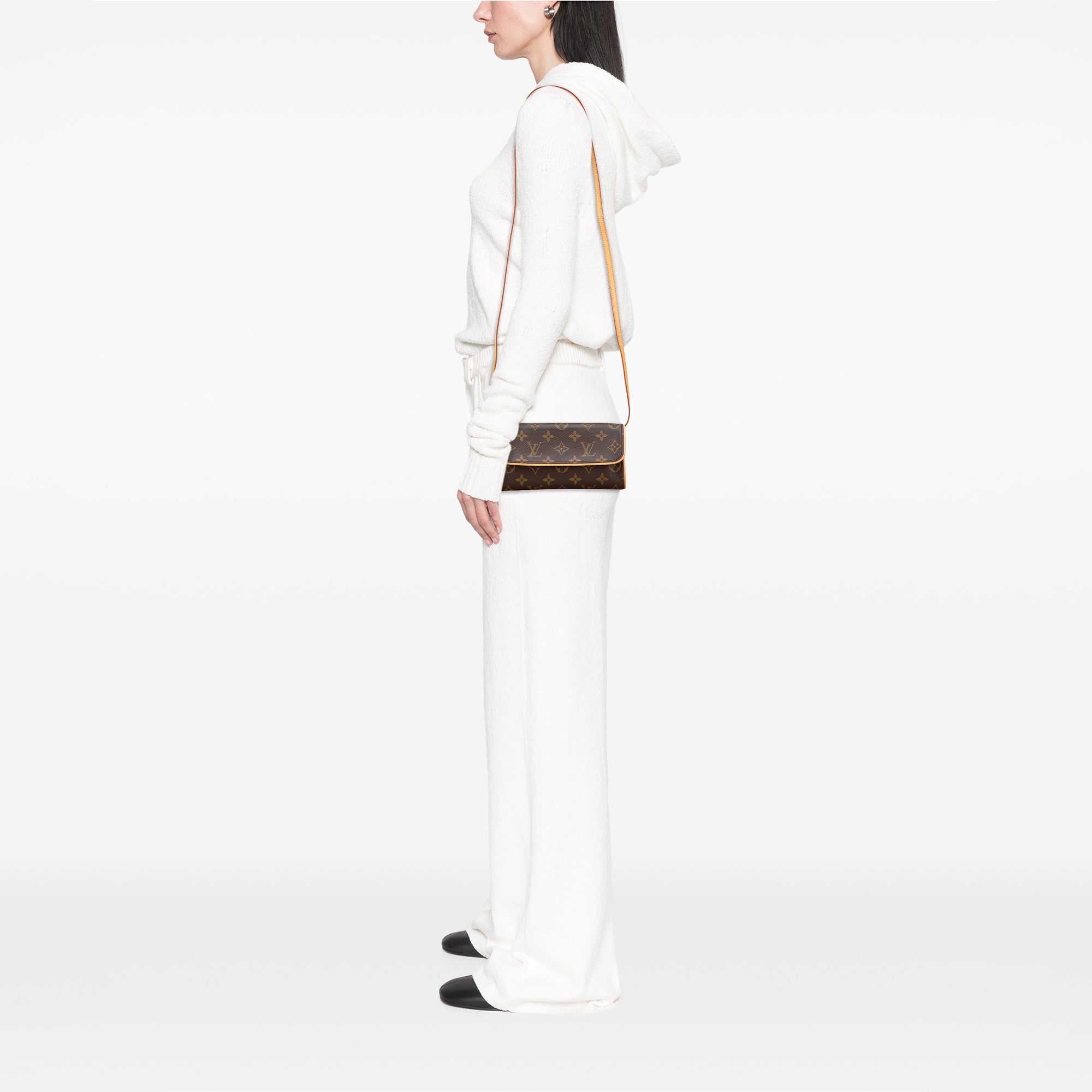 The Pochette Twin PM features a monogram canvas body with vachetta leather trim, a flat vachetta leather shoulder strap, and a front flap with magnetic snap closure. Retail Price: 890.00