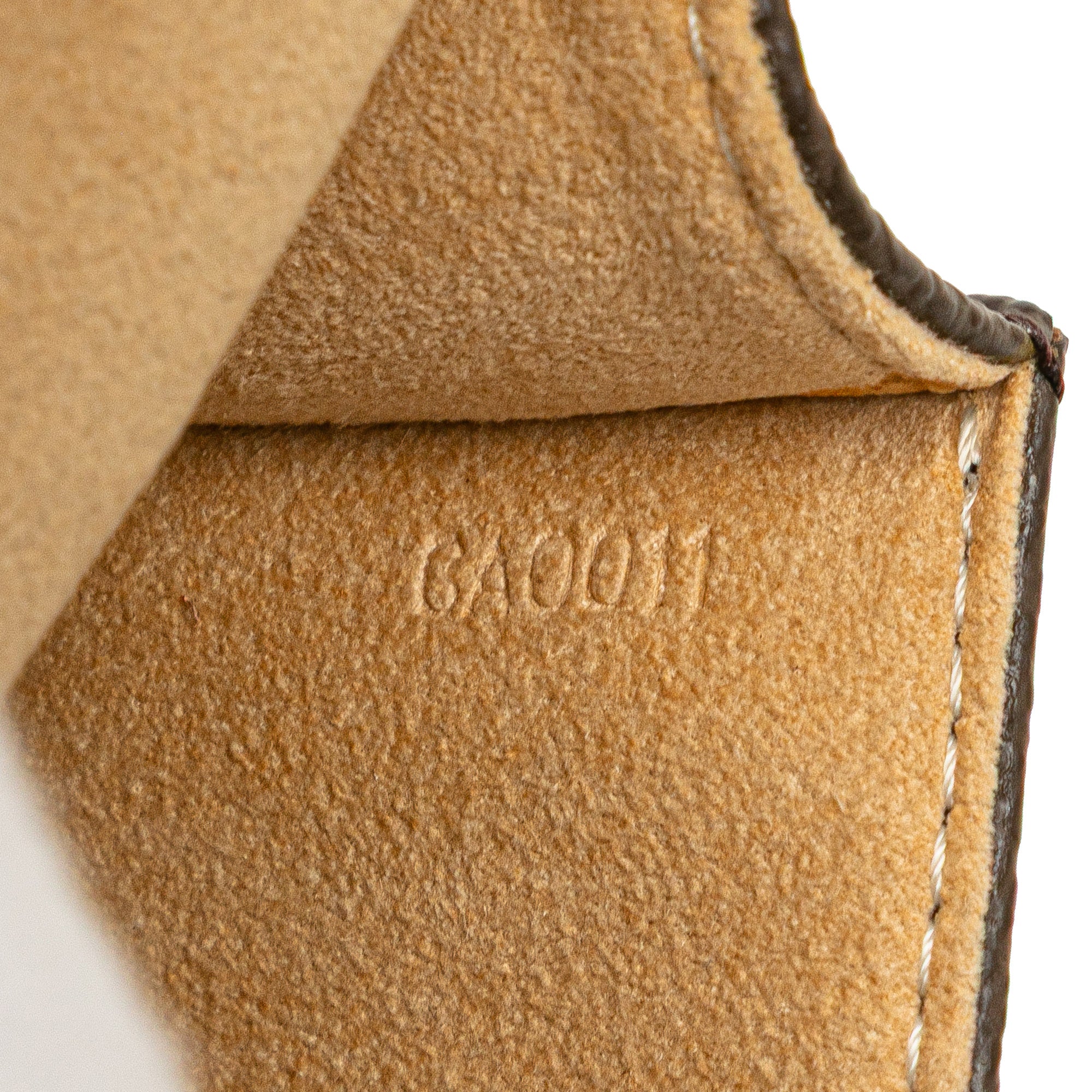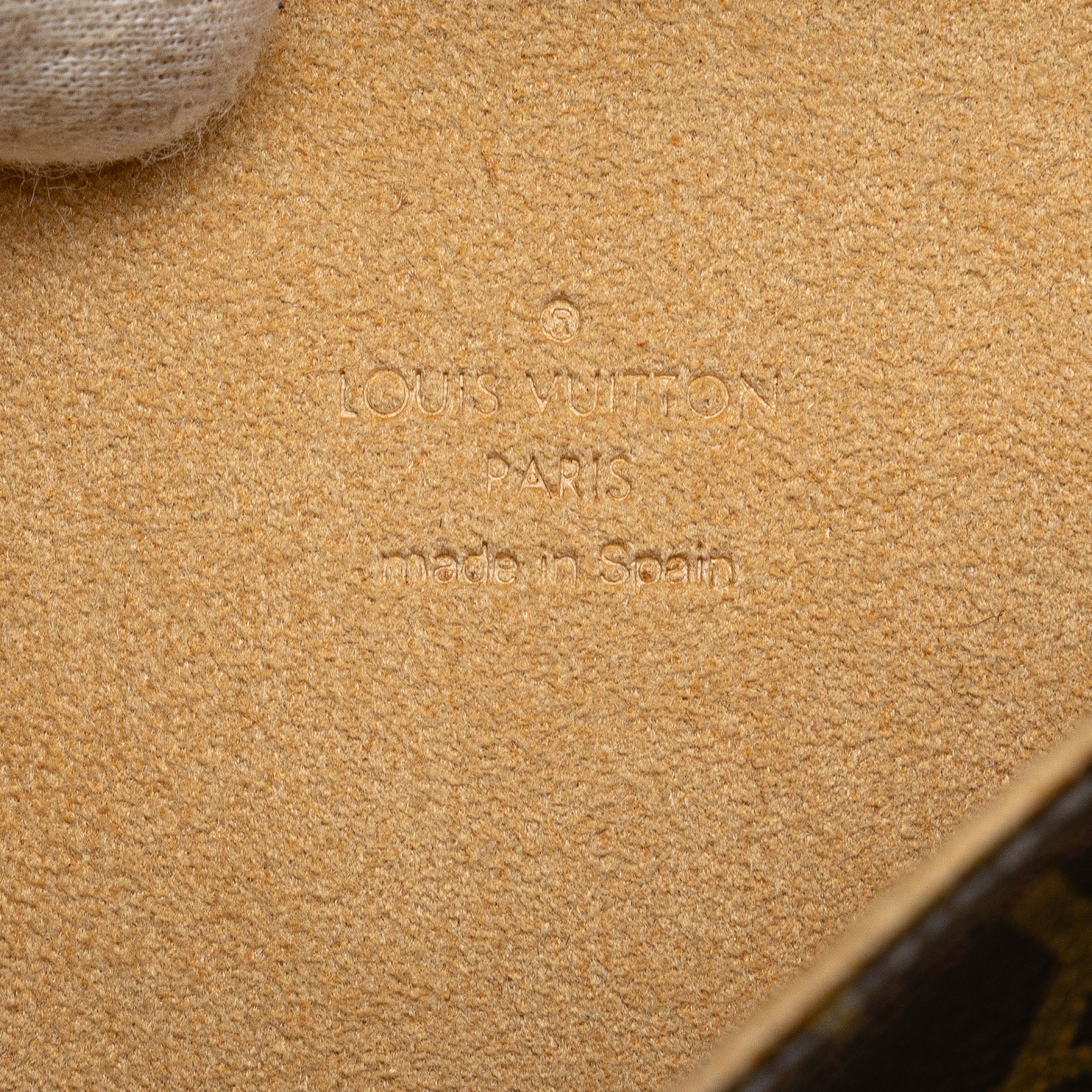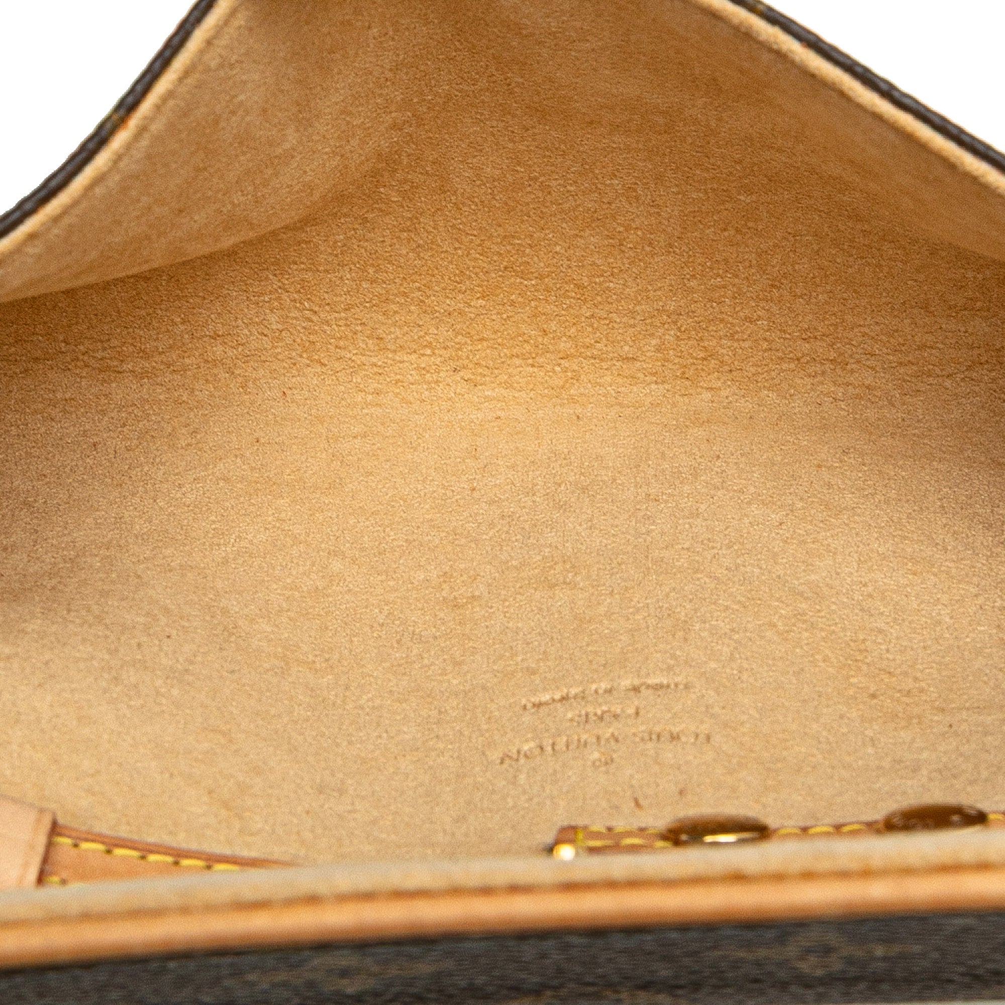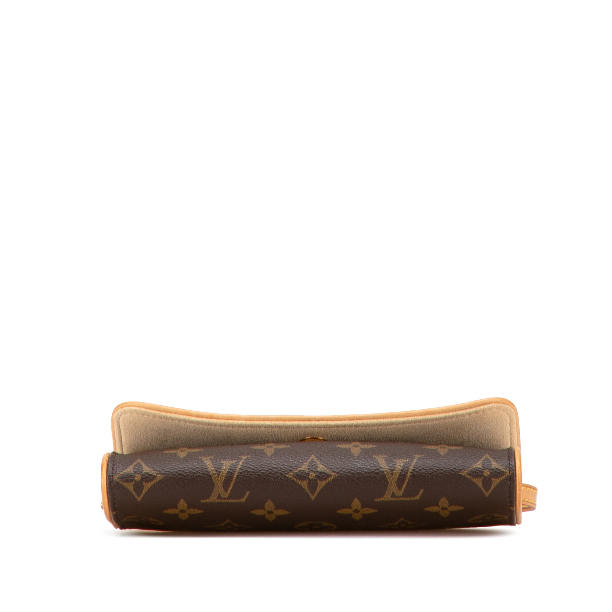 The Pochette Twin PM features a monogram canvas body with vachetta leather trim, a flat vachetta leather shoulder strap, and a front flap with magnetic snap closure. Retail Price: 890.00