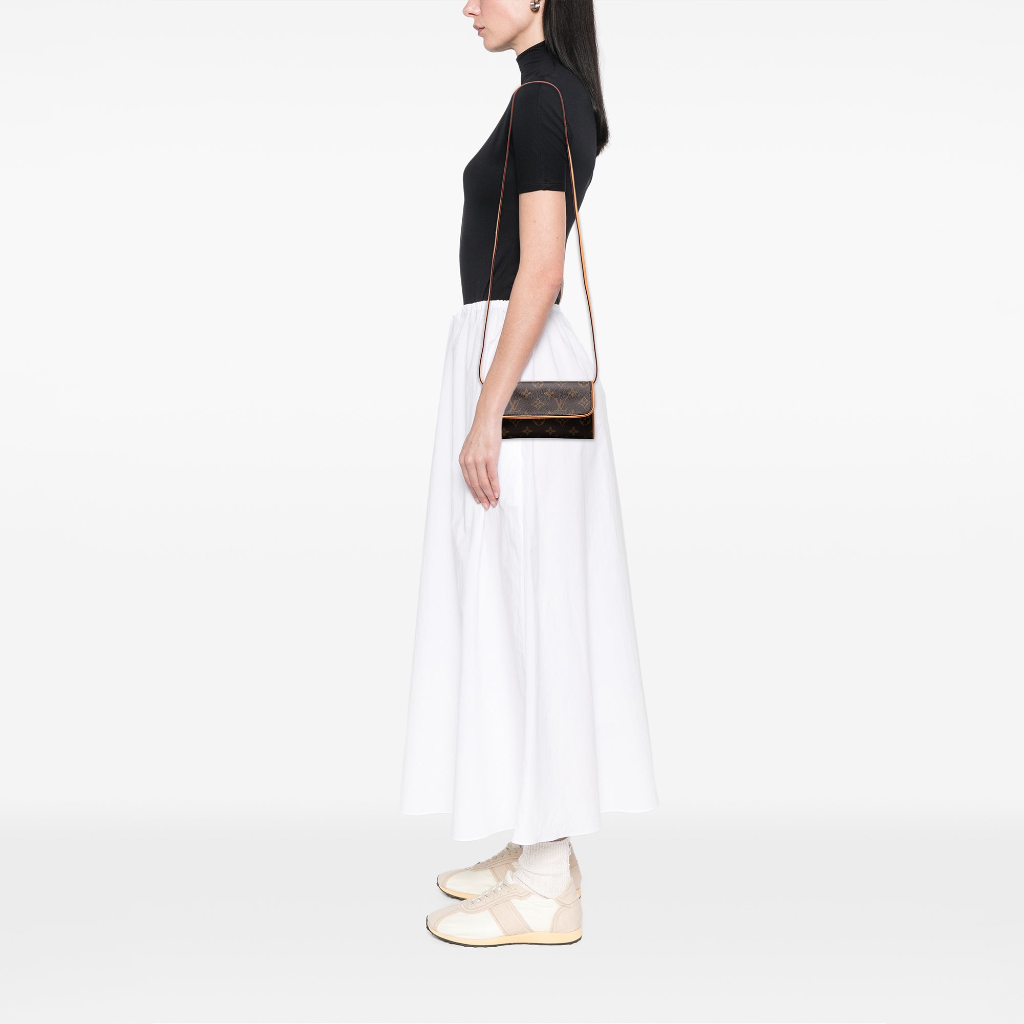 The Pochette Twin PM features a monogram canvas body, a flat vachetta leather shoulder strap, and a front flap with a magnetic closure. Retail Price: 890.00