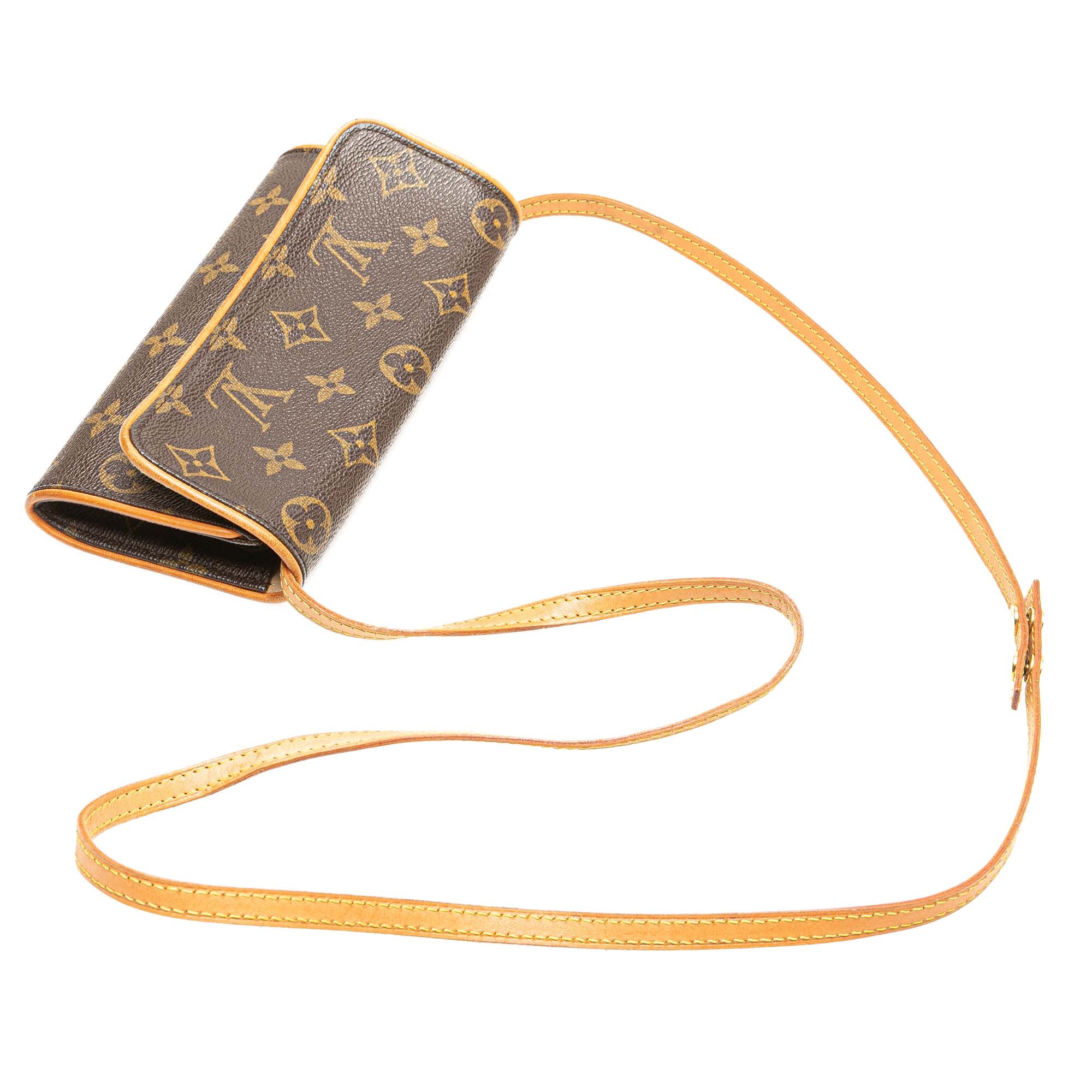 The Pochette Twin PM features a monogram canvas body, a flat vachetta leather shoulder strap, and a front flap with a magnetic closure. Retail Price: 890.00