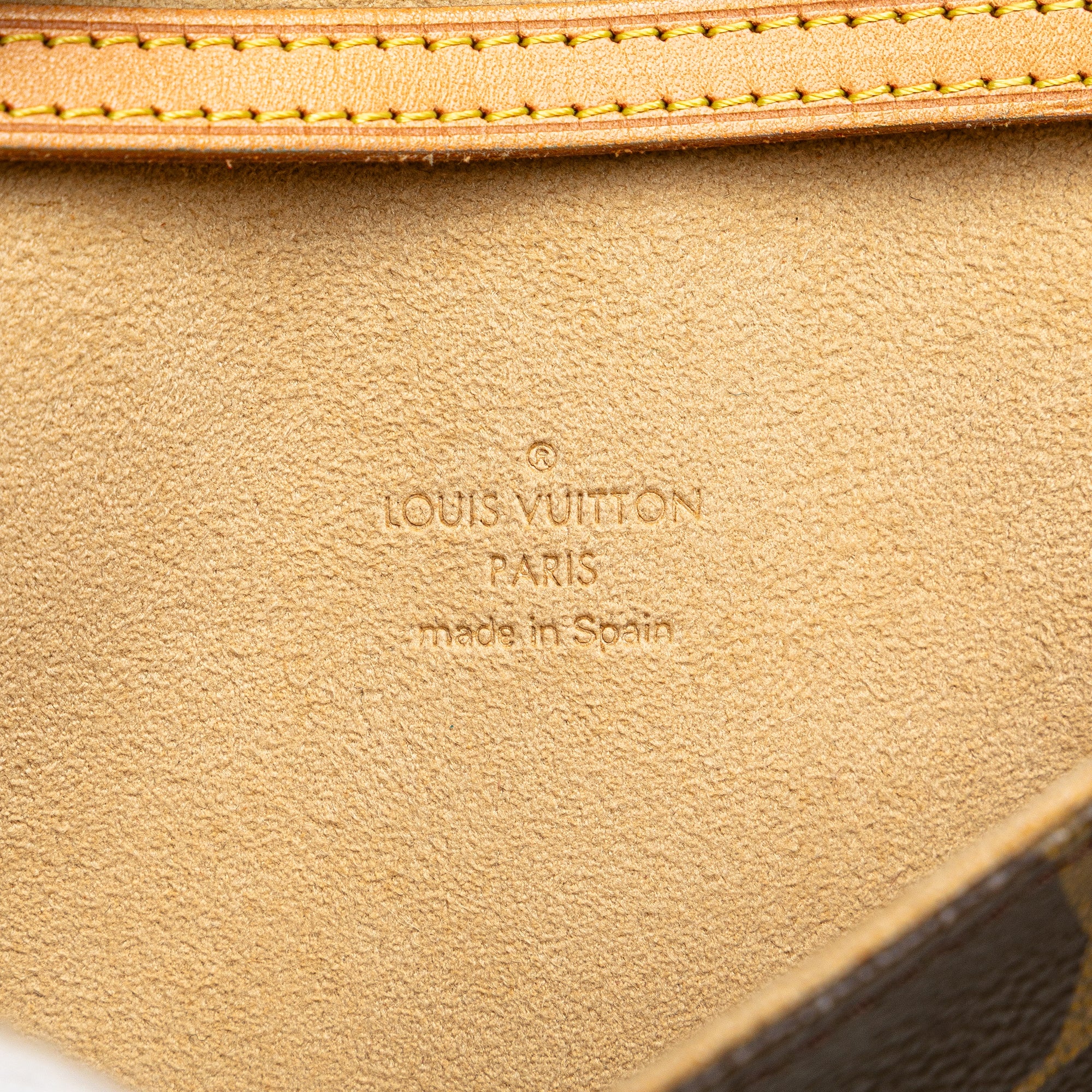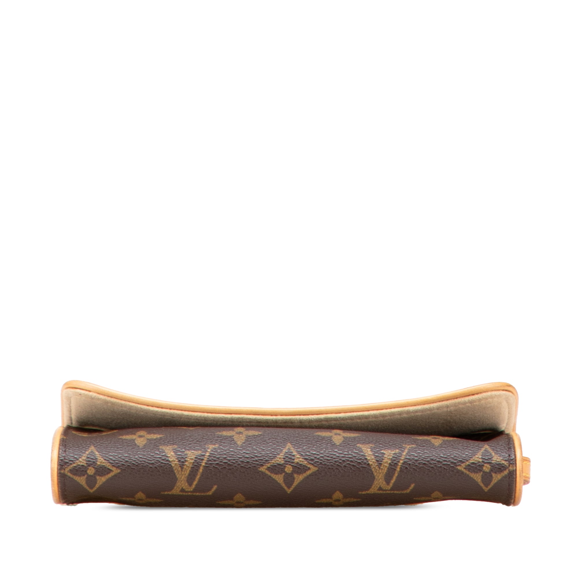 The Pochette Twin PM features a monogram canvas body with vachetta leather trim, a flat vachetta leather shoulder strap, and a front flap with magnetic snap closure. Retail Price: 890.00